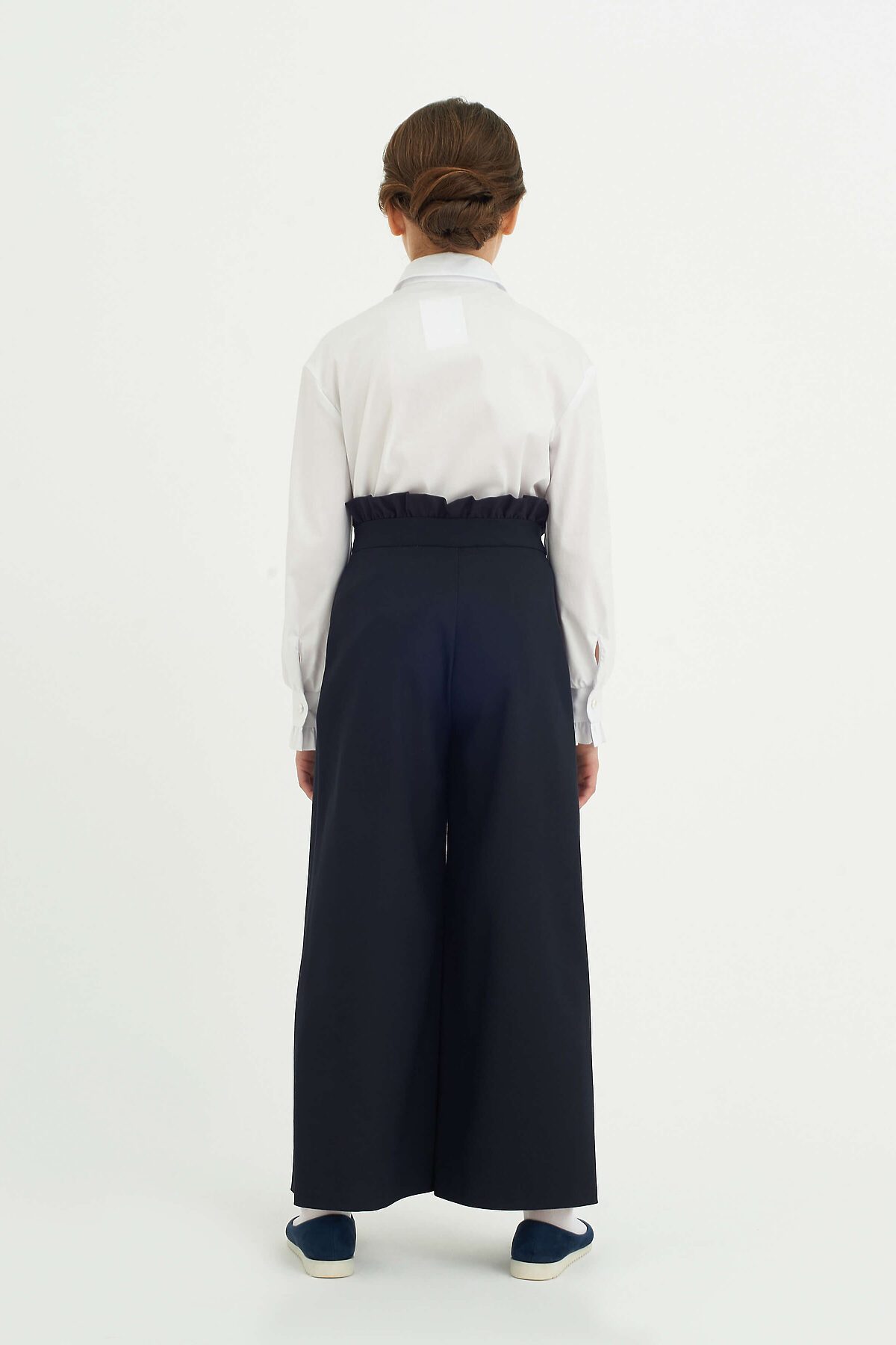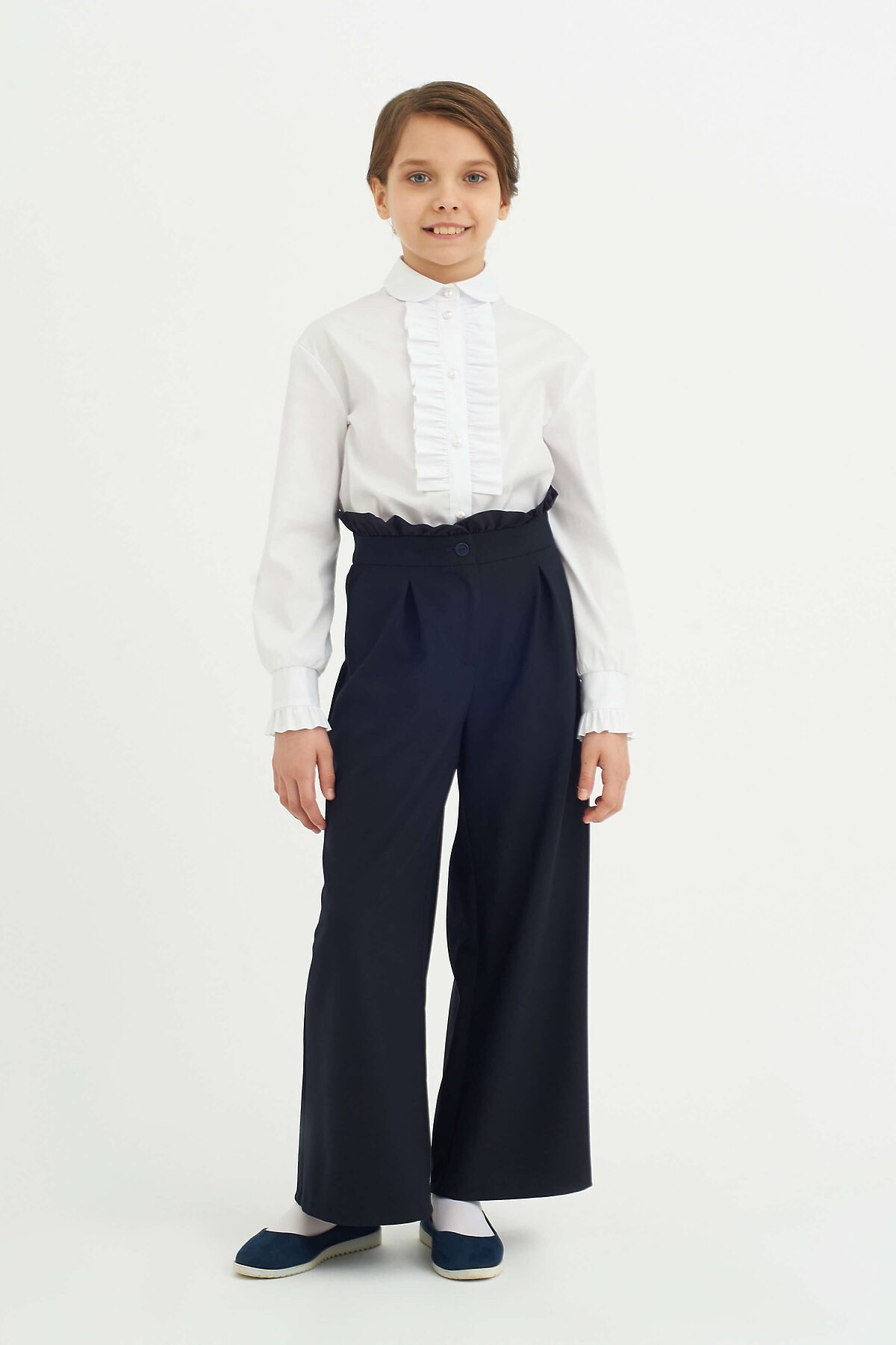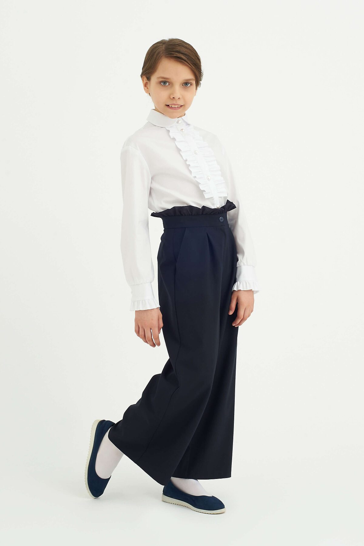 Классическая блузка из смесового хлопка полуприлегающего силуэта с отложным воротником. Длинные спущенные рукава с манжетами, по краю манжет выполнена декоративная оборка. Полочка декорирована оборками по центральной застёжке с пуговицами Высокое содержание хлопка в составе обеспечивает отличную воздухопроницаемость и комфорт в повседневной носке.