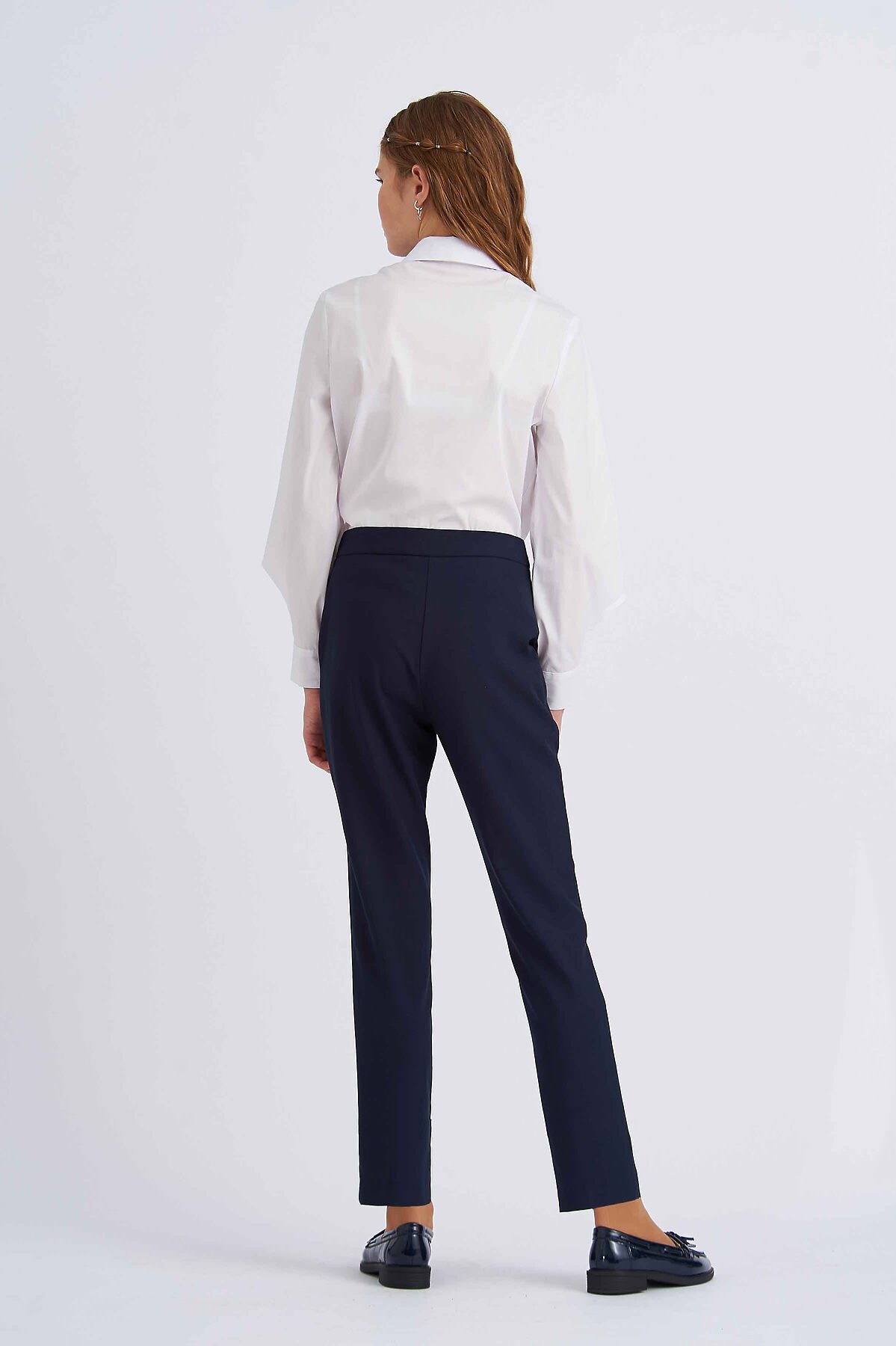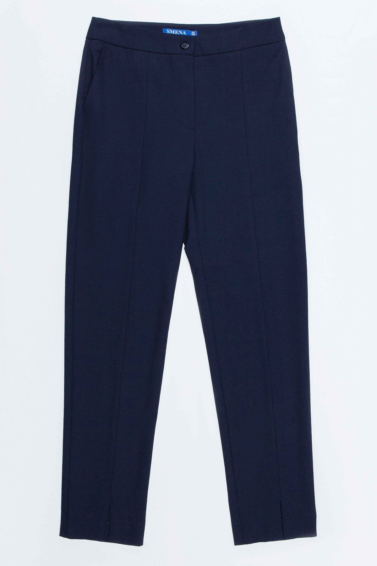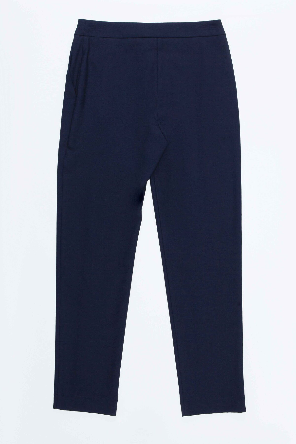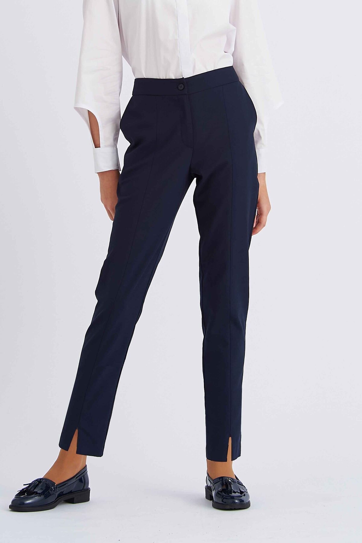 Элегантные, зауженные брюки из костюмной поливискозы с интересной отделкой переда, застроченной стрелки, заканчивающейся небольшим разрезом. Дополнены боковыми карманами.