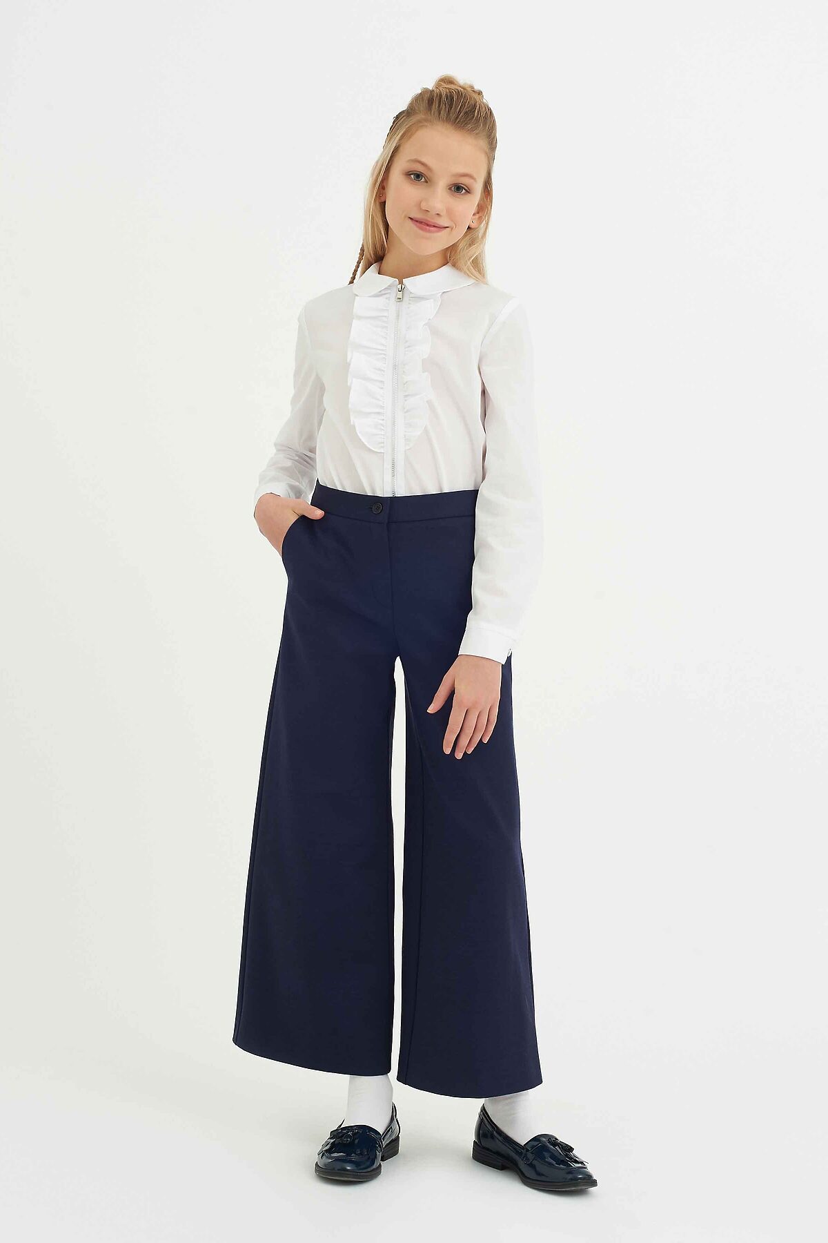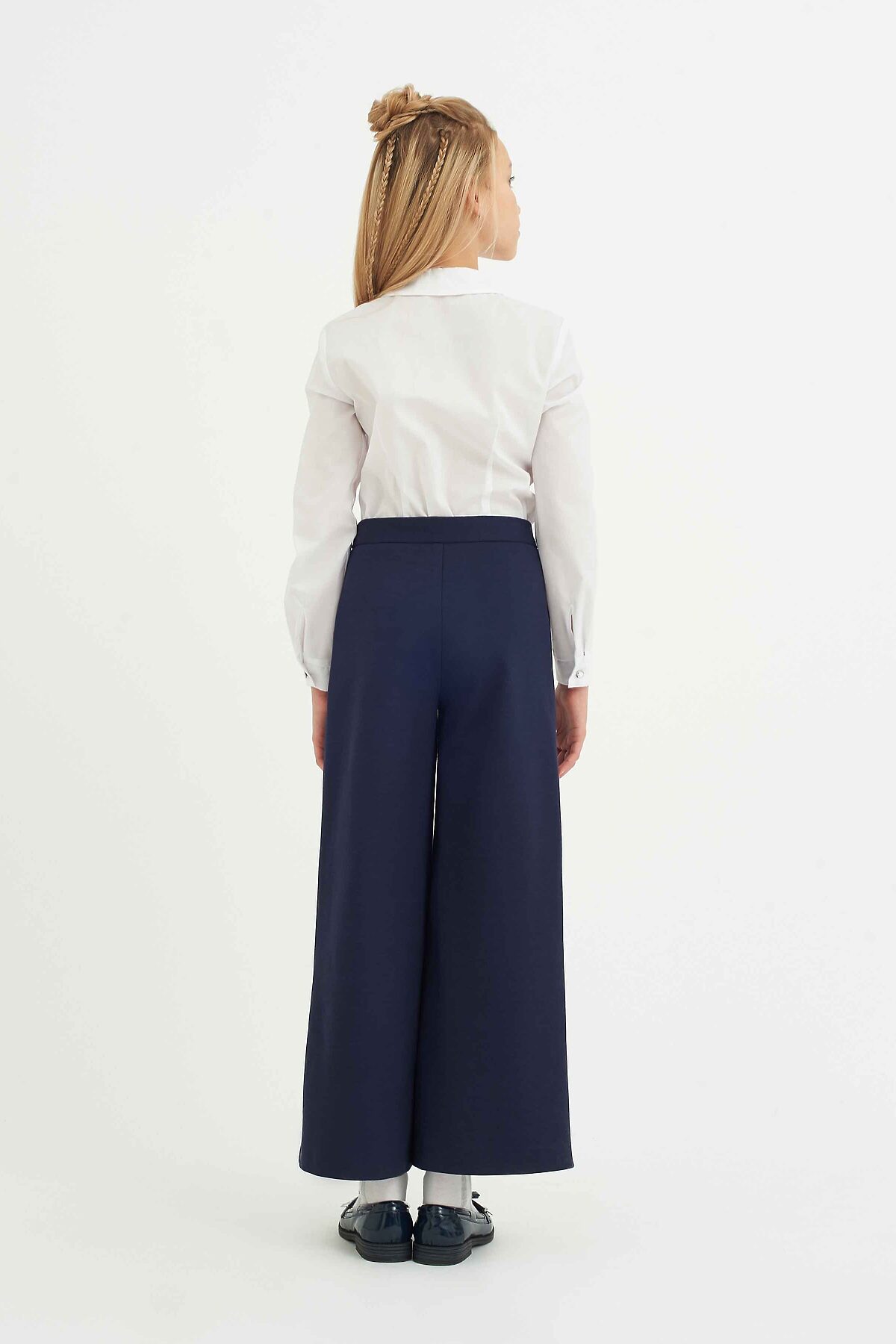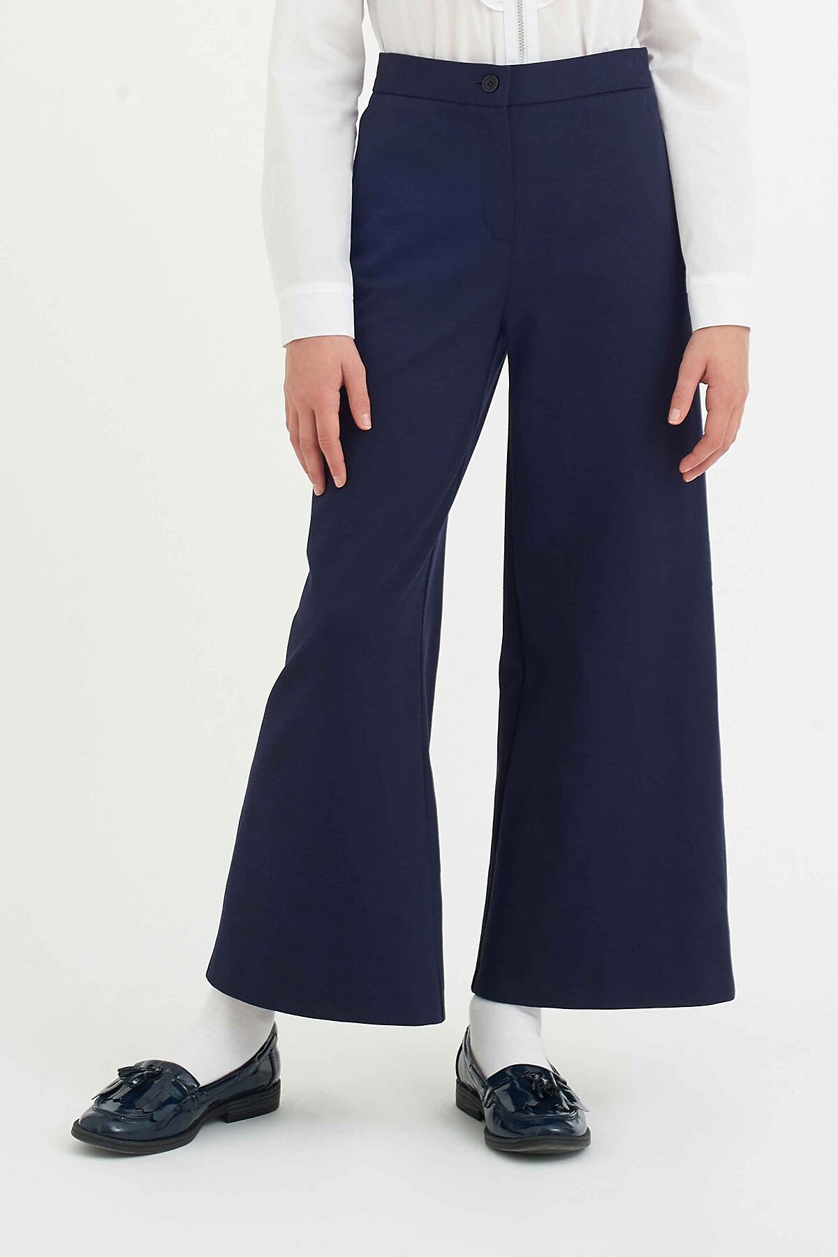 Элегантные брюки-палаццо для девочки из трикотажного полотна с повышенной износостойкостью классического темно-синего цвета, расклешённого силуэта, на поясе с еврорезинкой. Дополнены боковыми карманами. Брюки будут прекрасным дополнением к моделям из школьной коллекций SMENA, отличный вариант на каждый день.