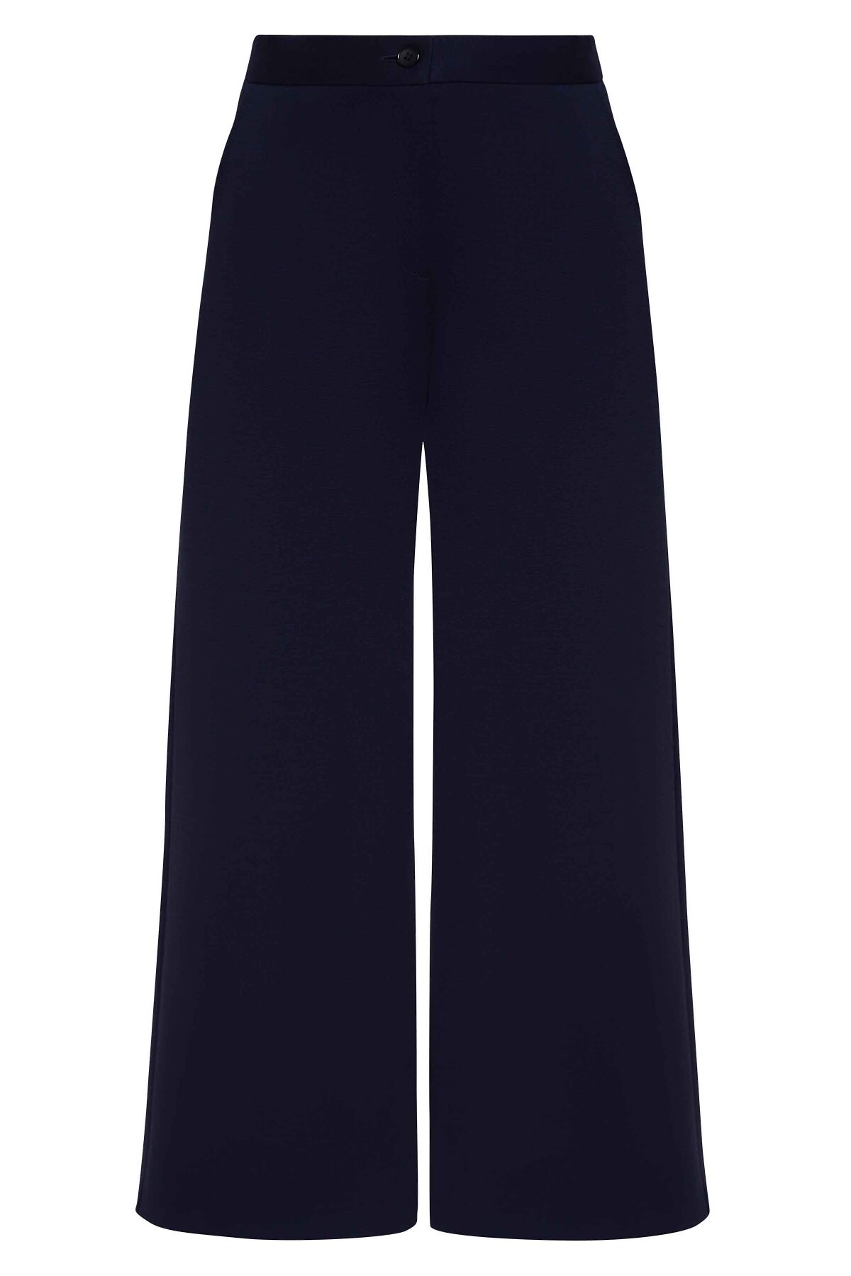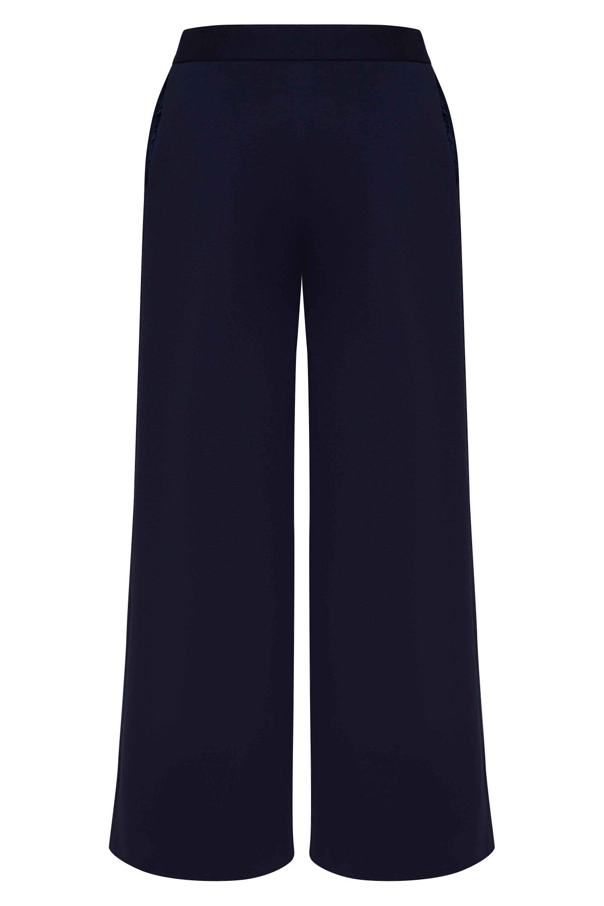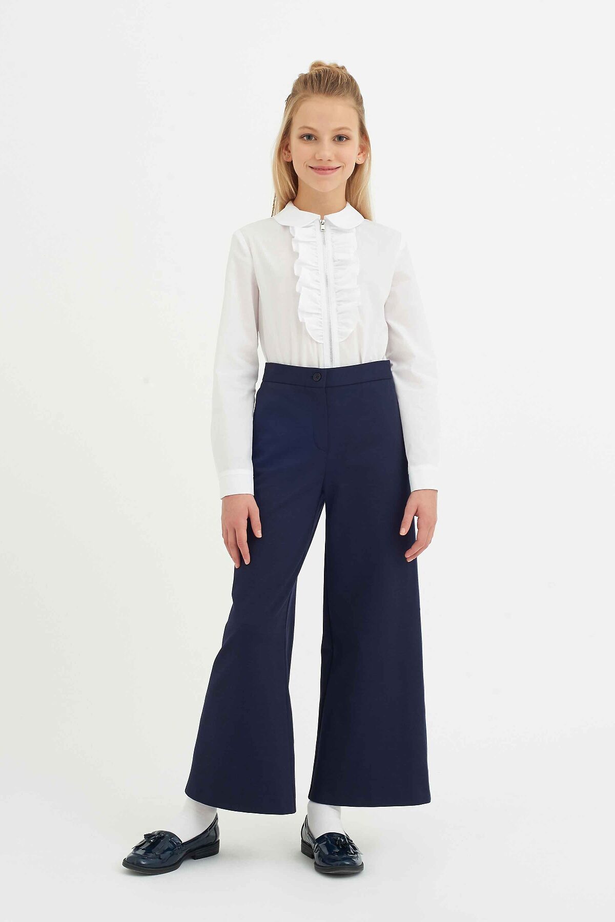 Элегантные брюки-палаццо для девочки из трикотажного полотна с повышенной износостойкостью классического темно-синего цвета, расклешённого силуэта, на поясе с еврорезинкой. Дополнены боковыми карманами. Брюки будут прекрасным дополнением к моделям из школьной коллекций SMENA, отличный вариант на каждый день.