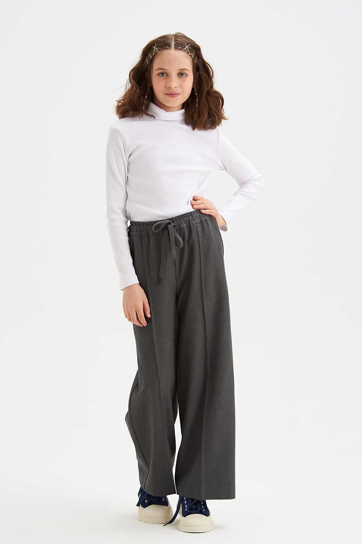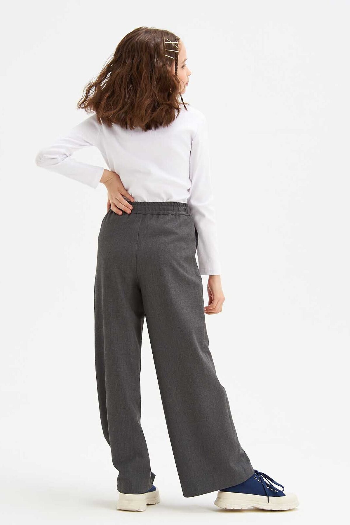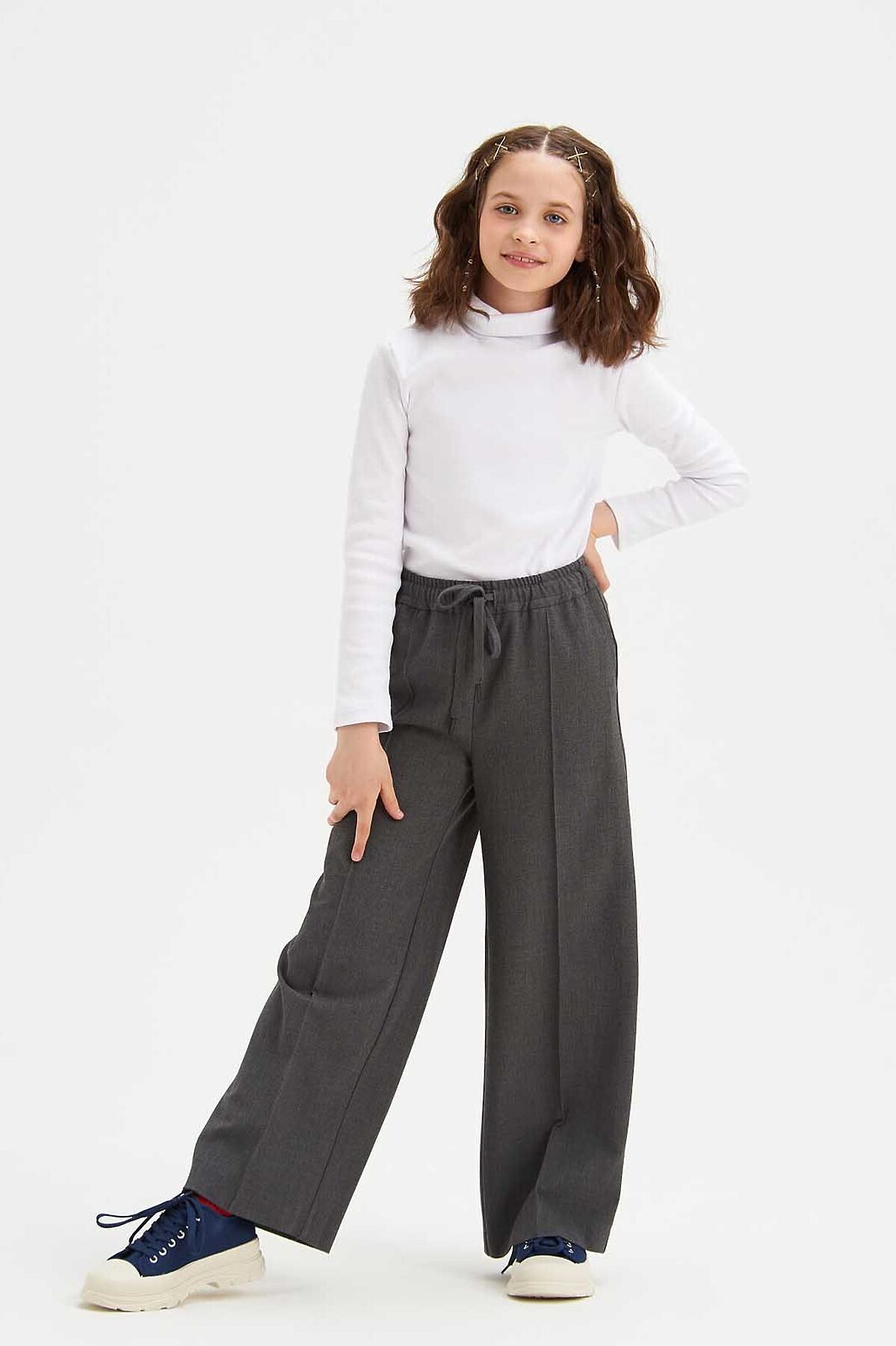 Брюки палаццо для девочек изготовлены из немнущейся костюмной ткани высокого качества, которая идеально подходит для брюк данного фасона. Расширяющийся от пояса силуэт, высокая талия и пояс на резинке не стесняют движений. Брюки имеют карманы достаточной глубины. Брюки палаццо элегантно смотрятся на девочках любого роста.
