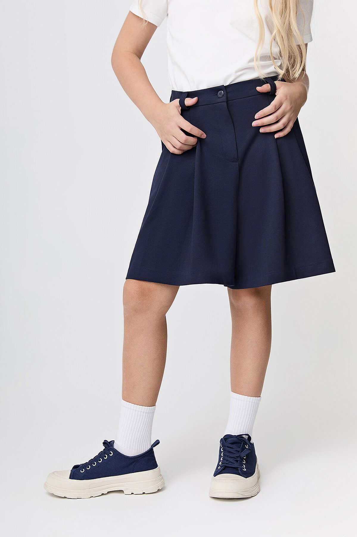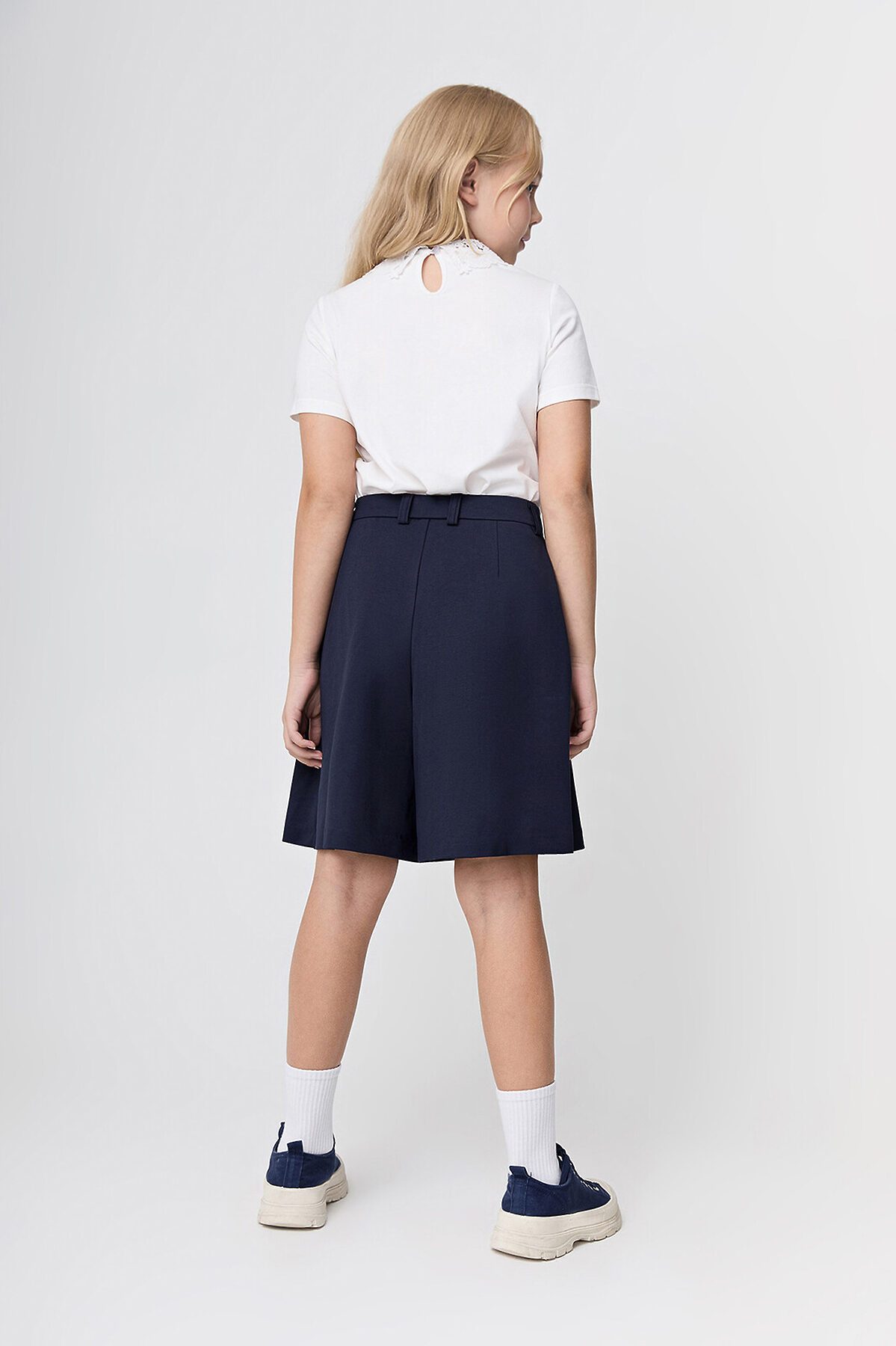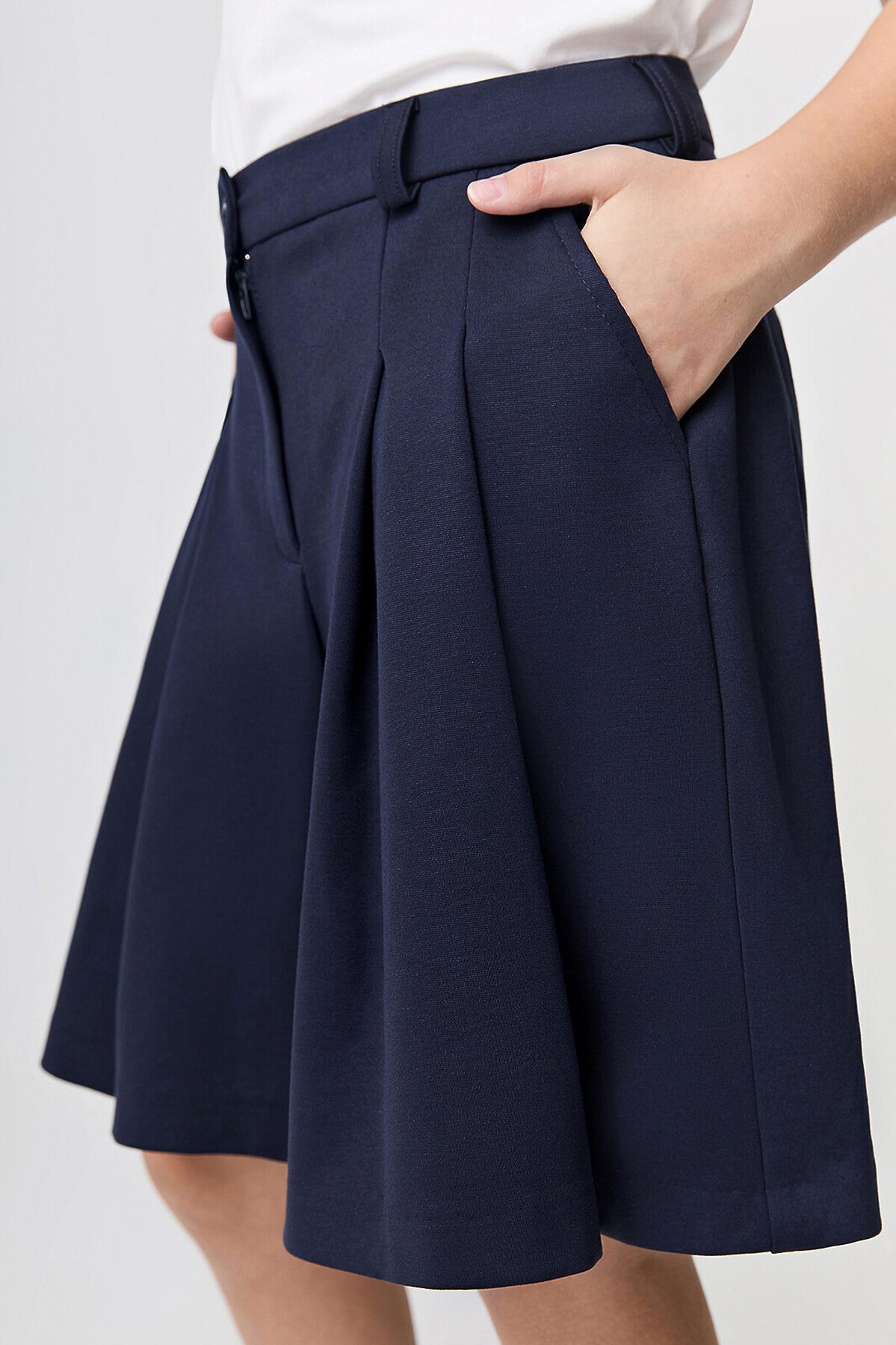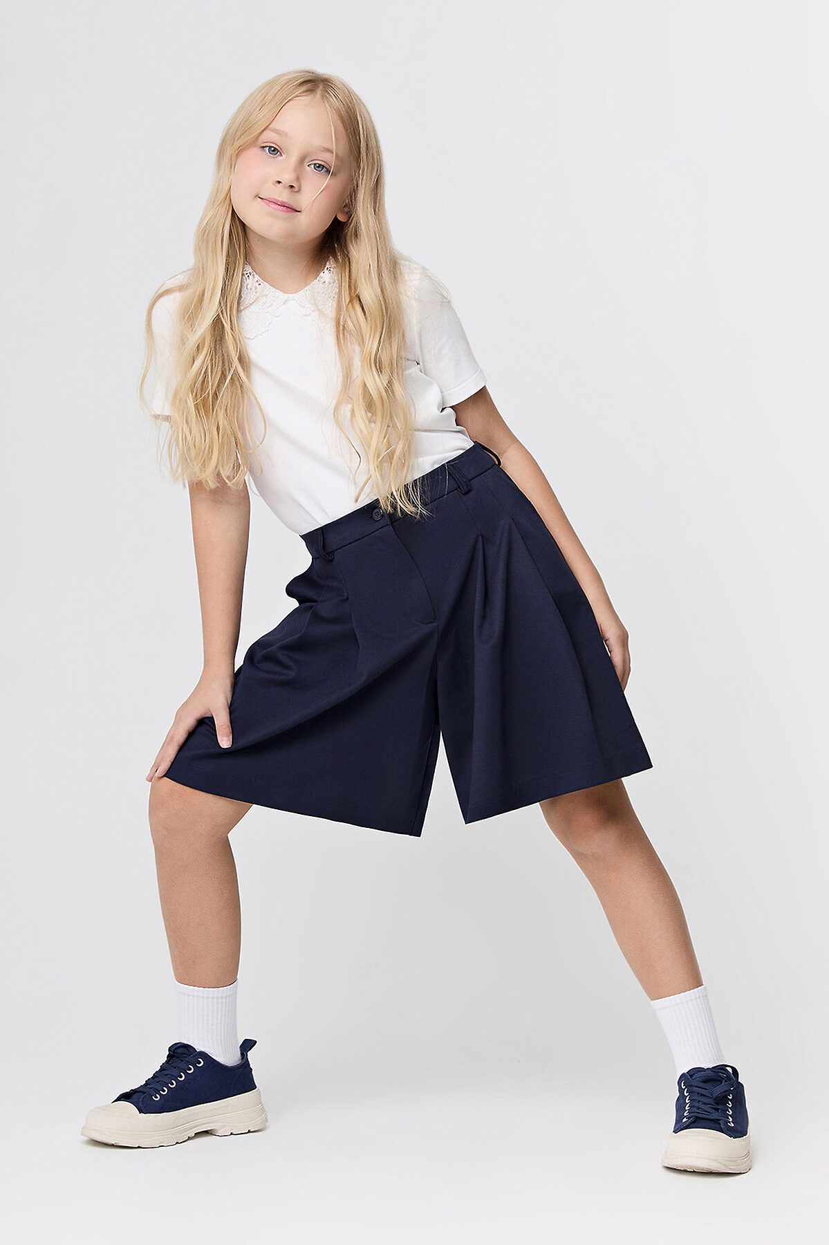Трикотажные шорты со стрелками для девочек.Застежка на молнию, петлю и пуговицу. По бокам функциональные карманы. Внутрь задней части пояса вложена евро-резинка, регулируемая пуговицами.