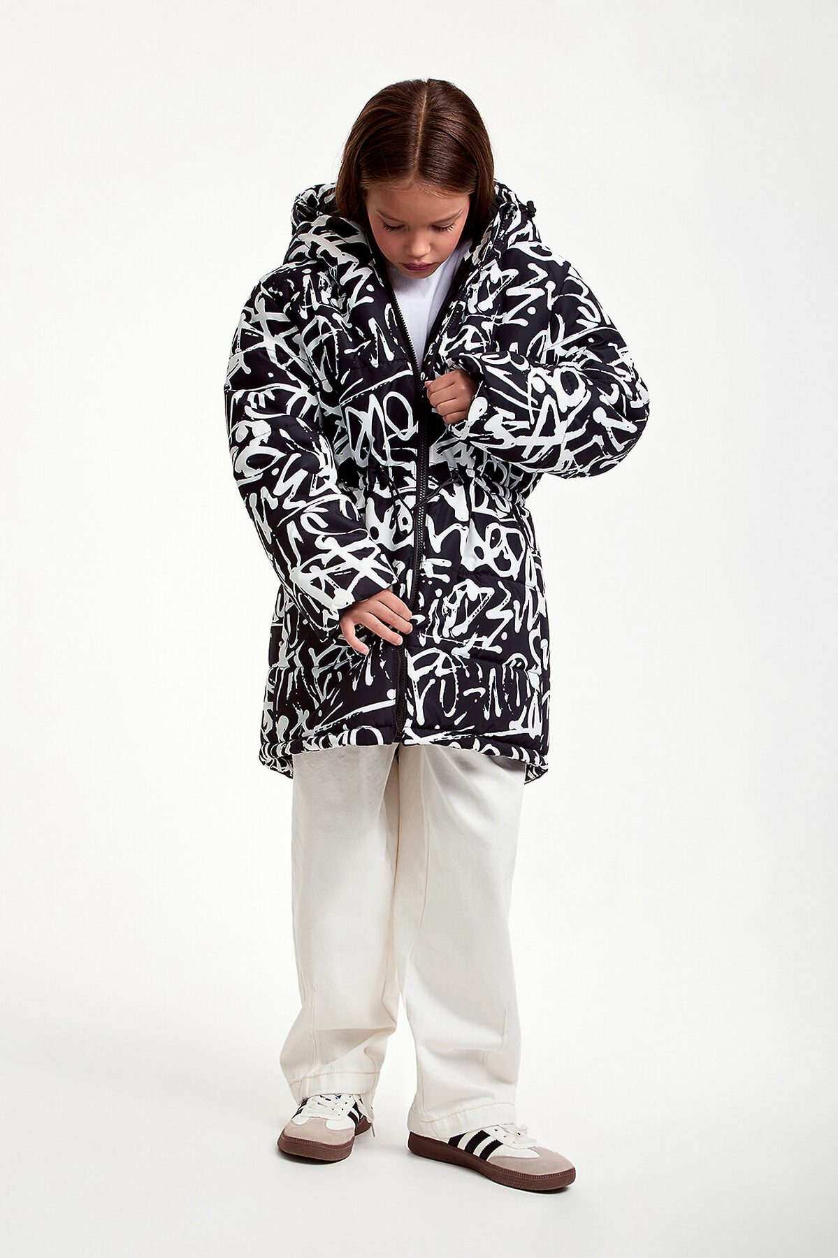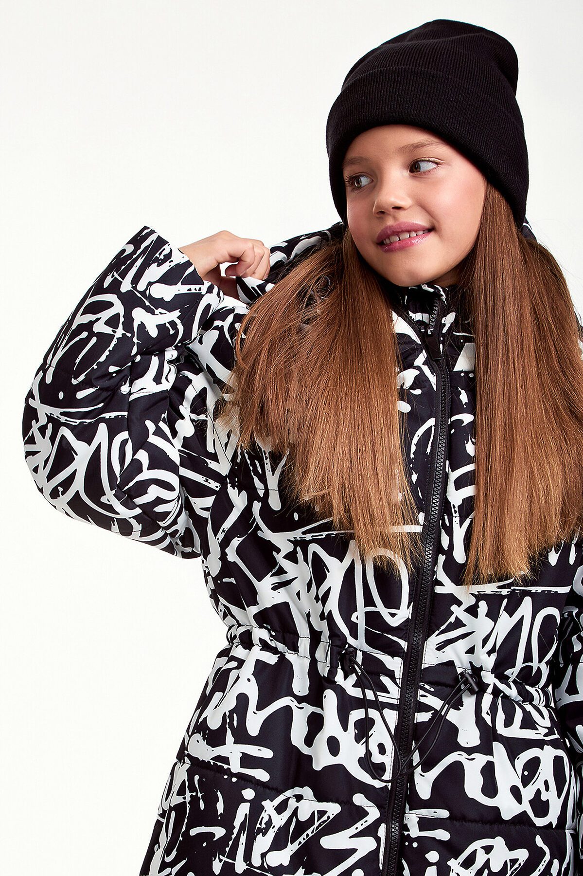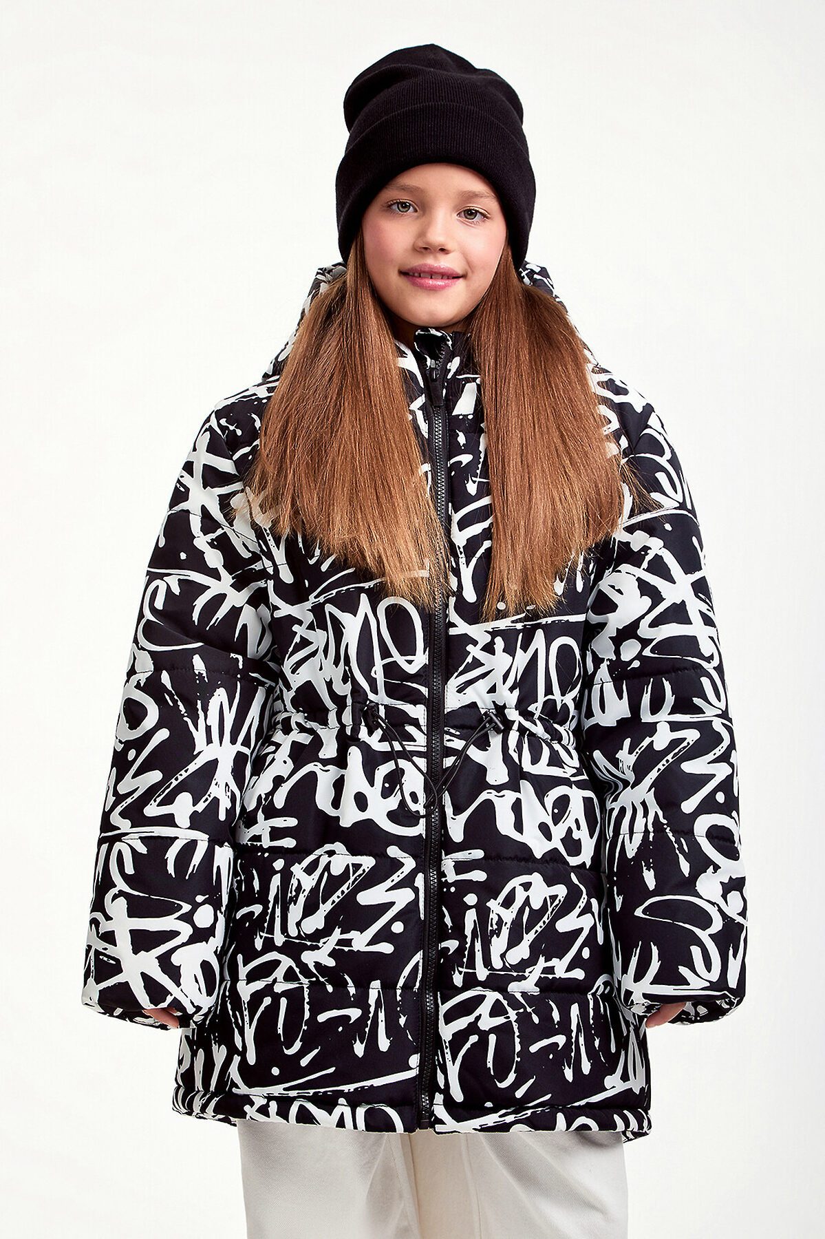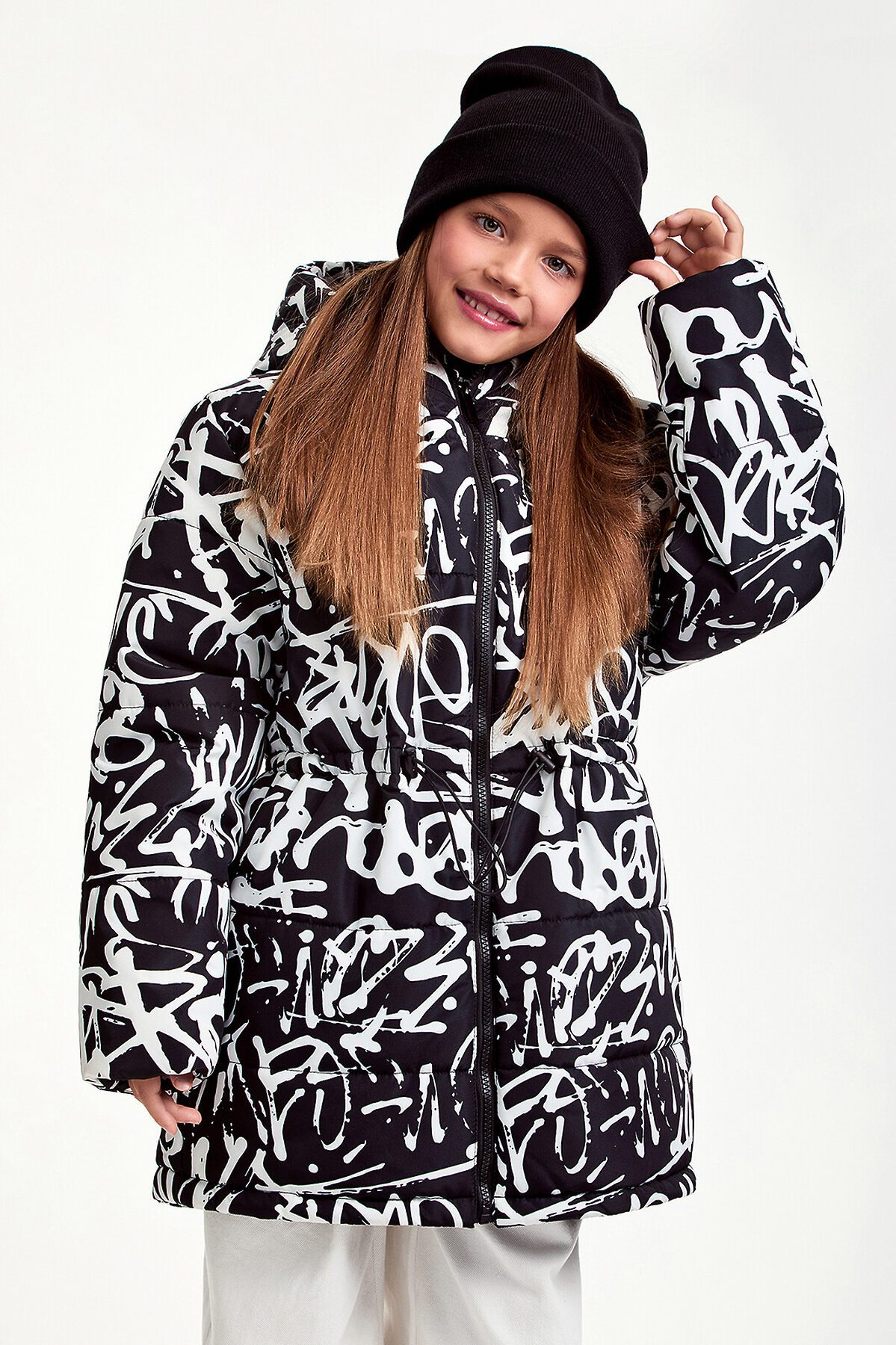 Зимняя удлиненная куртка для девочки прямого силуэта. Куртка изготовлена из плотного материала с водонепроницаемым мембранным покрытием и ветрозащитой. Утеплитель пластовой синтепон 280 гр/м2.Такое утепление подойдет на сильные морозы до -30 градусов. Дополнена несъемным капюшоном, боковыми глубокими карманами на молнии. Выделяется ярким, притягивающим взгляд, принтом.