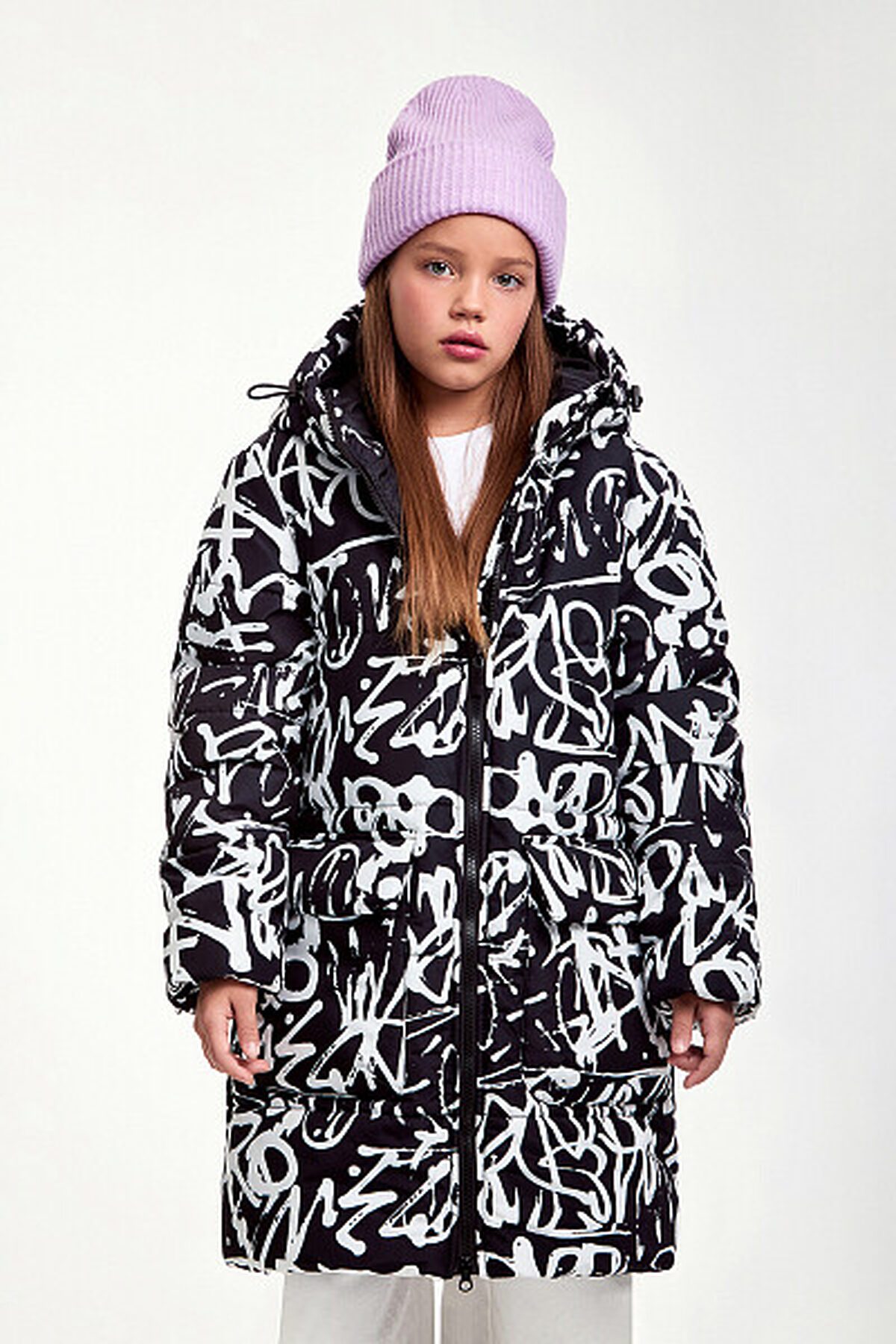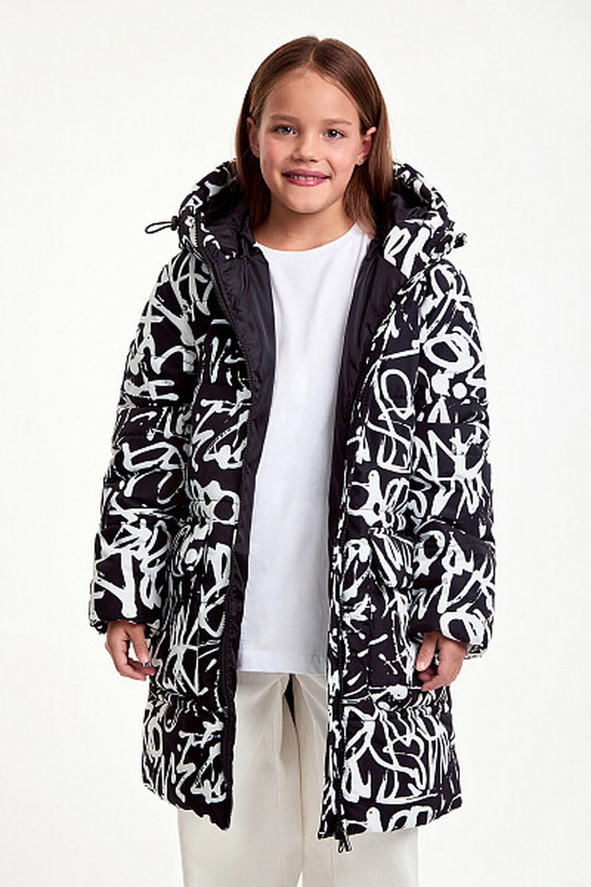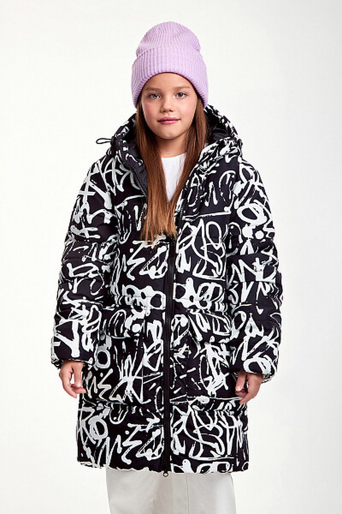 Зимняя удлиненная куртка для девочки прямого силуэта. Куртка изготовлена из плотного материала с водонепроницаемым мембранным покрытием и ветрозащитой. Утеплитель пластовой синтепон 280 гр/м2. Такое утепление подойдет на сильные морозы до -30 градусов. Дополнена несъемным капюшоном, боковыми глубокими карманами на молнии. Выделяется ярким, притягивающим взгляд, принтом.