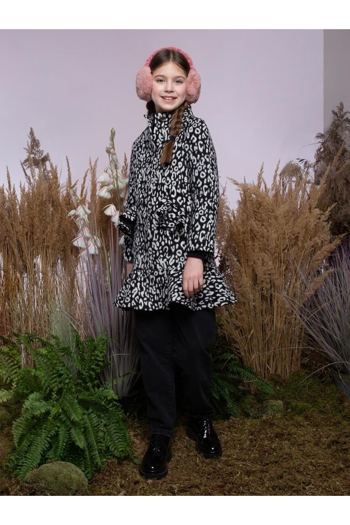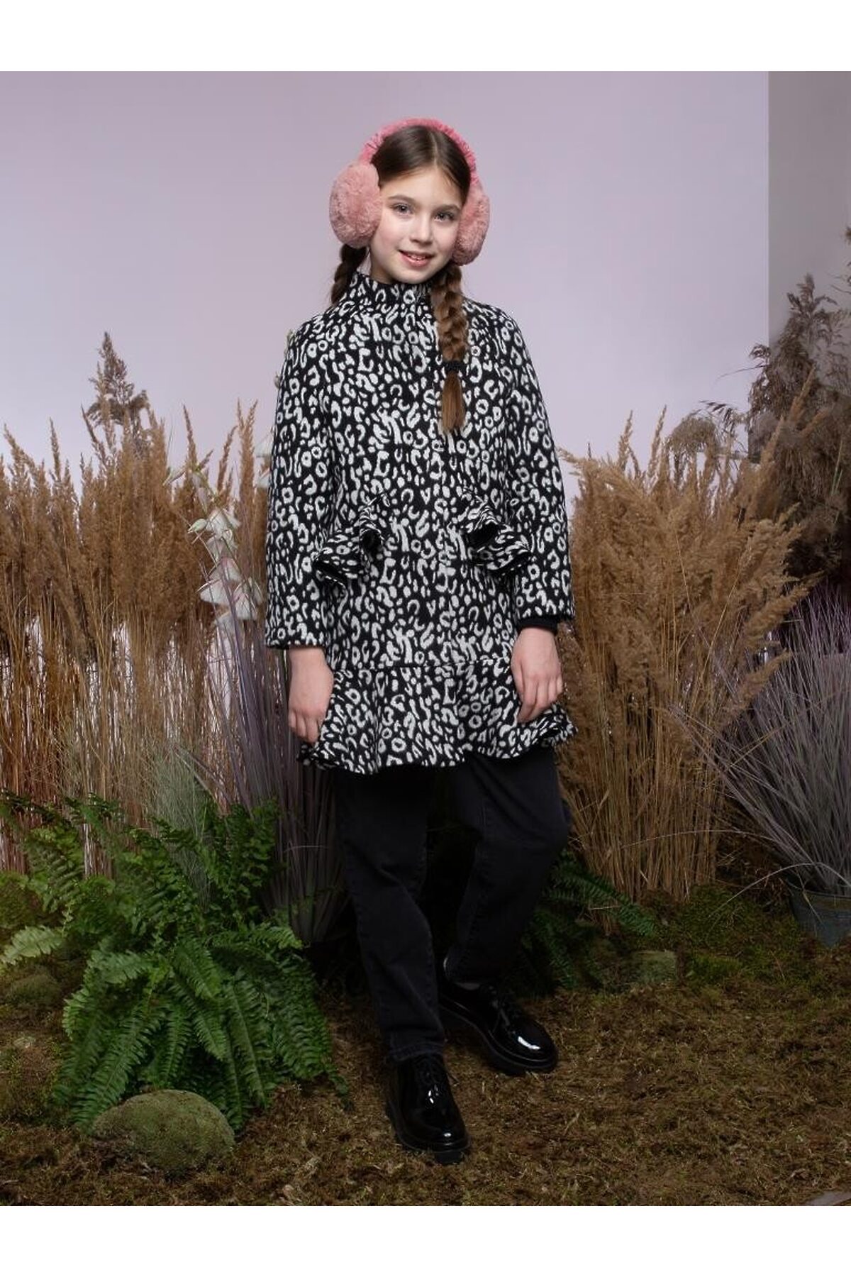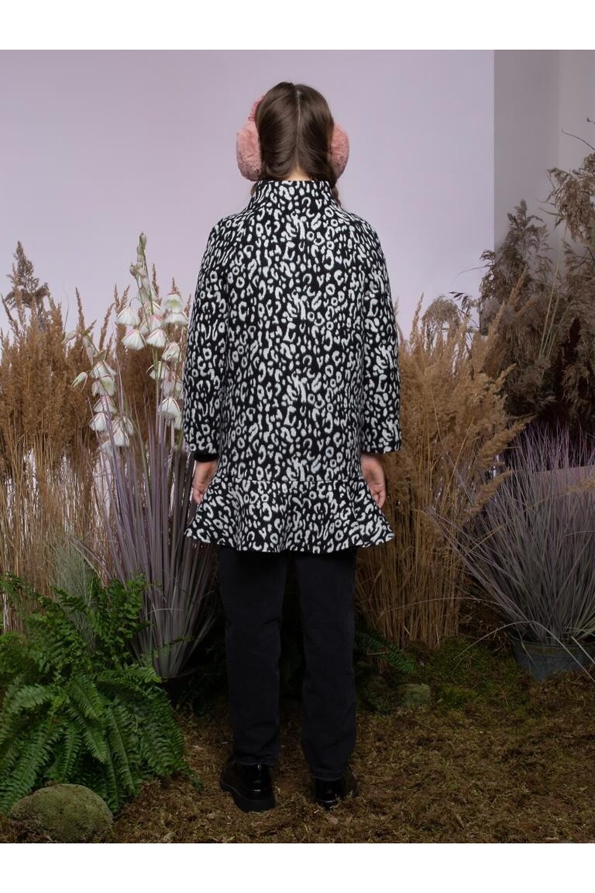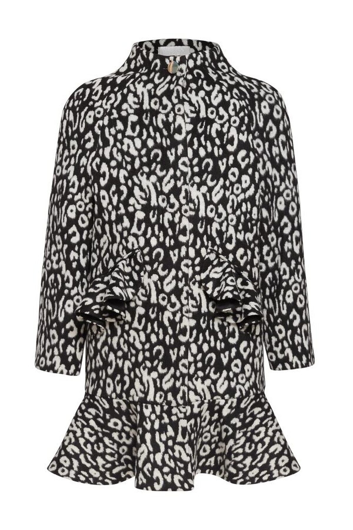 Изысканное драповое пальто силуэта кокон с рукавами реглан и цельнокроеной стойкой. Прорезные карманы с клапанами-воланами, расположенные на полочках, а также волан из основной ткани по низу изделия являются основными яркими деталями образа. Потайная застежка на пластиковые пуговицы придает изделию премиальный вид.