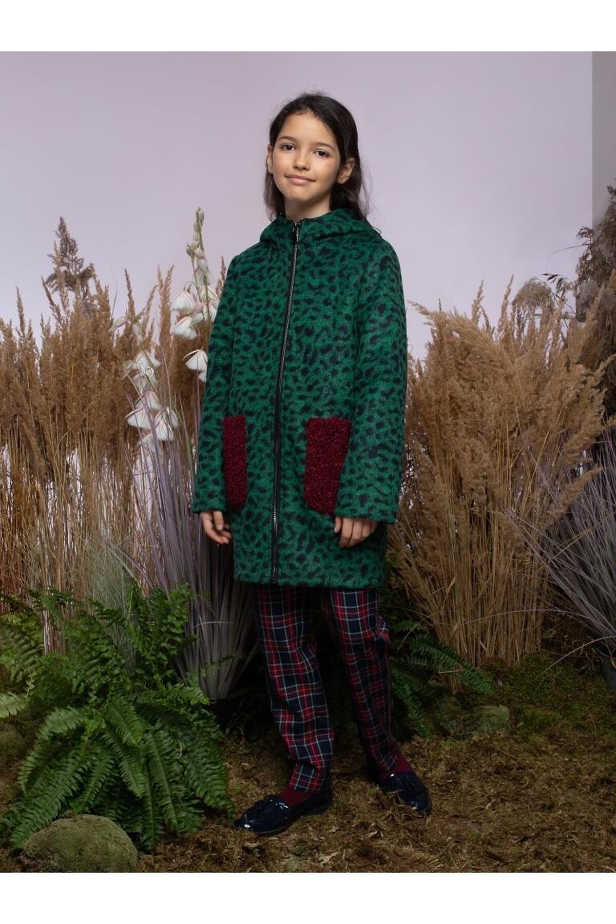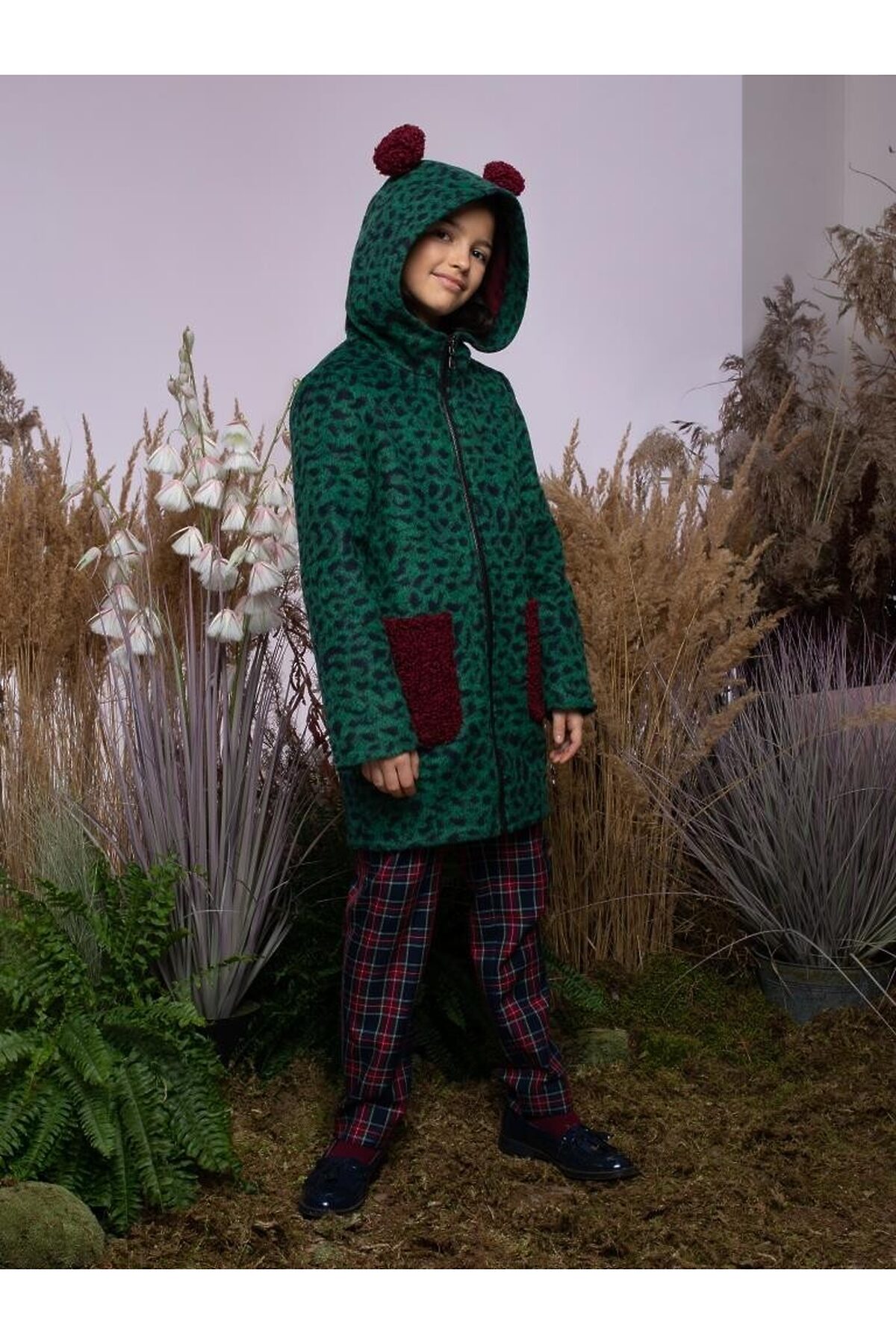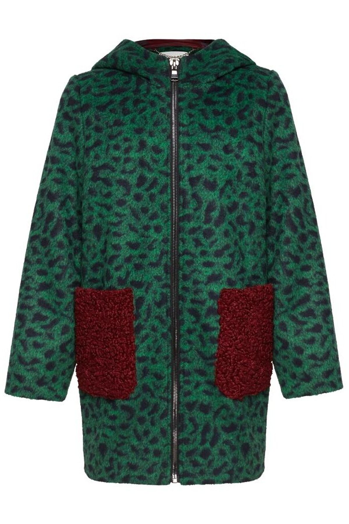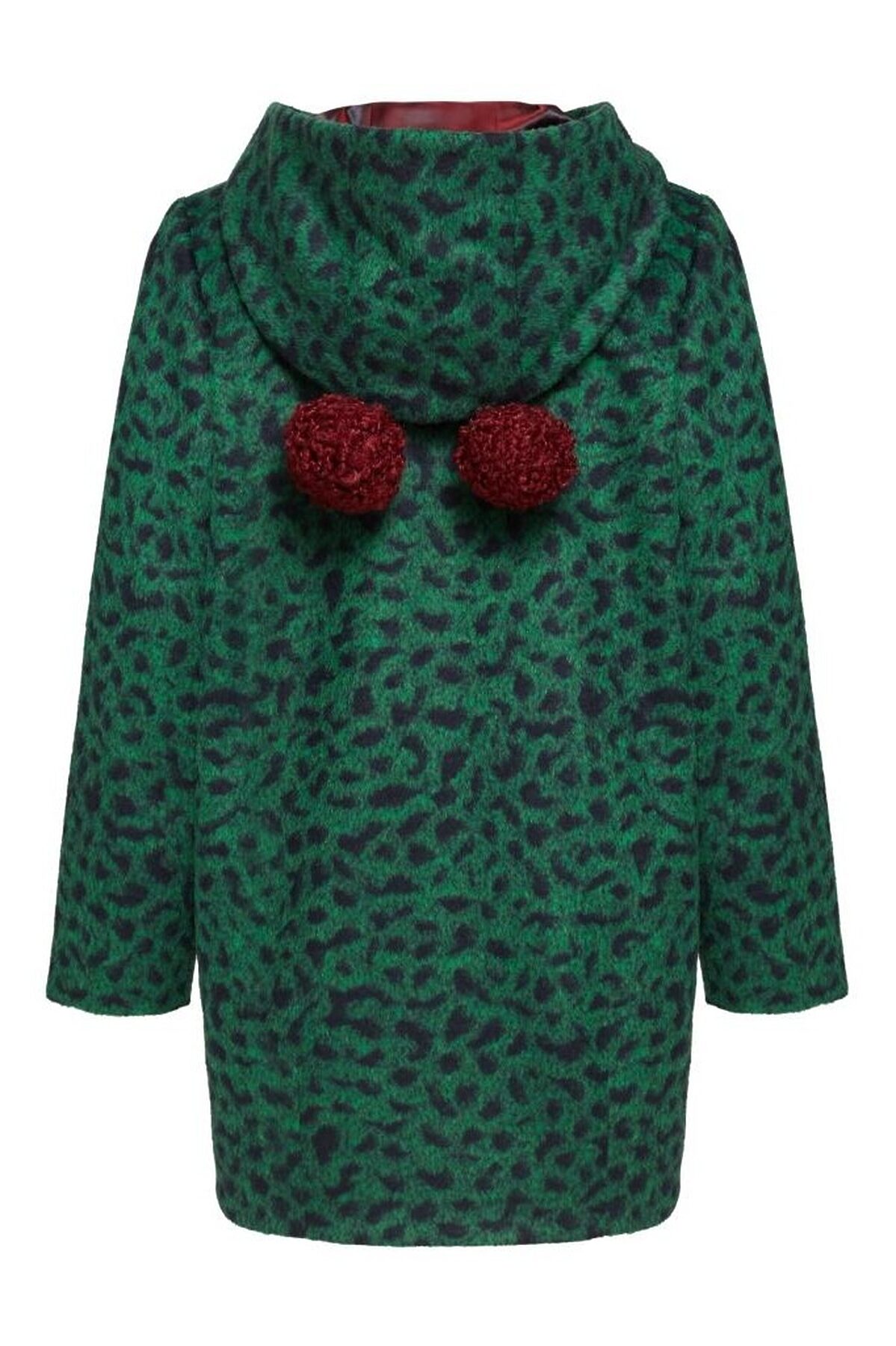 Супер модное пальто прямого силуэта с капюшоном декоррированым съемными помпонами. Накладные карманы из искусственного меха контрасного цвета, расположенные на полочках, являются основной яркой деталью образа. Прямая застежка на молнию по всей длине зрительно вытягивает силуэт.