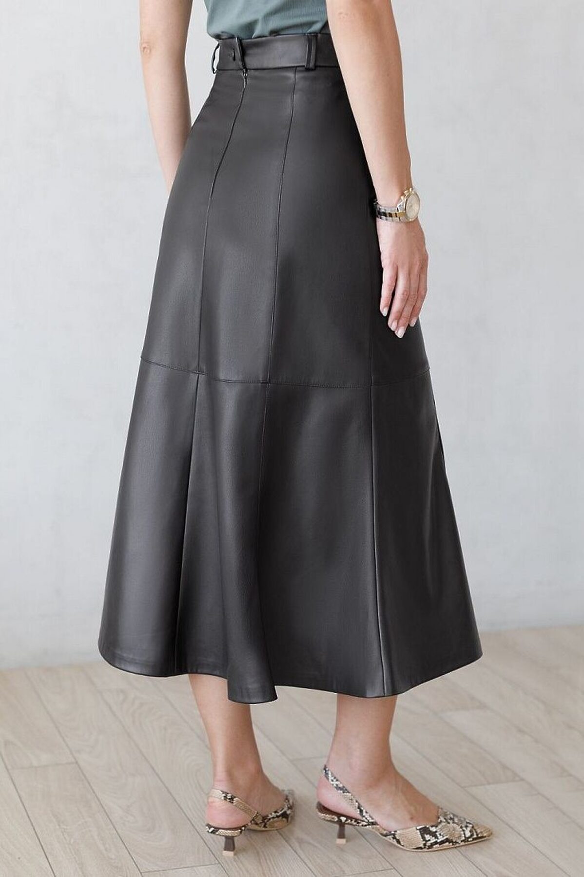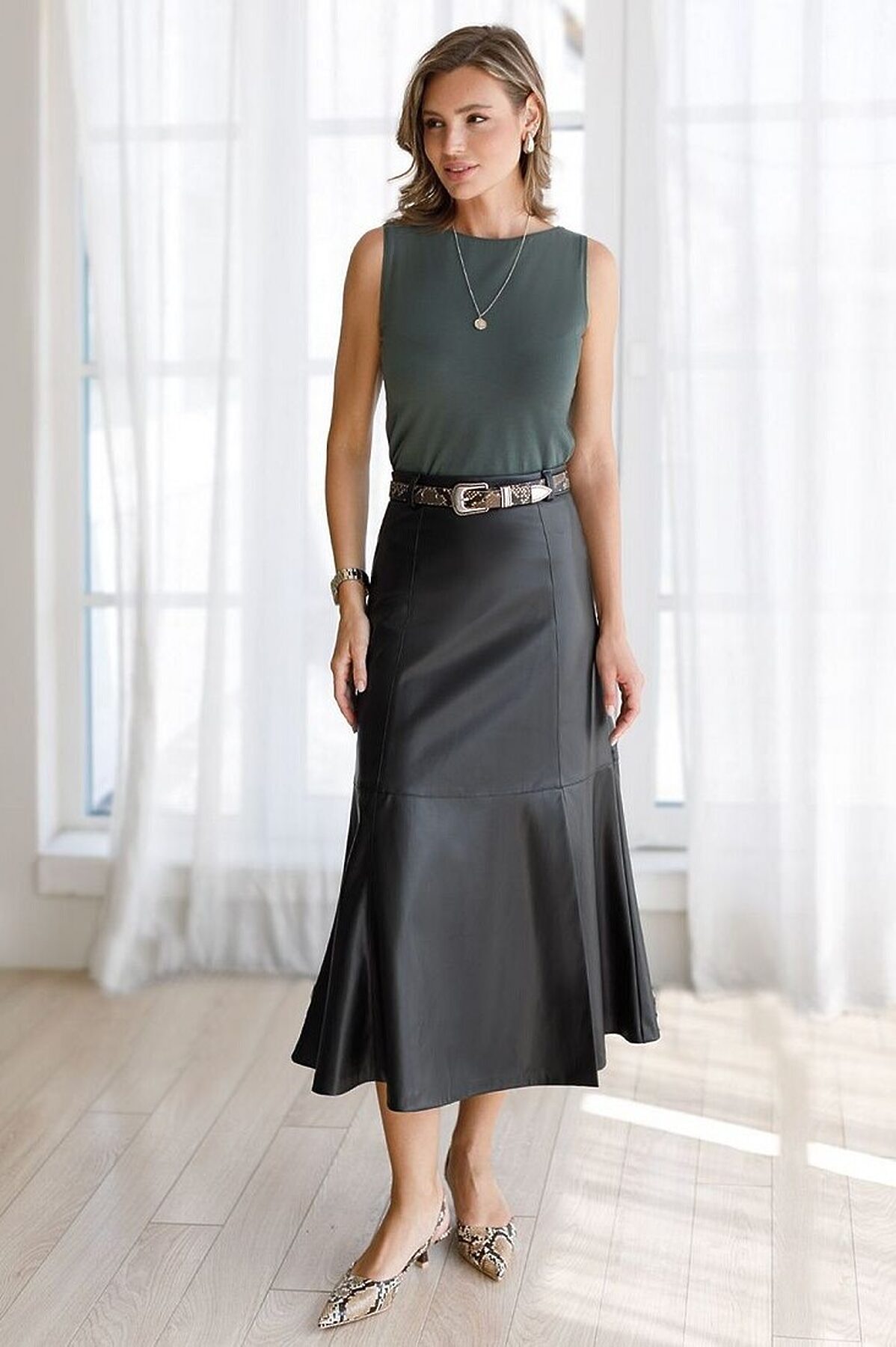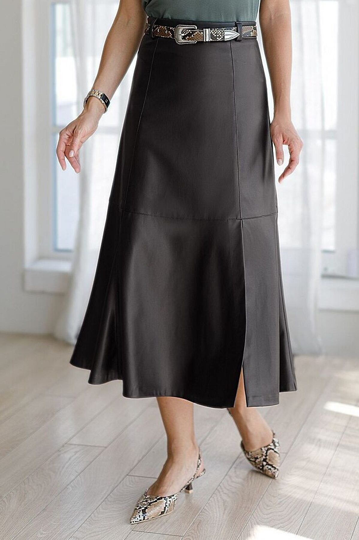 Стильное решение для смелых и уверенных образов. Юбка черного цвета, свободного кроя с плавные волнами на ткани, создает эффектный силуэт, подчеркивая женственность и динамику движения. Пояс стандартной ширины с обтачкой из мягкой изнанки обеспечивает комфорт при носке, не сковывая движений. Небольшой разрез до колена добавляет лёгкую дерзость и удобство при ходьбе. Качественная искусственная кожа придает юбке благородный блеск и износостойкость, сохраняя при этом легкость и эластичность.