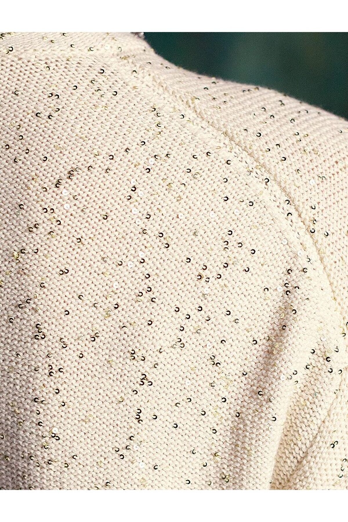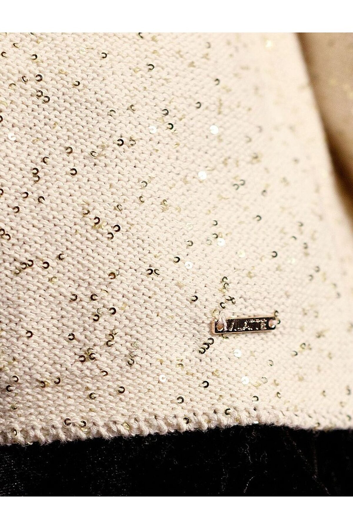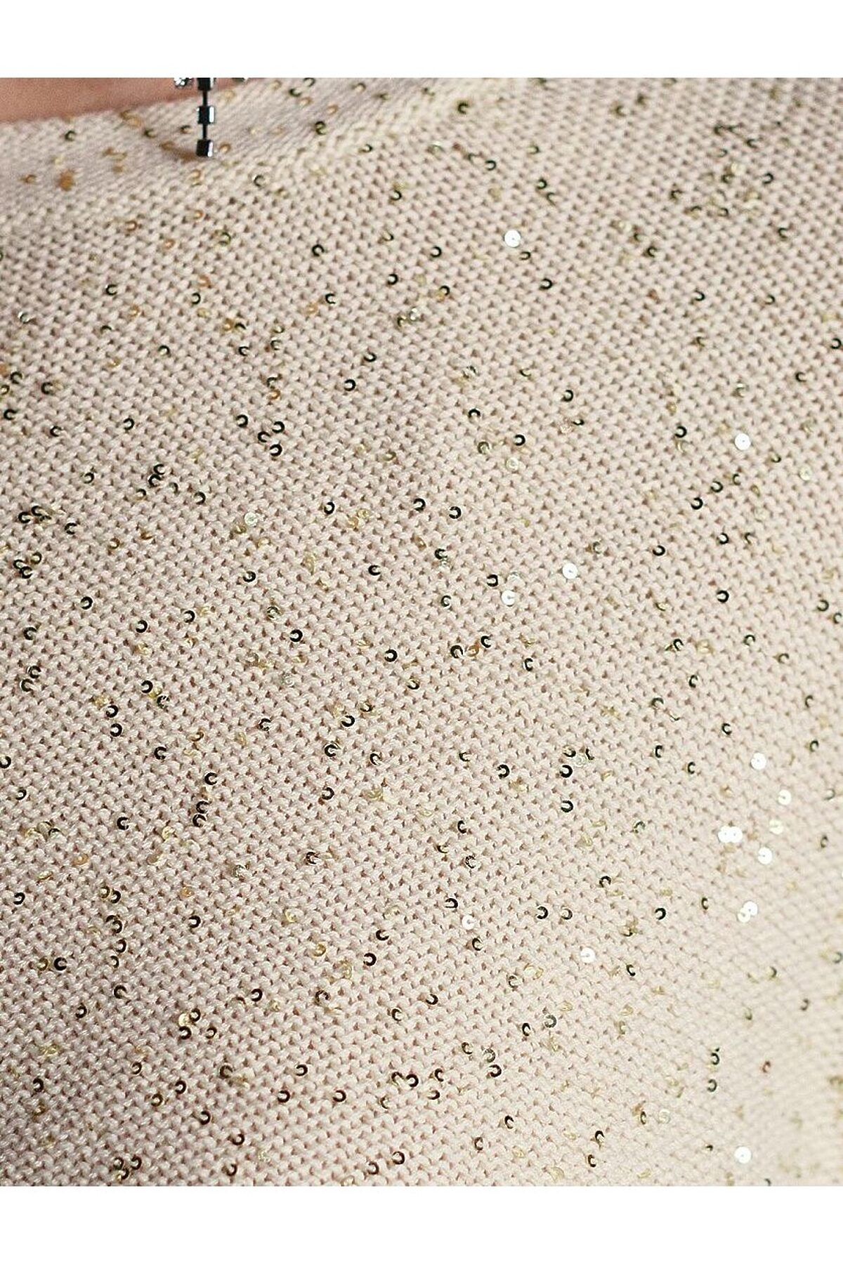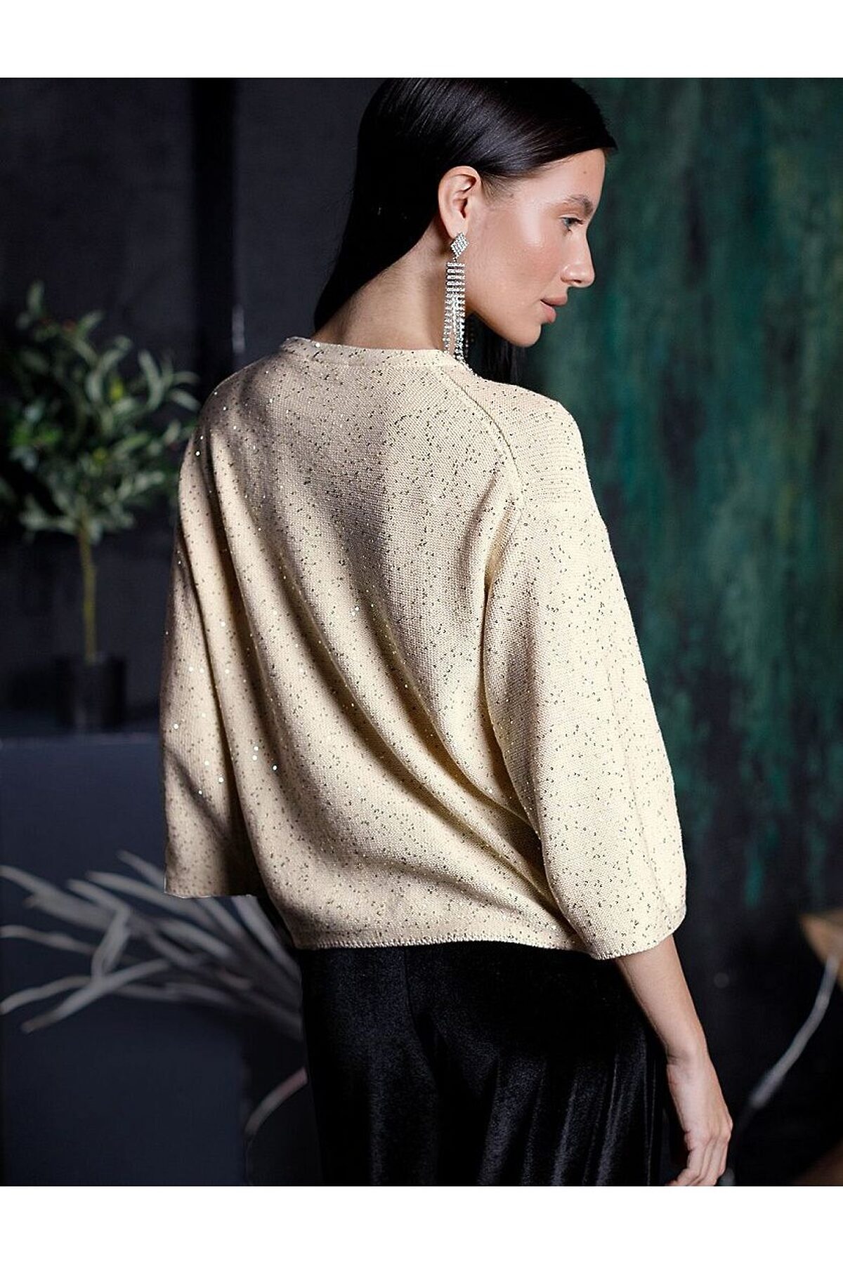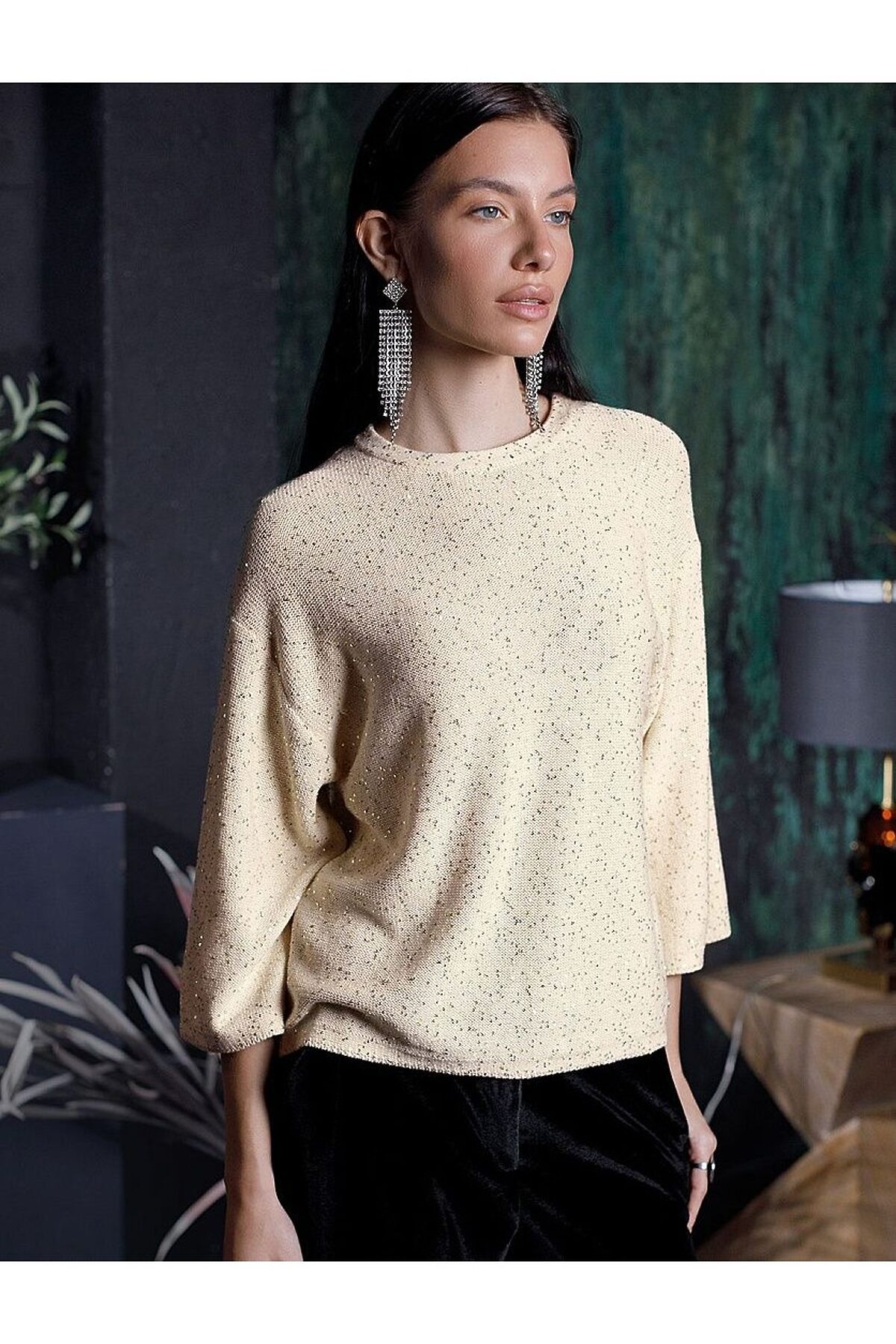 Легкий джемпер бежевого цвета с рукавом три четверти выполнен из хлопковой пряжи с вкраплением сияющих пайеток, что придает особую изысканность. Стильный джемпер связан изнанкой, пряжа отличается легкостью и приятной текстурой, совершенно не колется, обеспечивает комфорт даже при длительном использовании, а натуральные волокна поддерживают оптимальный температурный баланс. Крой полуприлегающий, подчеркивает женственный силуэт, а круглый ворот и спущенная линия плеча гармонично завершают дизайн, создающий аккуратный образ. Нарядный джемпер подойдет девушкам и женщинам больших размеров, в нем вы будете чувствовать себя уверенно и свободно в любой ситуации. Мерцающий эффект пайеток добавляет образу выразительности и индивудуальности. Сочетайте джемпер в романтическом образе с пышной юбкой, в более строгом с широкими брюками. Мерцающее полотно добавляет особого шарма вашему образу, делая его уместным как на праздник, так и для повседневного выхода. Новый год, вечеринка или любое другое мероприятие пройдут ярко