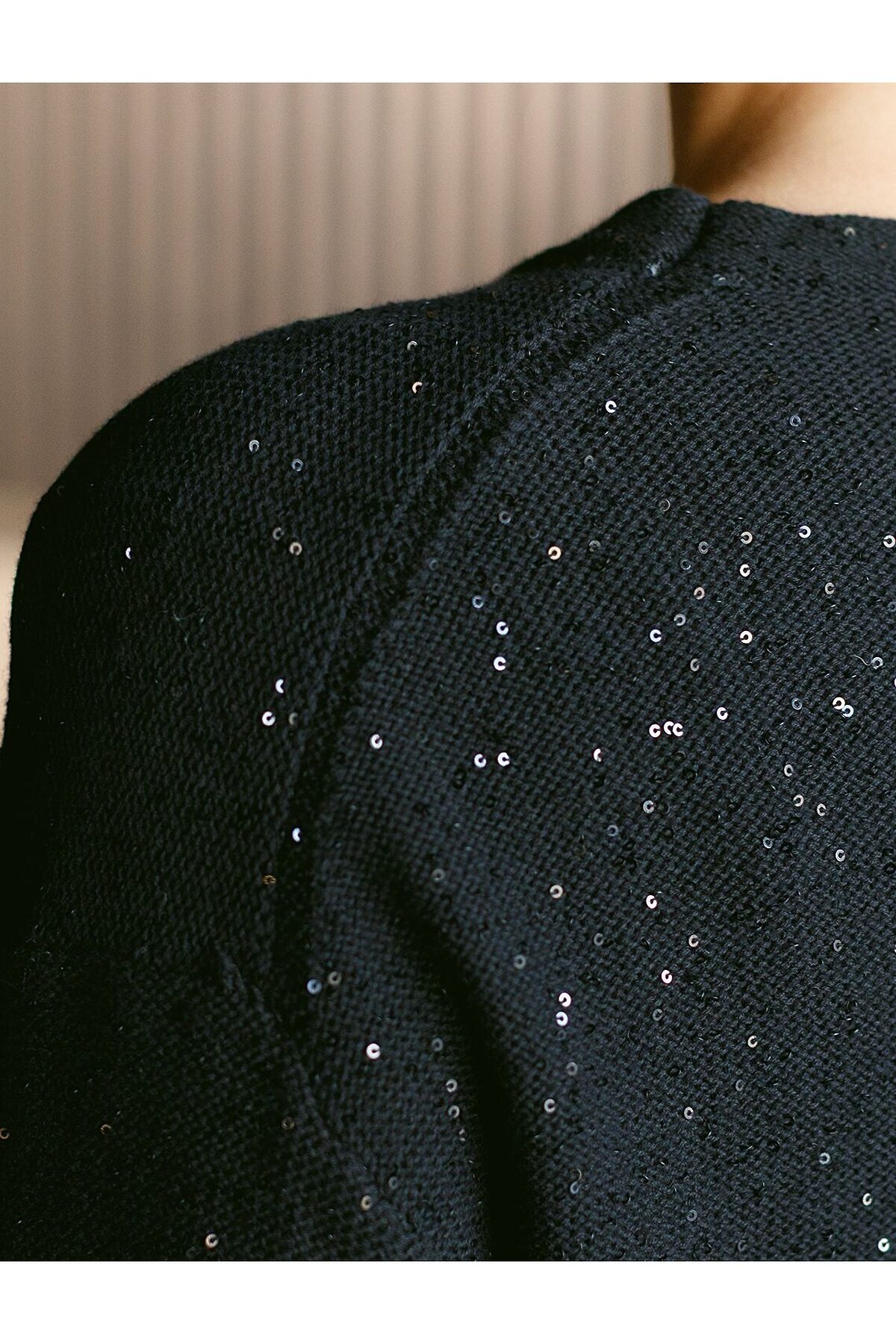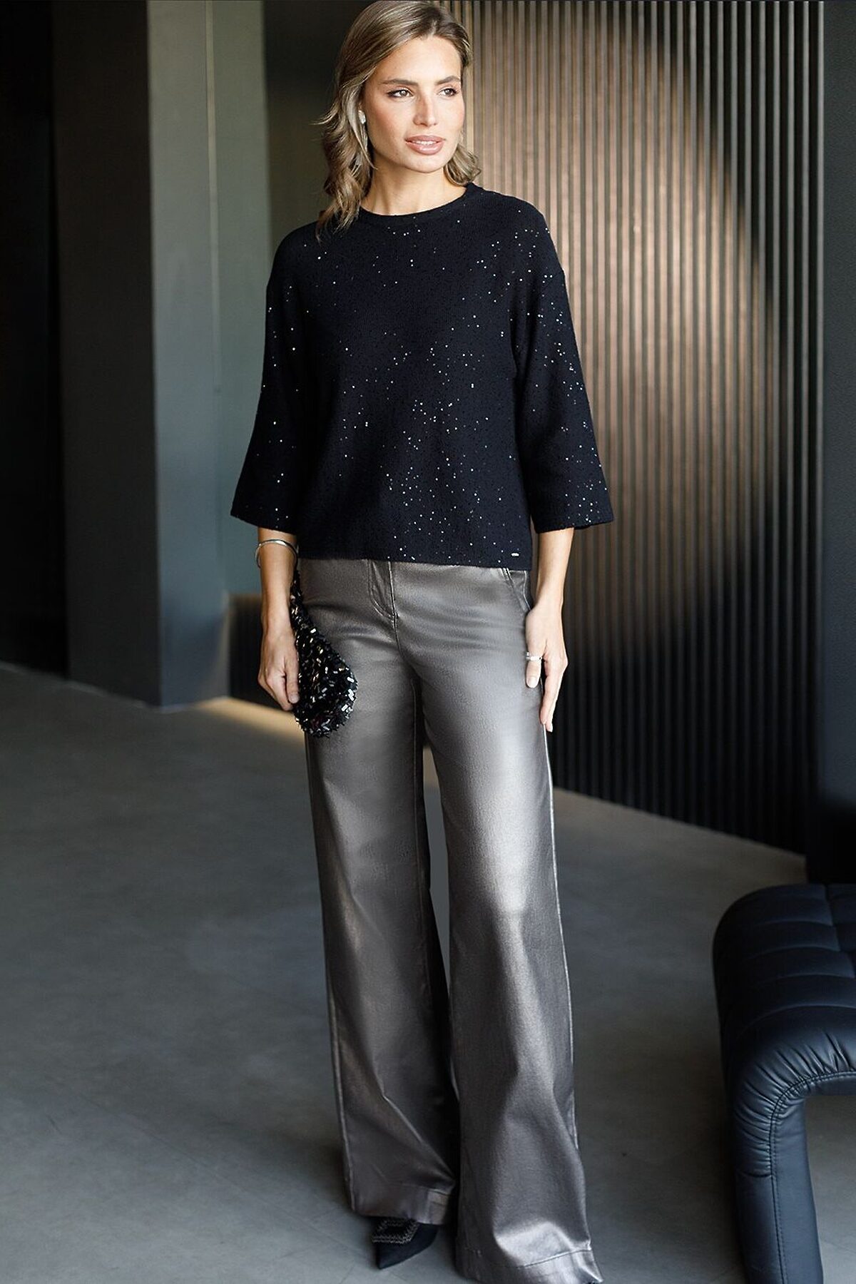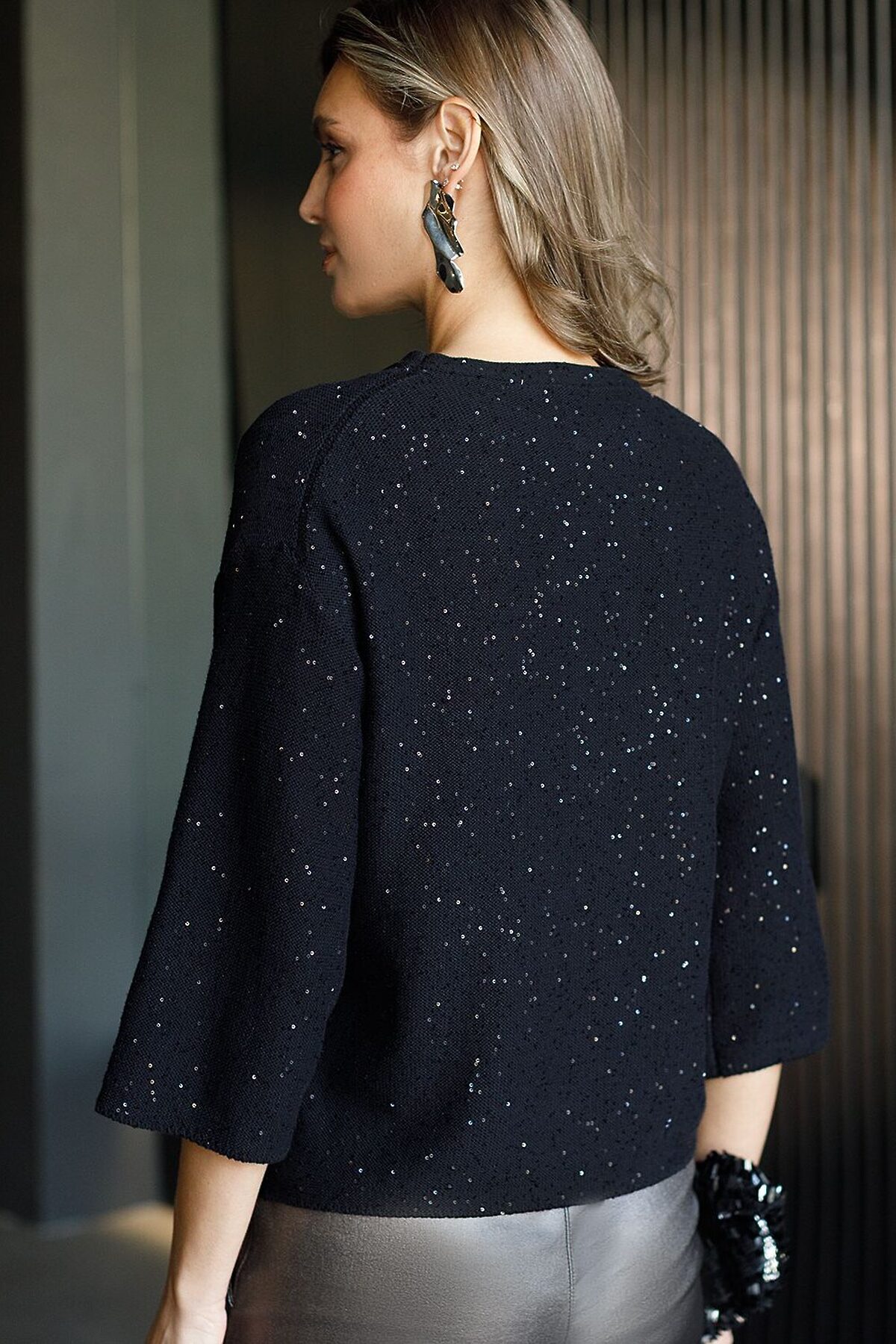 Легкий джемпер черного цвета с рукавом три четверти выполнен из хлопковой пряжи с вкраплением сияющих пайеток, что придает особую изысканность. Стильный джемпер связан изнанкой, пряжа отличается легкостью и приятной текстурой, совершенно не колется, обеспечивает комфорт даже при длительном использовании, а натуральные волокна поддерживают оптимальный температурный баланс. Крой полуприлегающий, подчеркивает женственный силуэт, а круглый ворот и спущенная линия плеча гармонично завершают дизайн, создающий аккуратный образ. Нарядный джемпер подойдет девушкам и женщинам больших размеров, в нем вы будете чувствовать себя уверенно и свободно в любой ситуации. Мерцающий эффект пайеток добавляет образу выразительности и индивудуальности. Сочетайте джемпер в романтическом образе с пышной юбкой, в более строгом с широкими брюками. Мерцающее полотно добавляет особого шарма вашему образу, делая его уместным как на праздник, так и для повседневного выхода. Новый год, вечеринка или любое другое мероприятие пройдут ярко