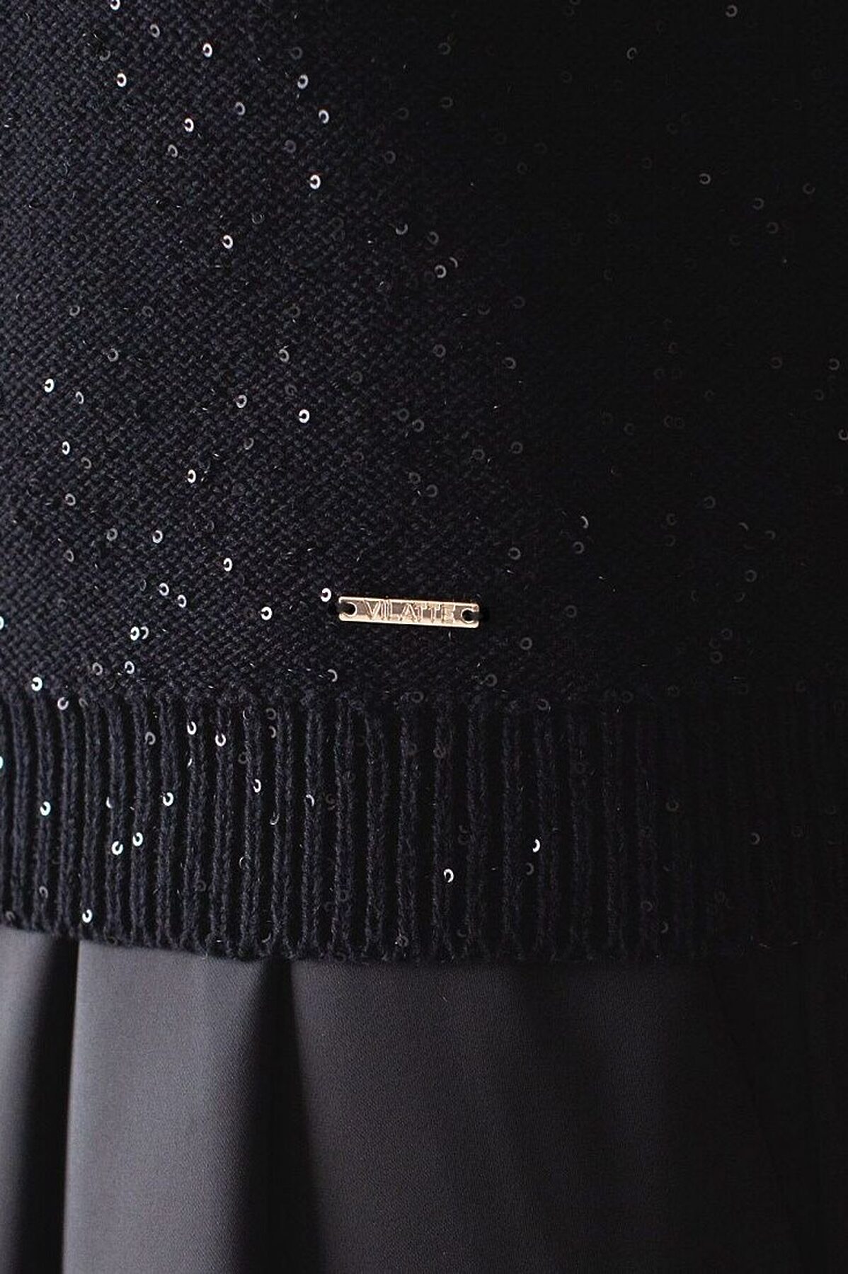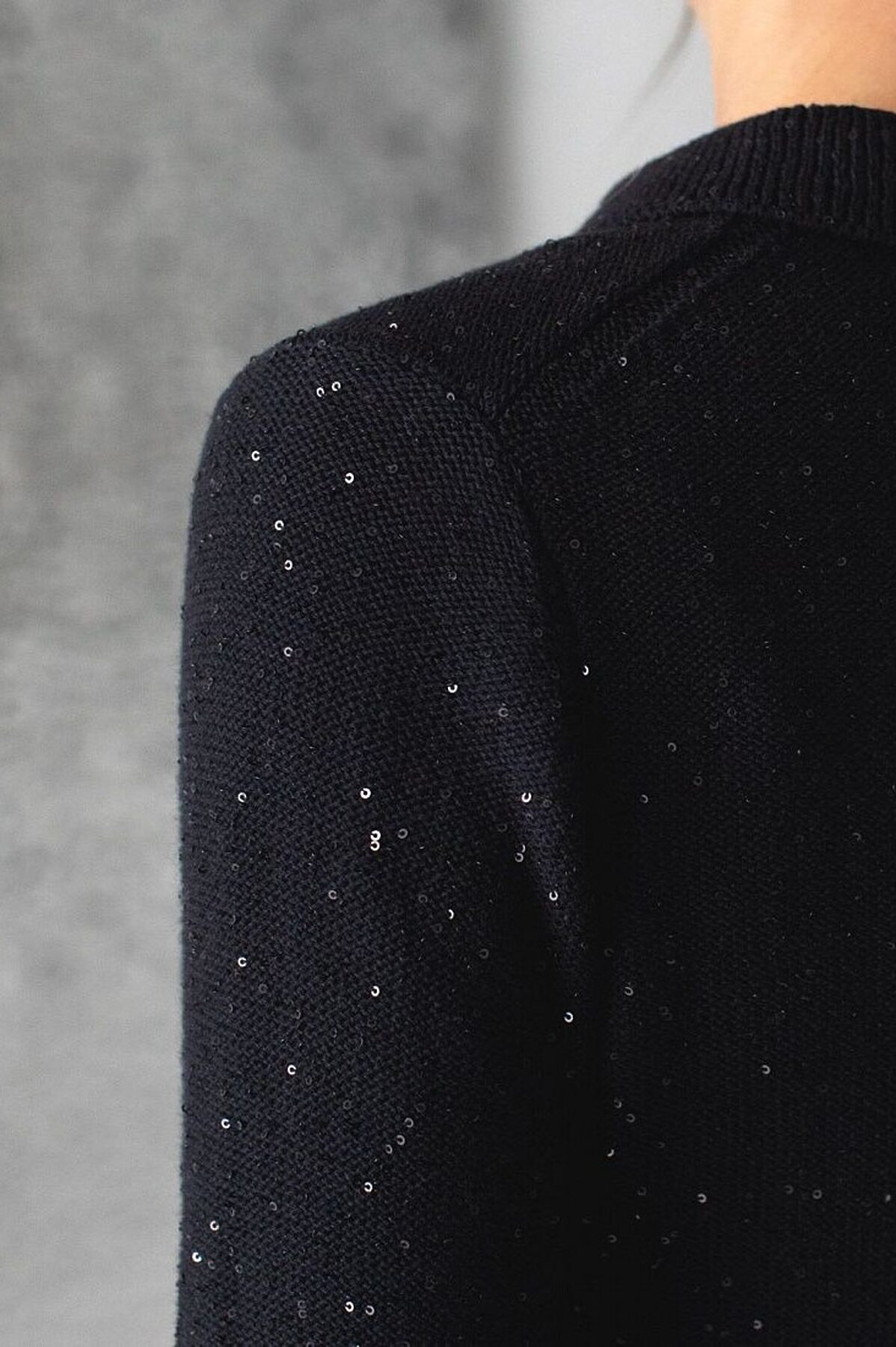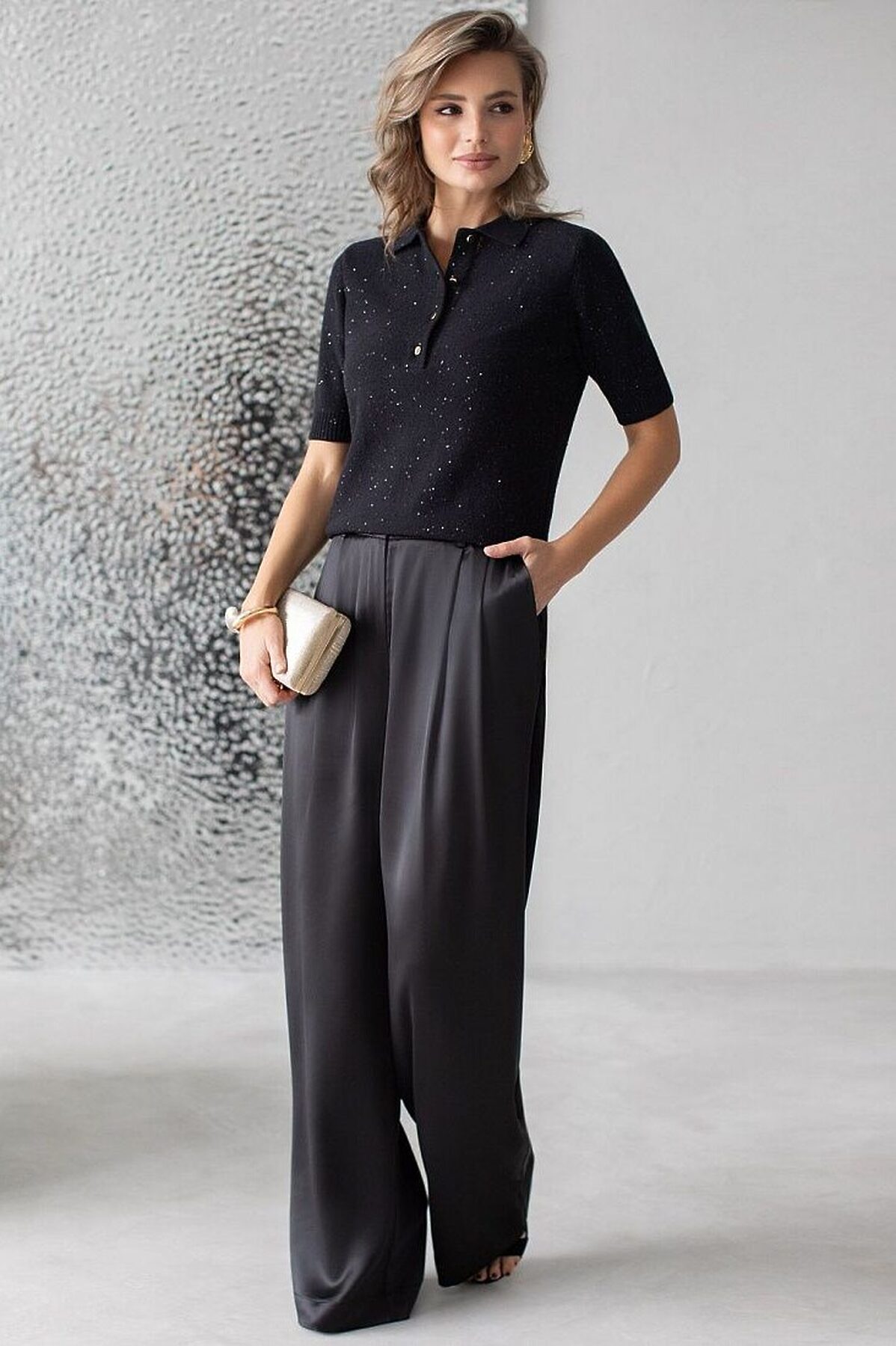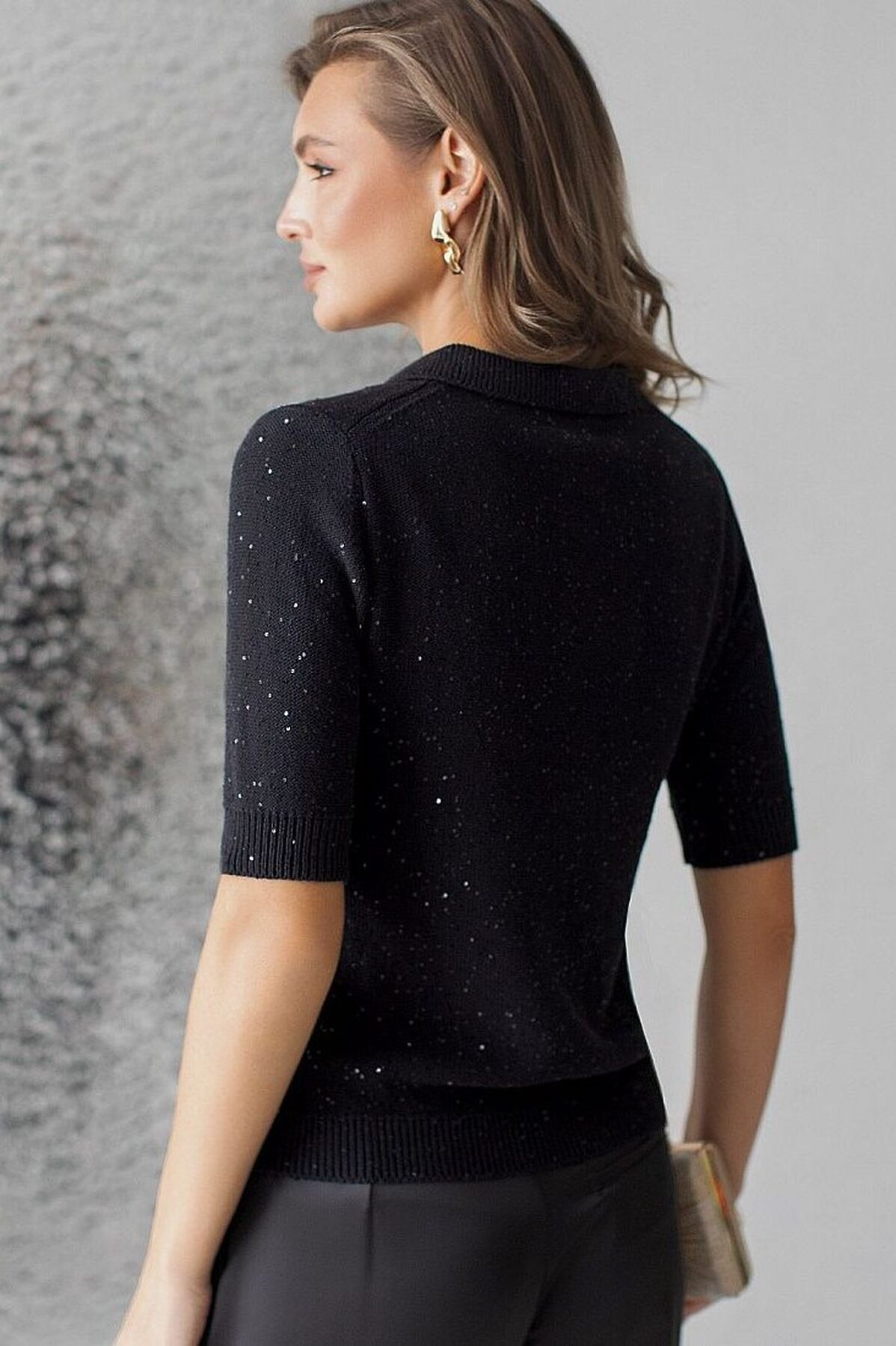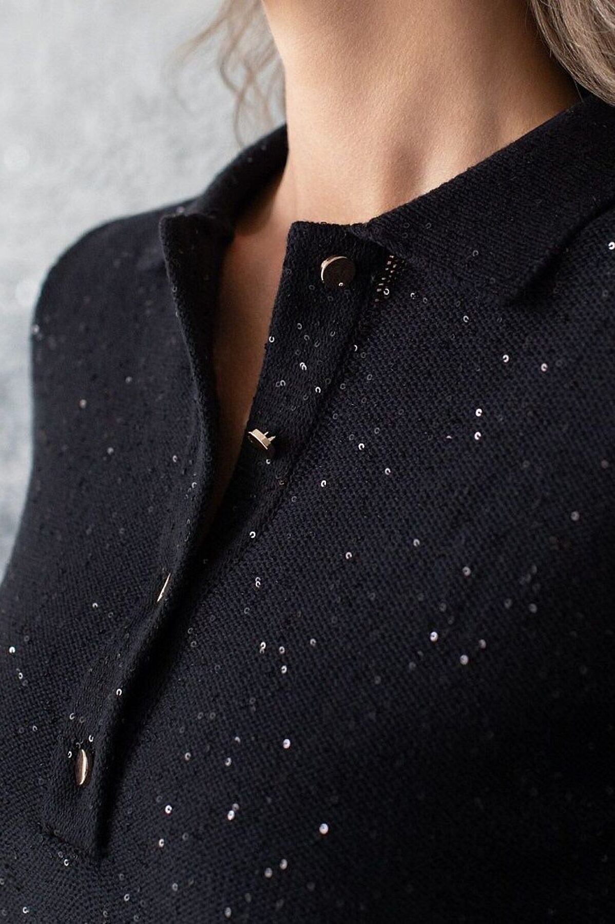 Легкий джемпер поло черного цвета с коротким руковом выполнен из хлопковой пряжи с вкраплением сияющих пайеток, что придает особую изысканность. Стильный джемпер связан изнанкой, пряжа отличается легкостью и приятной текстурой, совершенно не колется, обеспечивает комфорт даже при длительном использовании, а натуральные волокна поддерживают оптимальный температурный баланс. Крой полуприлегающий, подчеркивает женственный силуэт, а отложной воротничок с застежкой на золотистые пуговицы и манжеты на рукавах гармонично завершают дизайн, создающий аккуратный образ. Нарядный джемпер подойдет девушкам и женщинам больших размеров, в нем вы будете чувствовать себя уверенно и свободно в любой ситуации. Мерцающий эффект пайеток добавляет образу выразительности и индивудуальности. Сочетайте джемпер в романтическом образе с пышной юбкой, в более строгом с широкими брюками. С этим поло легко создать премиальный лук в стиле old money. Мерцающее полотно добавляет особого шарма вашему образу, делая его уместным как на празд