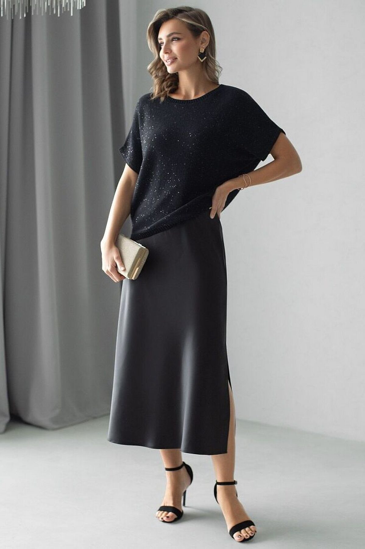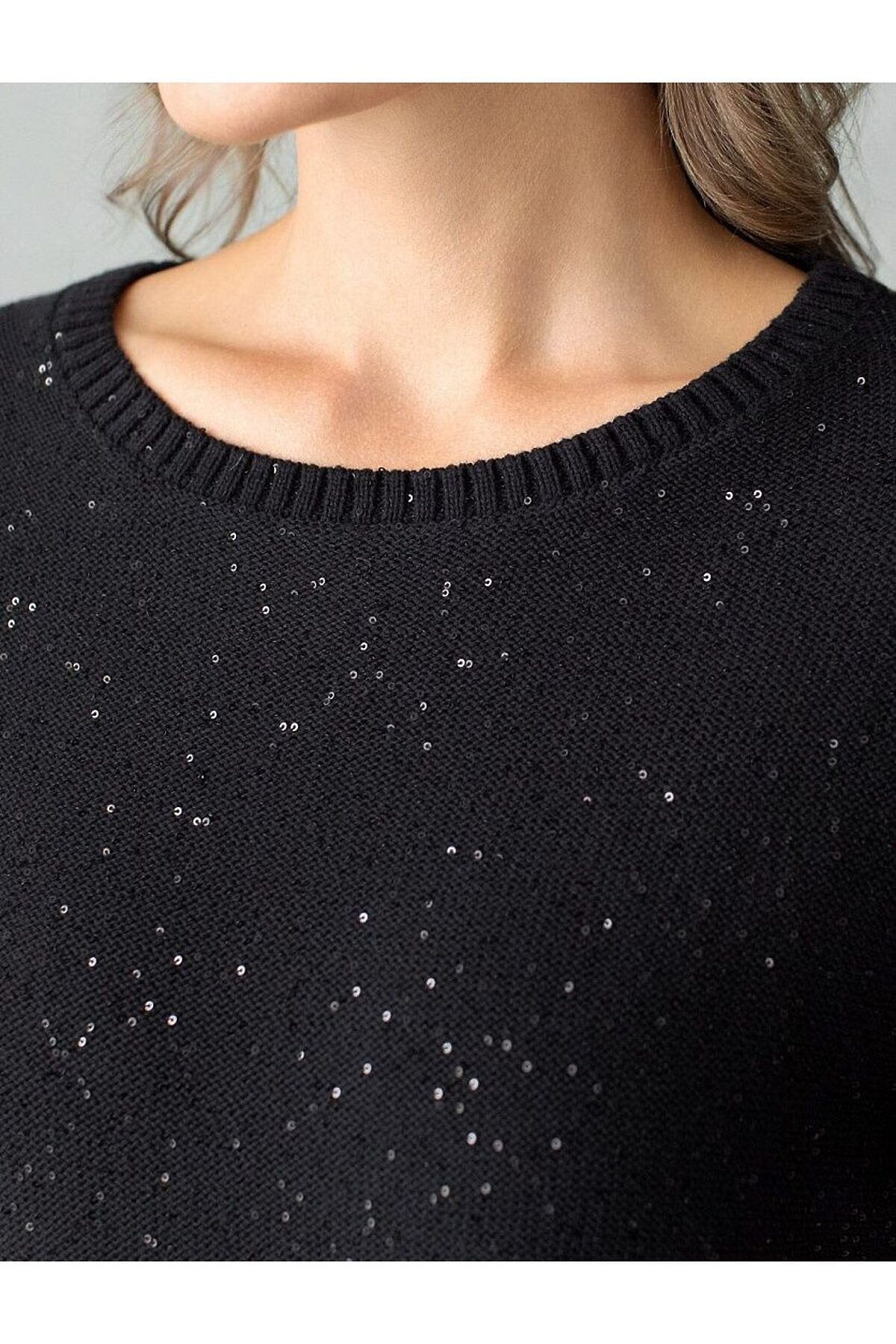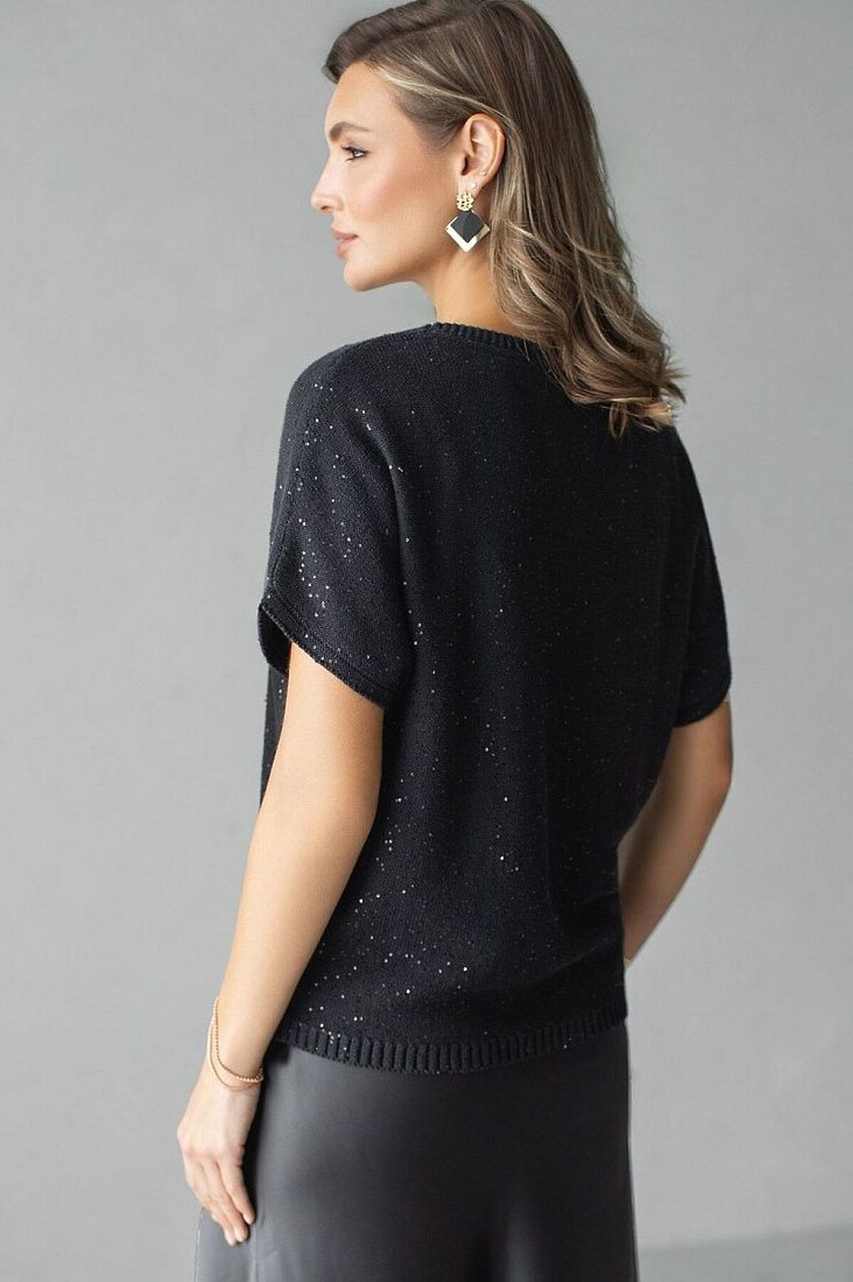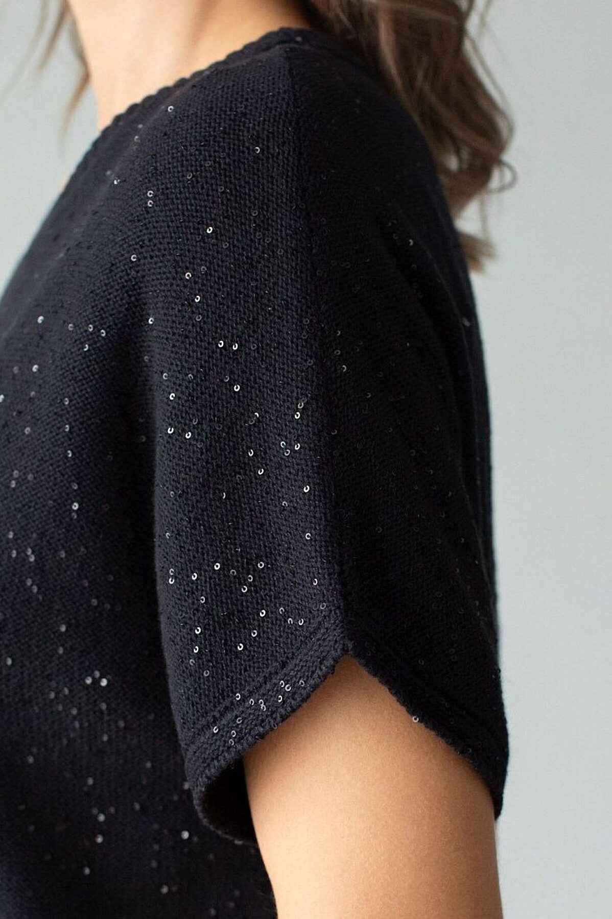 Легкий джемпер черного цвета с цельнокроенным коротким руковом выполнен из хлопковой пряжи с вкраплением сияющих пайеток, что придает особую изысканность. Стильный джемпер связан изнанкой, пряжа отличается легкостью и приятной текстурой, совершенно не колется, обеспечивает комфорт даже при длительном использовании, а натуральные волокна поддерживают оптимальный температурный баланс. Свободный крой и цельнокроенный рукав создают расслабленный, но аккуратный образ. Нарядный джемпер подойдет девушкам и женщинам больших размеров, в нем вы будете чувствовать себя уверенно и свободно в любой ситуации. Мерцающий эффект пайеток добавляет образу выразительности и индивидуальности. Мерцающее полотно добавляет особого шарма вашему образу, делая его уместным как на праздник, так и для повседневного выхода. Новый год, вечеринка или любое другое мероприятие пройдут ярко — сияющие пайетки создают ощущение праздника в каждом движении. Для спокойного повседневного аутфита добавьте к этому эффектному джемперу спокойный низ,
