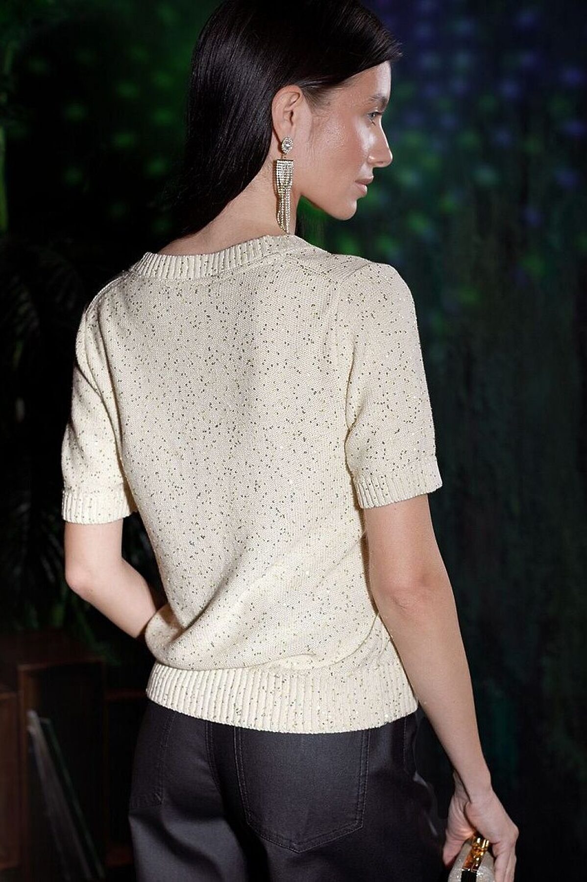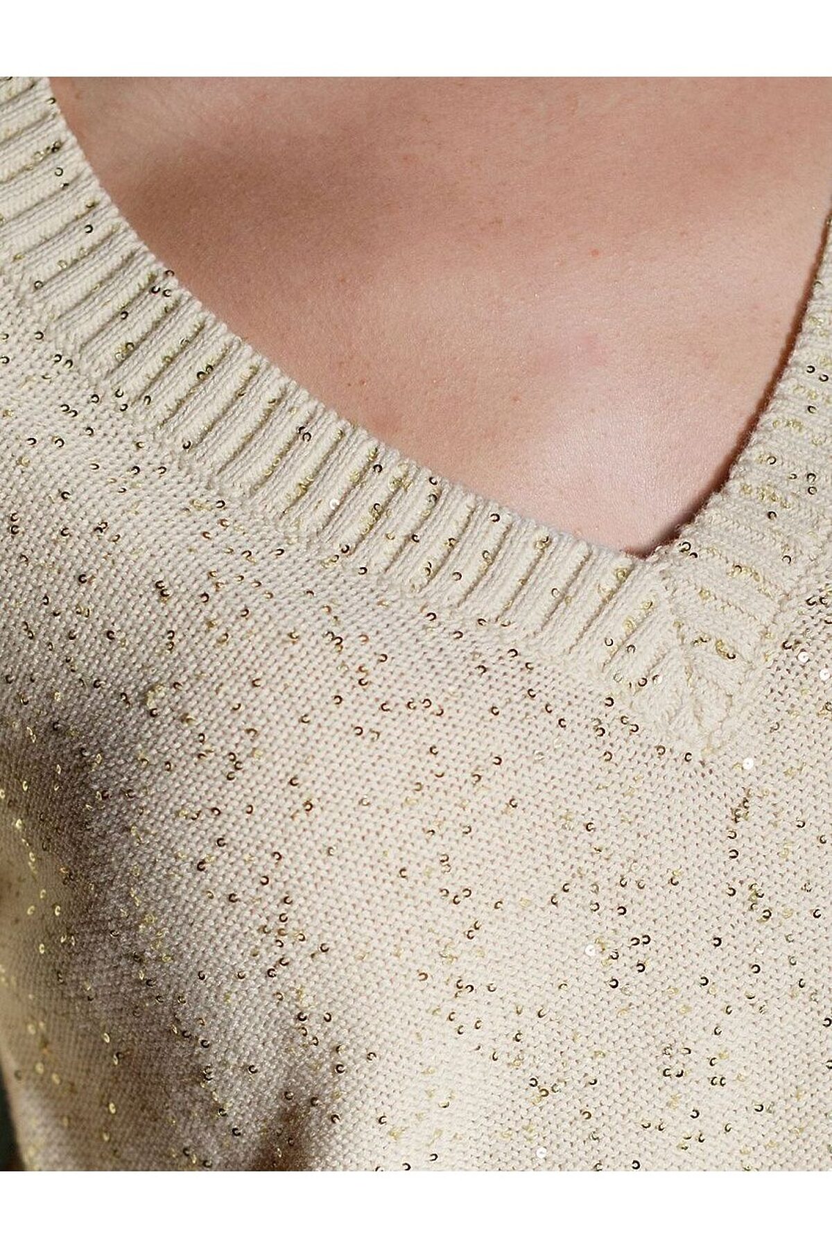 Легкий джемпер бежевого цвета с V вырезом и коротким рукавом выполнен из хлопковой пряжи с вкраплением сияющих пайеток, что придает особую изысканность. Нарядный джемпер связан изнанкой, пряжа отличается легкостью и приятной текстурой, совершенно не колется, обеспечивает комфорт даже при длительном использовании, а натуральные волокна поддерживают оптимальный температурный баланс. Полуприлегающий крой подчеркивает женственный силуэт, а манжеты на рукавах и по низу гармонично завершают дизайн, создающий аккуратный образ. Умеренно открытое декольте вытягивает шею и подчеркивает ее изящество. Стильный джемпер подойдет девушкам и женщинам больших размеров, в нем вы будете чувствовать себя уверенно и свободно в любой ситуации. Мерцающий эффект пайеток добавляет образу выразительности и индивудуальности. Сочетайте джемпер в романтическом образе с пышной юбкой, в более строгом с широкими брюками. Мерцающее полотно добавляет особого шарма вашему образу, делая его уместным как на праздник, так и для повседневного вы