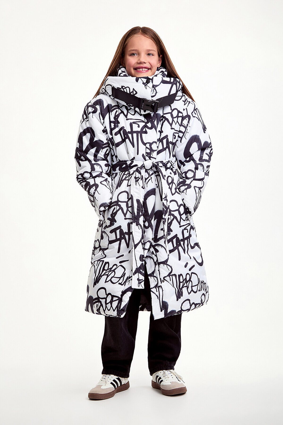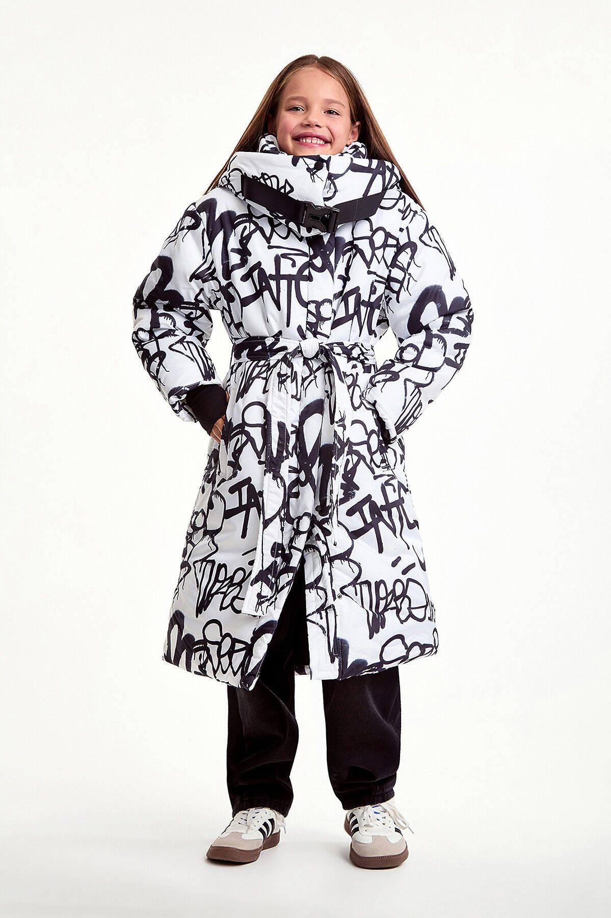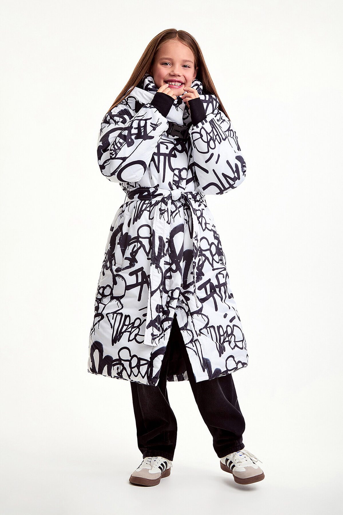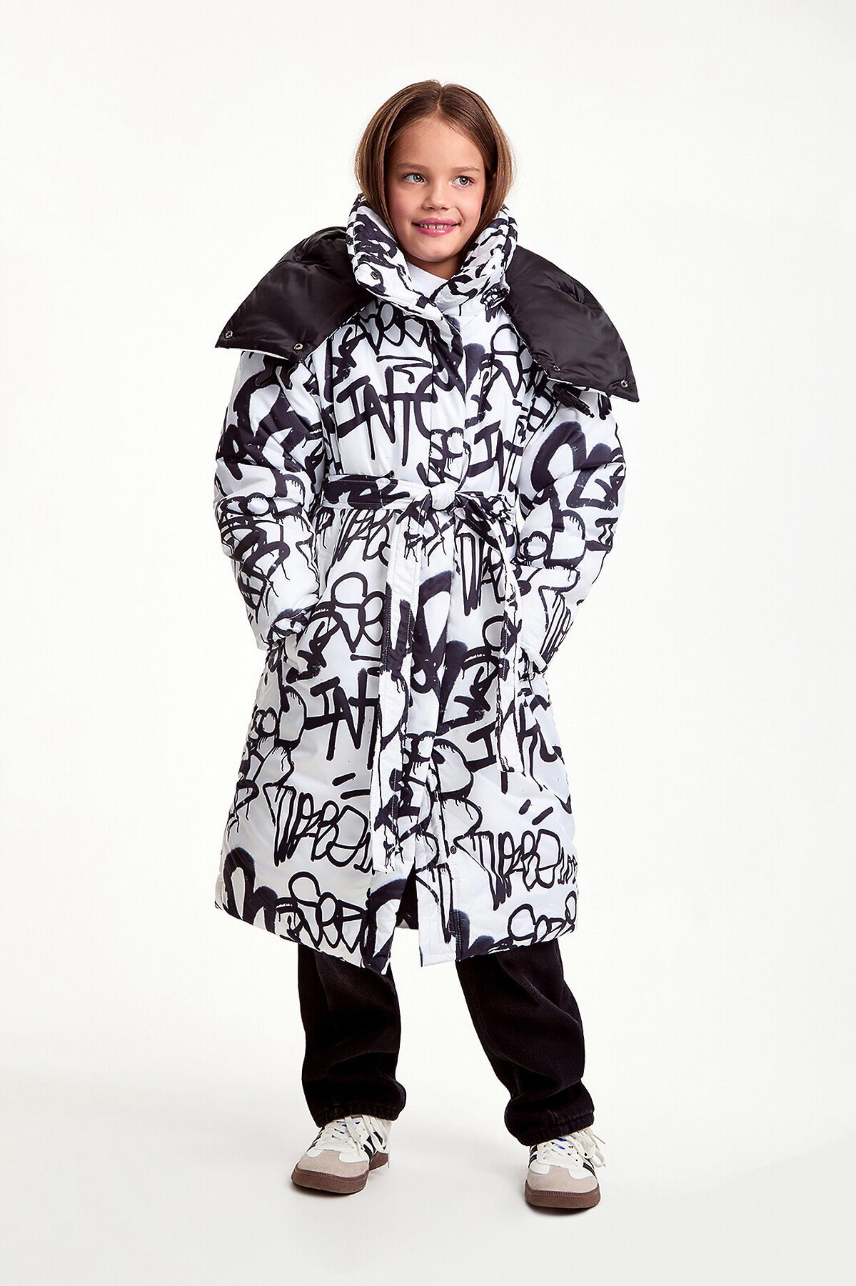 Зимнее пальто прямого силуэта с полиуретановым покрытием ткани, нанесенным на внутреннюю сторону, обеспечит водонепроницаемость. Лямки с внутренней стороны куртки. Манжет из ткани ""Soft Stretch"" с прочной внешней поверхностью и мягким внутренним слоем с велюровым ворсом. Пальто дополнено поясом, который подчеркивает талию, а боковые карманы добавляют функциональности. Длина ниже колена обеспечивает дополнительное тепло в холодную погоду. Модель оформлена трендовым необычным принтом, который добавит динамики образу. Утеплитель пластовый синтепон 280 гр/м2. Рекомендованный температурный режим: 0/-15 градусов. Представлено в двух цветах – белый и черный. Размерный ряд 128 – 170 см.