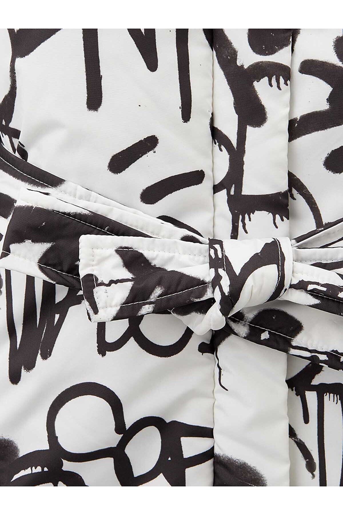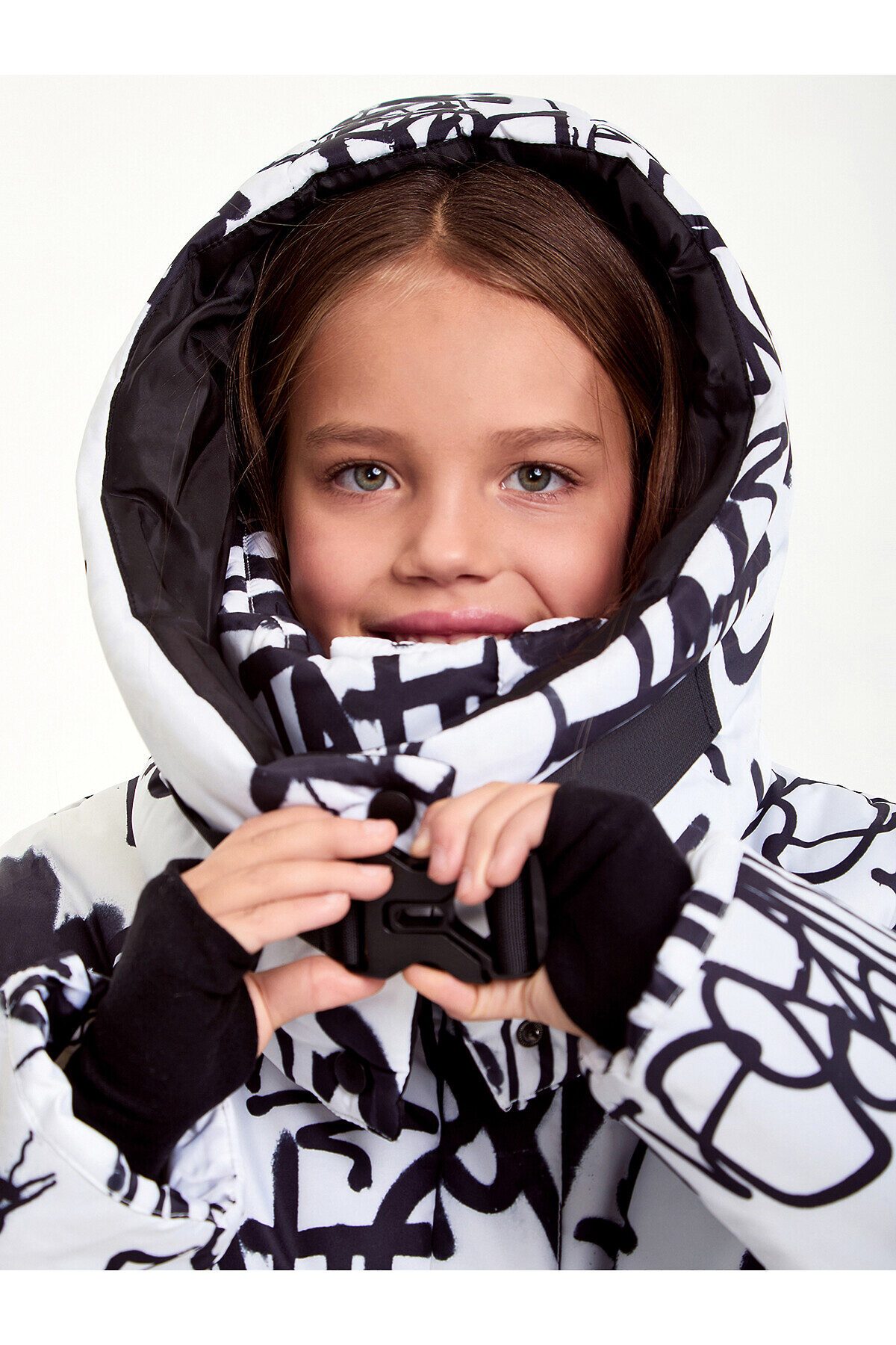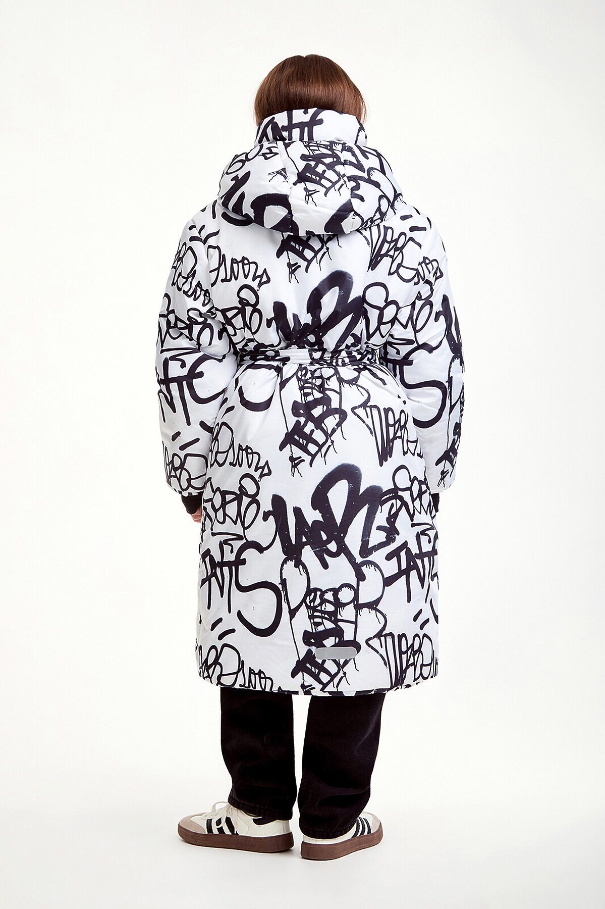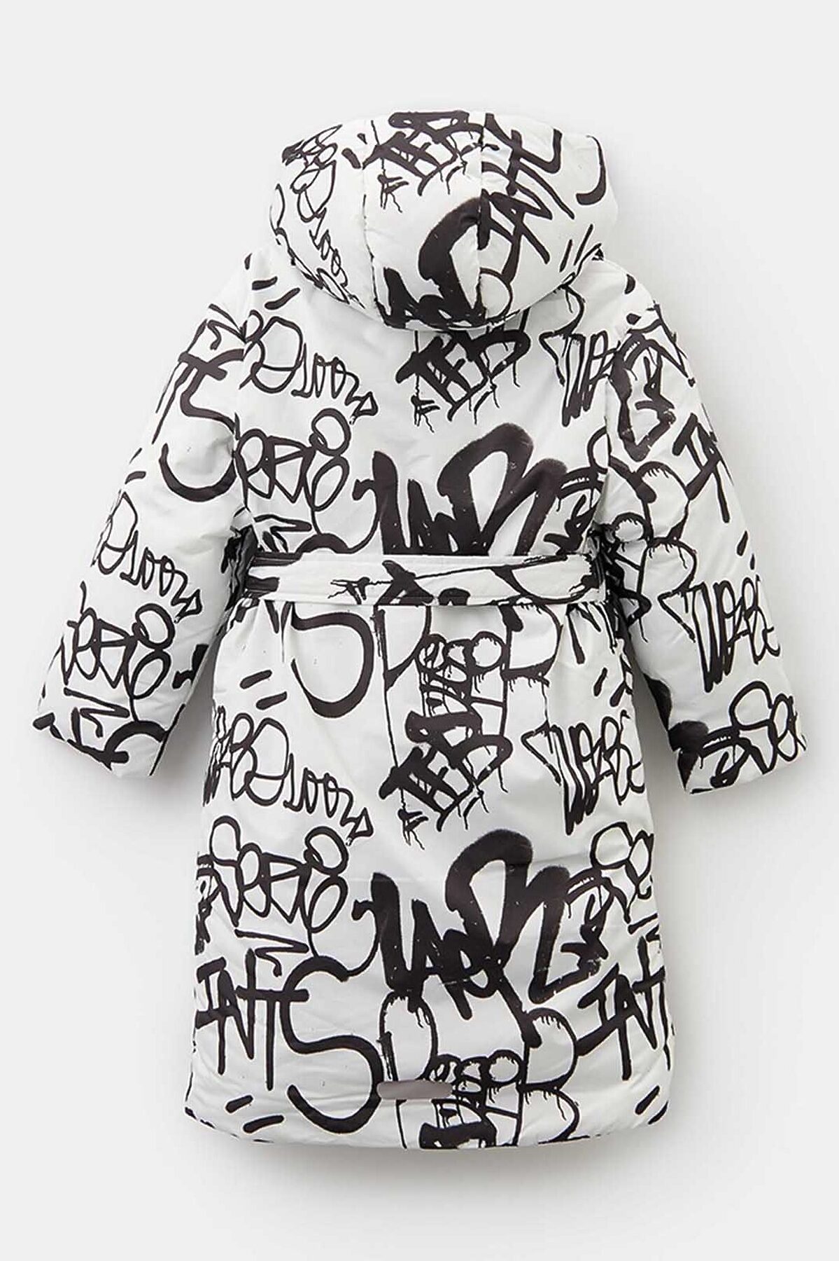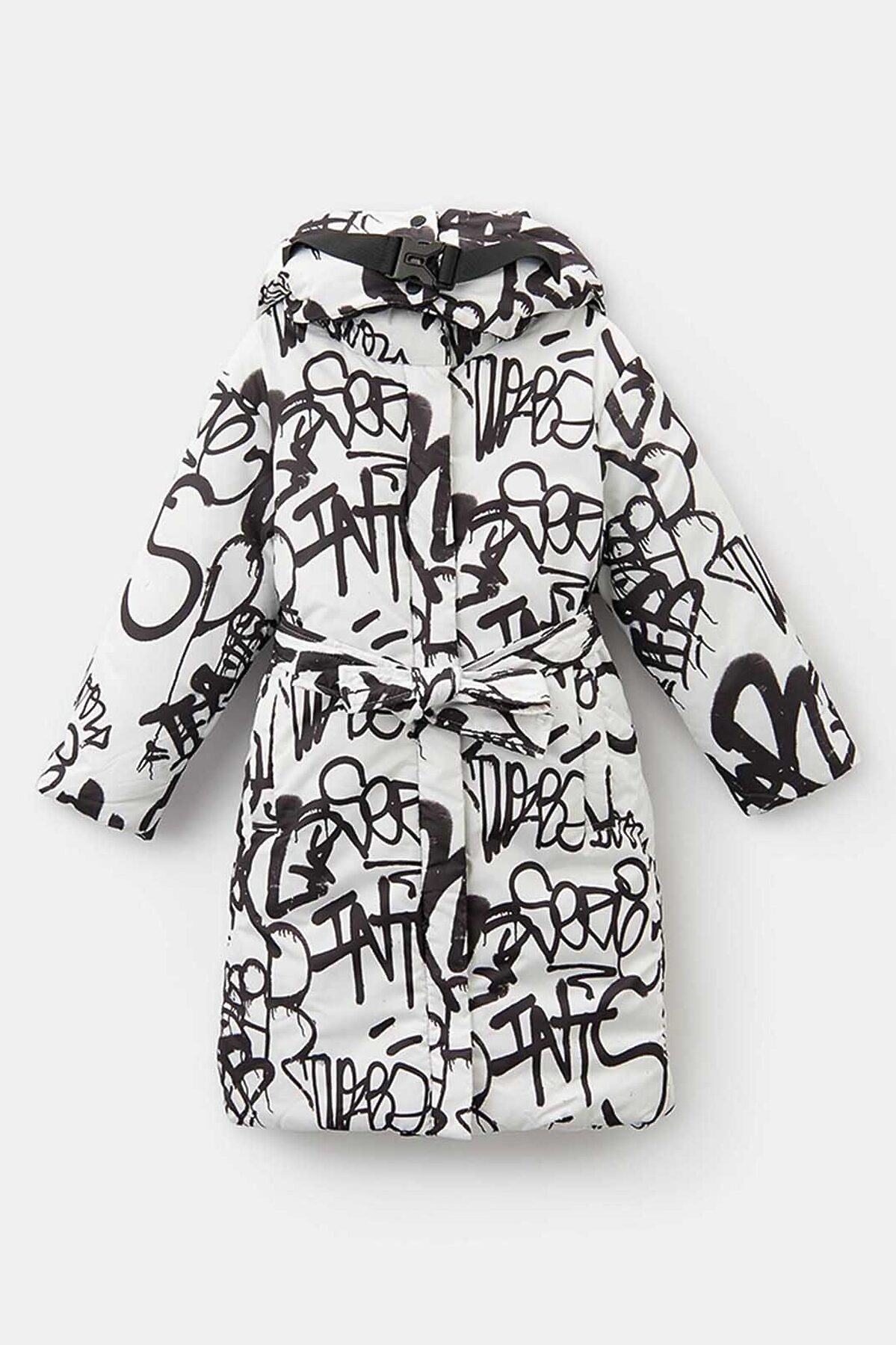 Зимнее пальто прямого силуэта с полиуретановым покрытием ткани, нанесенным на внутреннюю сторону, обеспечит водонепроницаемость. Лямки с внутренней стороны куртки. Манжет из ткани ""Soft Stretch"" с прочной внешней поверхностью и мягким внутренним слоем с велюровым ворсом. Пальто дополнено поясом, который подчеркивает талию, а боковые карманы добавляют функциональности. Длина ниже колена обеспечивает дополнительное тепло в холодную погоду. Модель оформлена трендовым необычным принтом, который добавит динамики образу. Утеплитель пластовый синтепон 280 гр/м2. Рекомендованный температурный режим: 0/-15 градусов. Представлено в двух цветах – белый и черный. Размерный ряд 128 – 170 см.