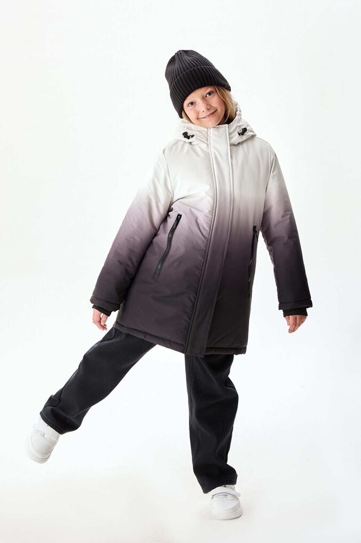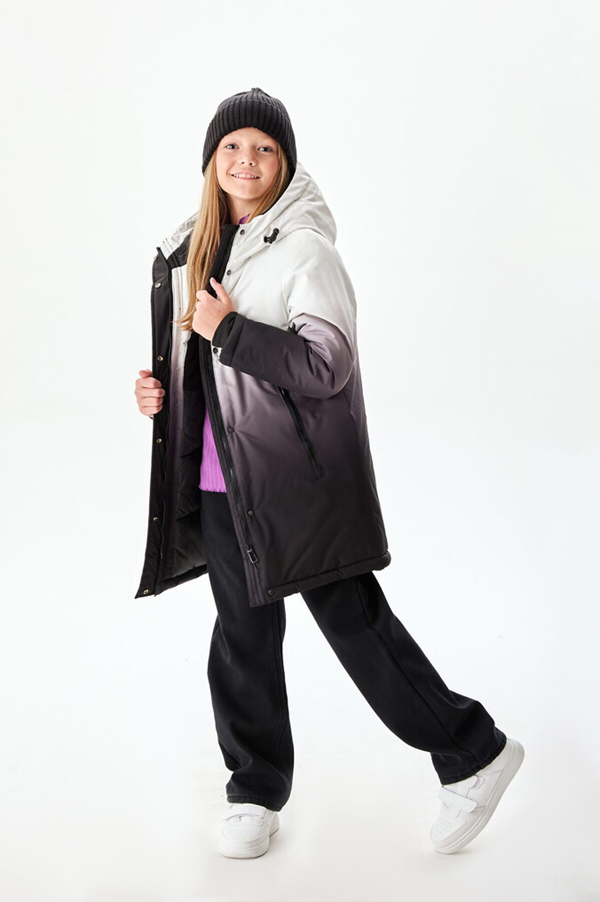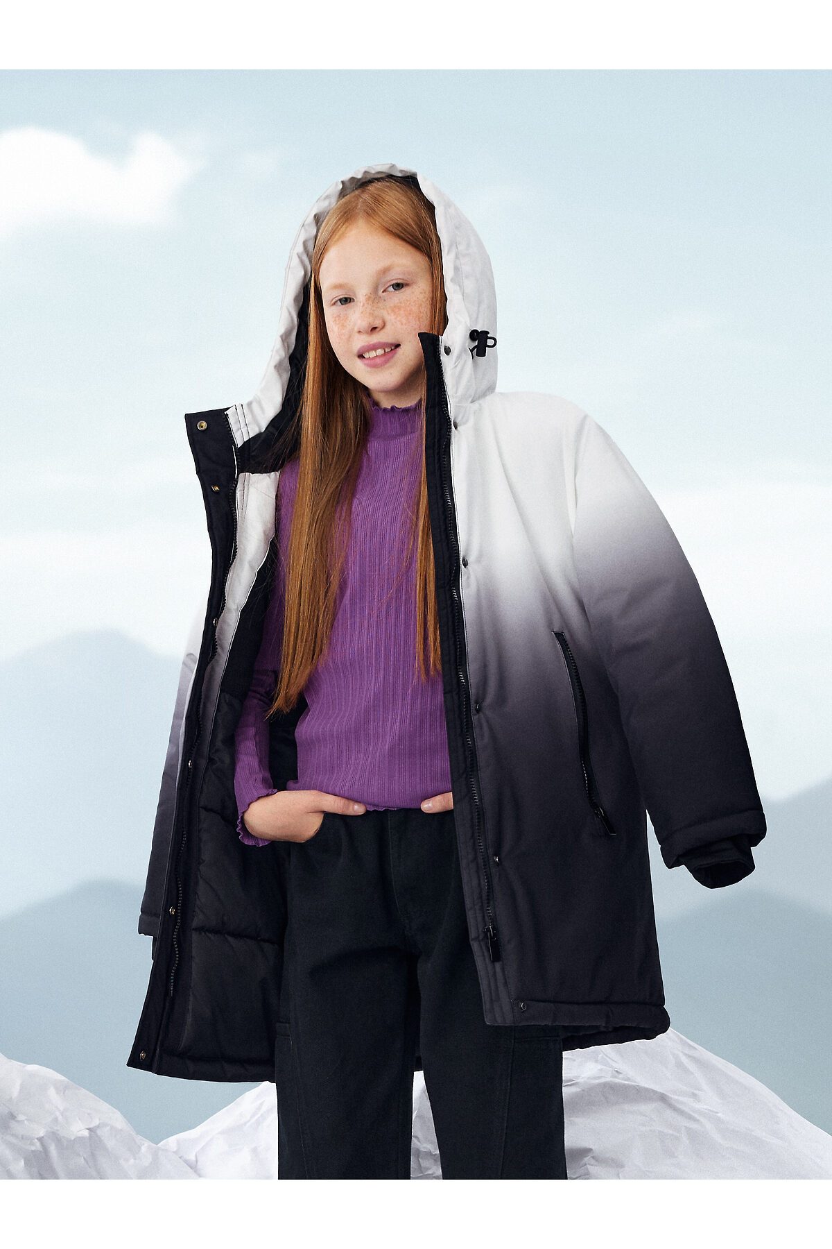 Зимняя куртка для девочки прямого кроя на молнии. Покрытие водонепроницаемое. Манжета с прочной внешней поверхностью и мягким внутренним слоем, препятствует образованию катышек, лямки с внутренней стороны куртки. С внутренней стороны полочки и спинки наполовину флисовая подкладка. Дополнена капюшоном с утяжкой для лучшей защиты от ветра. Карманы на молниях. Модель в градиентной расцветке. Надежная фурнитура: прочные застежки и молнии обеспечивают долгий срок службы. Утеплитель пластовой синтепон к основной ткани 50 гр/м2, био-пух к подкладке 250 гр/м2. Рекомендованный температурный режим: -10/-30 градусов. Куртка представлена в бело-черном цвете. Размерный ряд 128 – 170 см.