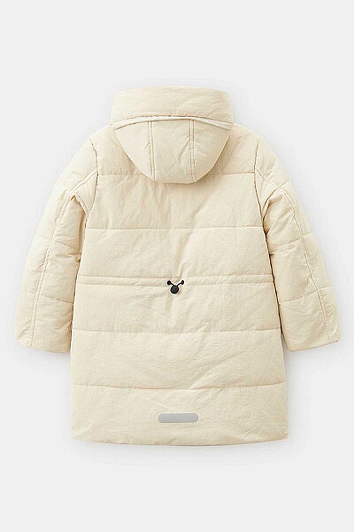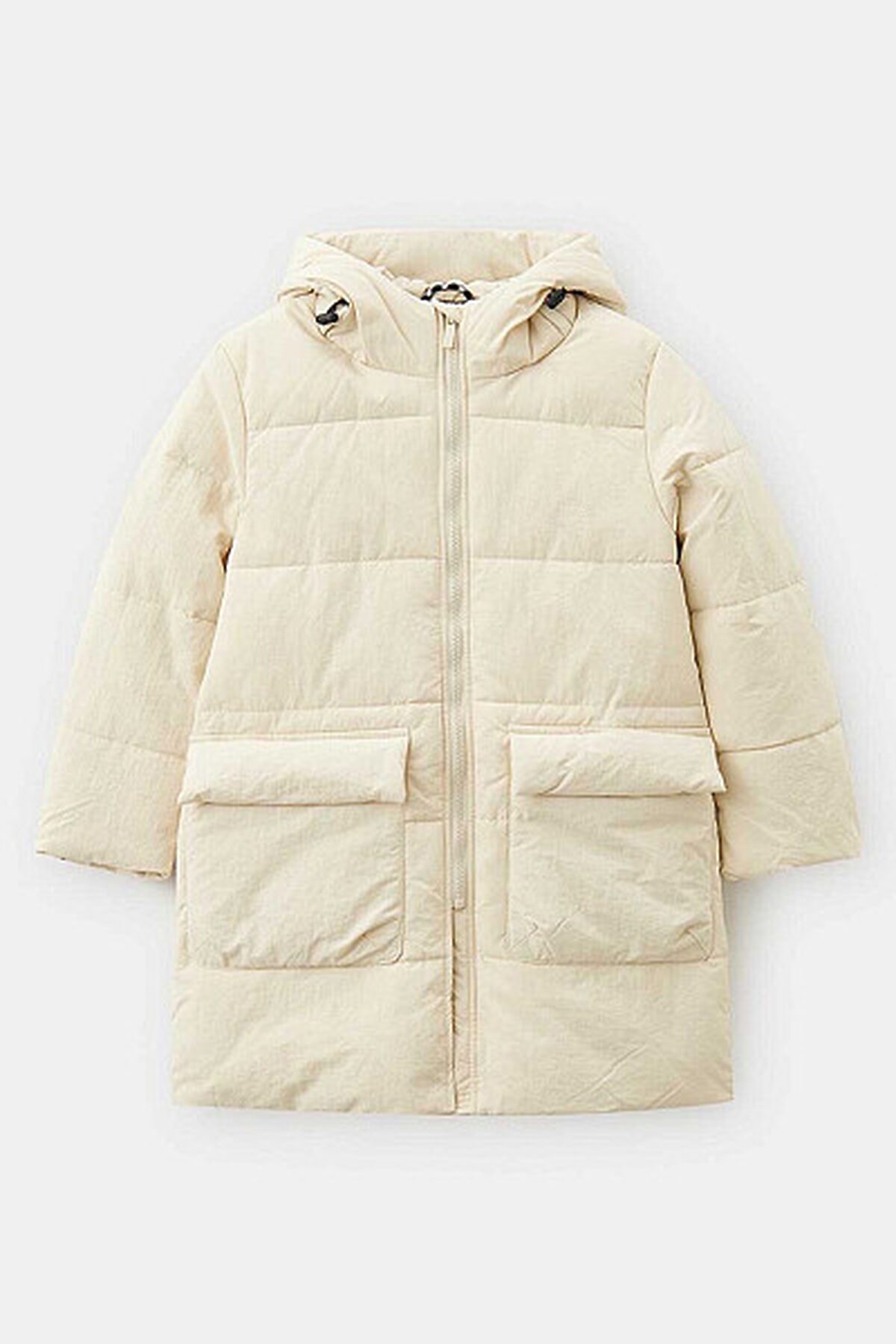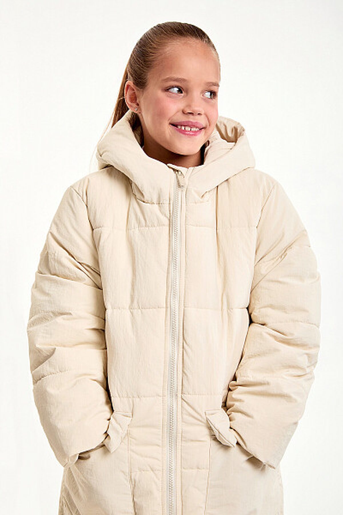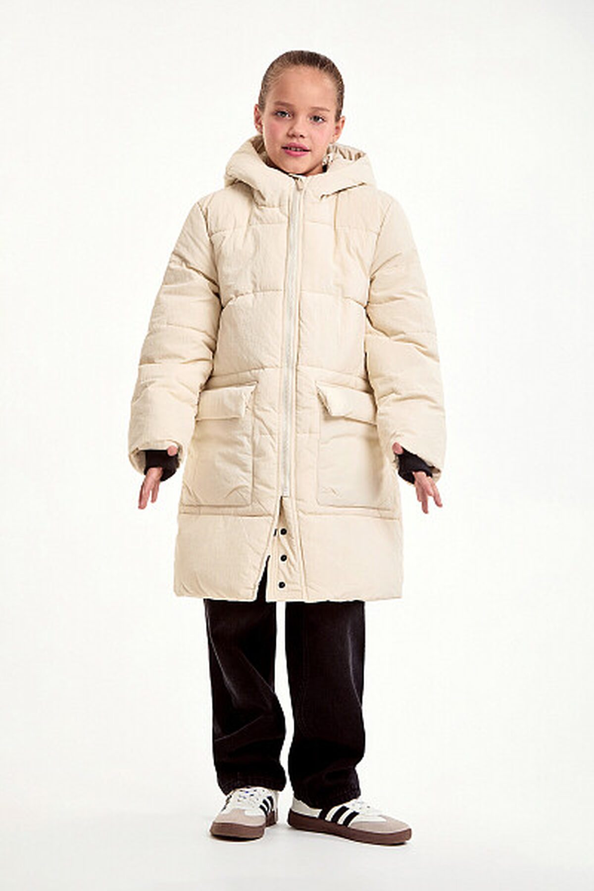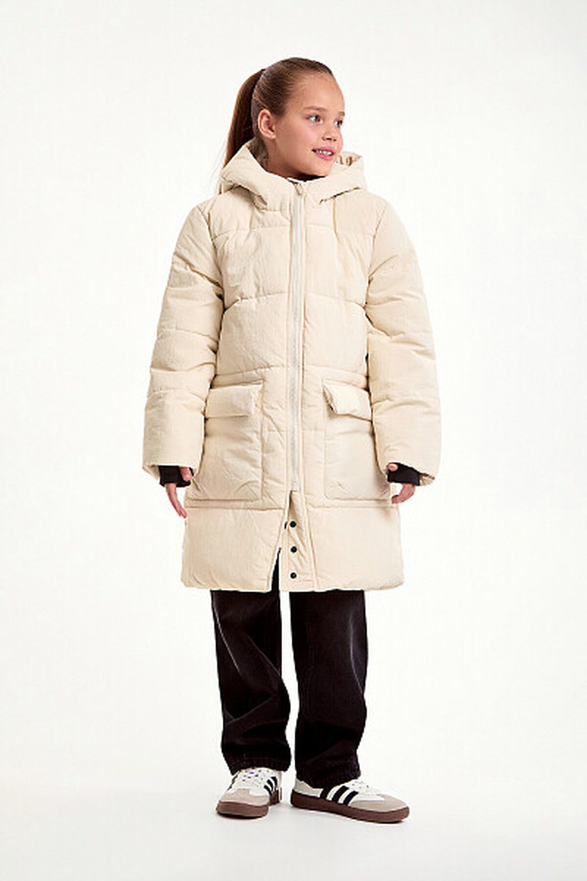 Зимнее пальто прямого силуэта для девочки ""мятым"" эффектом, водонепроницаемым покрытием и длиной ниже колена на молнии. Лямки с внутренней стороны куртки. Манжета с прочной внешней поверхностью и мягким внутренним слоем, обеспечивает дополнительную защиту от ветра. Модель дополнена капюшоном и большими накладными карманами. Надежная фурнитура обеспечат долгий срок службы. На спинке по низу изделия оформлен светоотражающий элемент, повышающий видимость в темное время суток. Утеплитель пластовый синтепон к подкладке 50 гр/м2, био-пух 250 гр/м2. Рекомендованный температурный режим: -10/-30 градусов. Пальто представлено в двух цветах – молочный и черный. Размерный ряд 128 – 170 см.