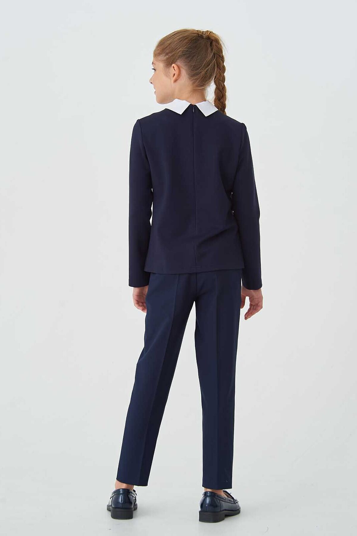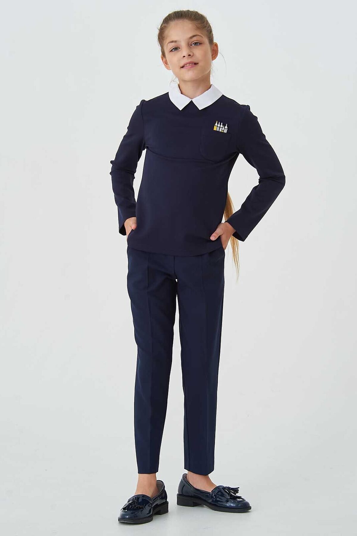 Трикотажный джемпер для девочки приталенного силуэта с длинными втачными рукавами и отложным съемным воротником белого цвета. Перед украшен кармашком и вышивкой в виде карандашей. Застежка на потайную молнию на спинке обеспечивает идеальную посадку.