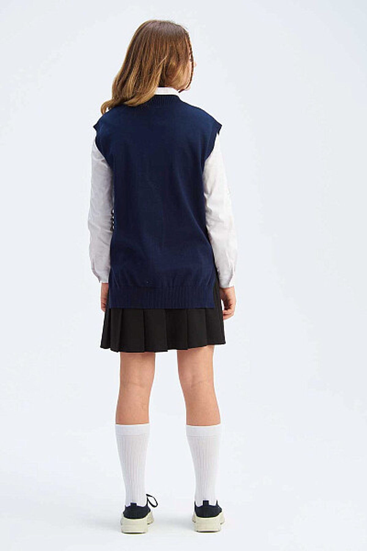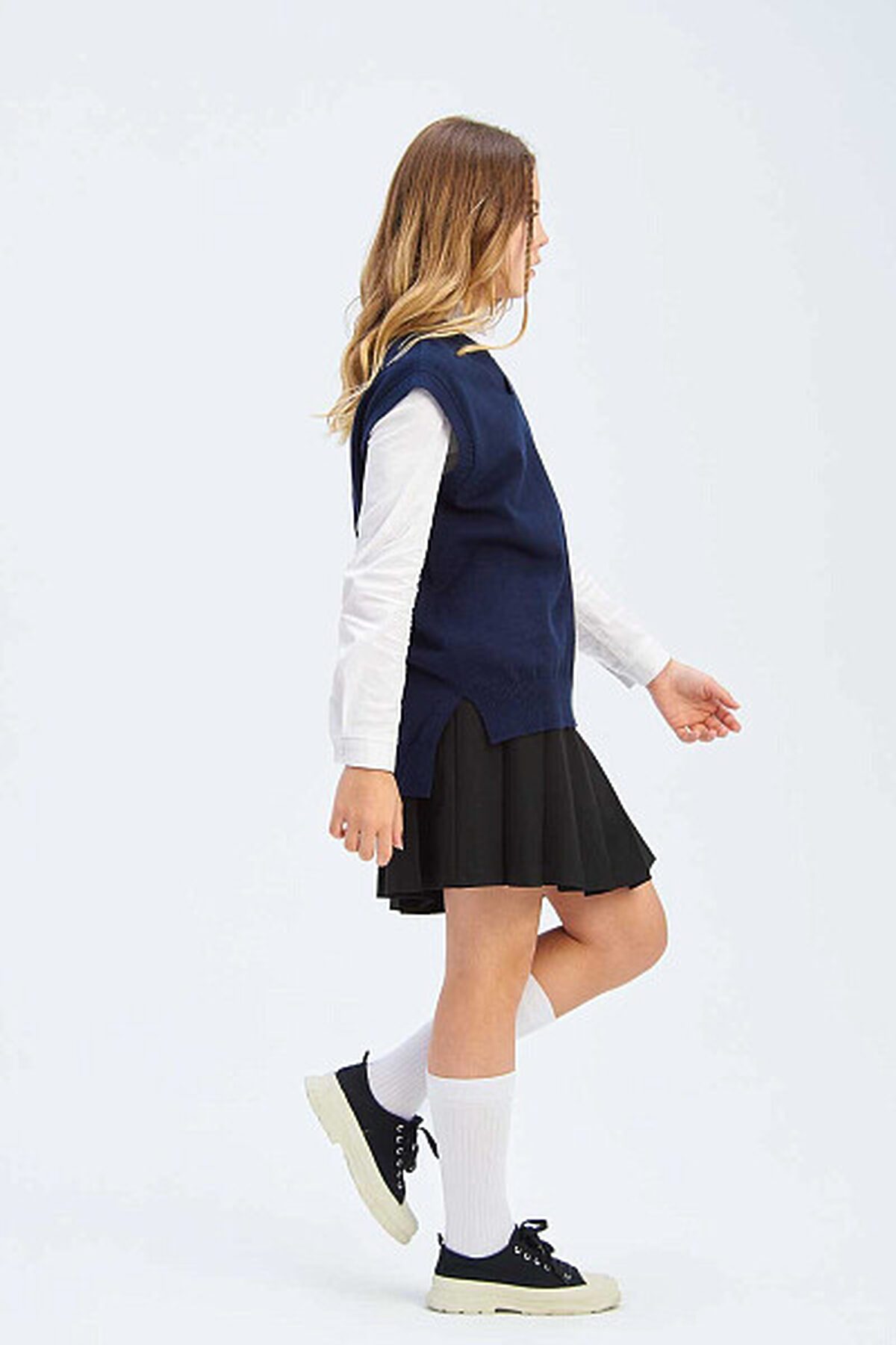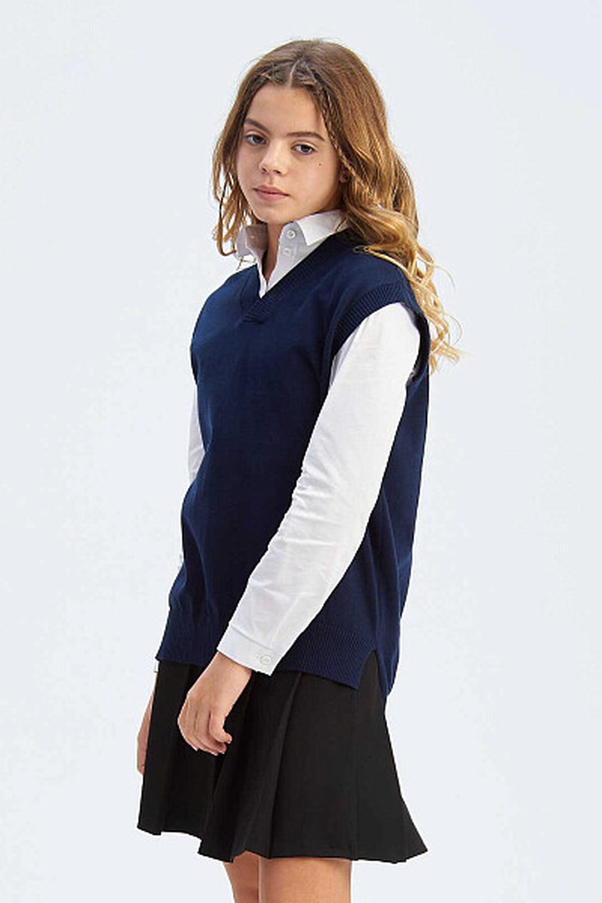 Вязаный жилет из смесового хлопка с V-образным вырезом. Ворот, пройма и низ изделия оформлены резинкой. Спинка чуть удлиненная. По бокам снизу небольшие разрезы.