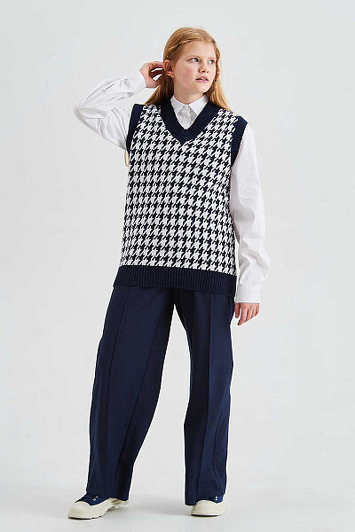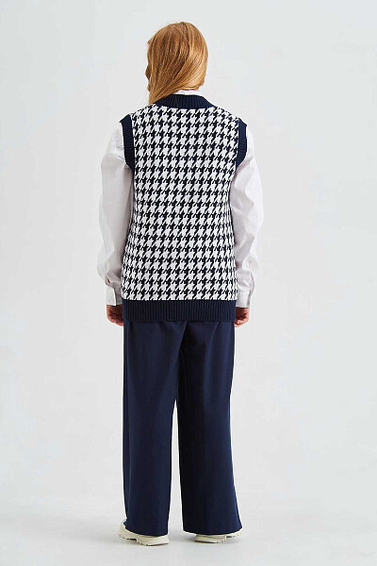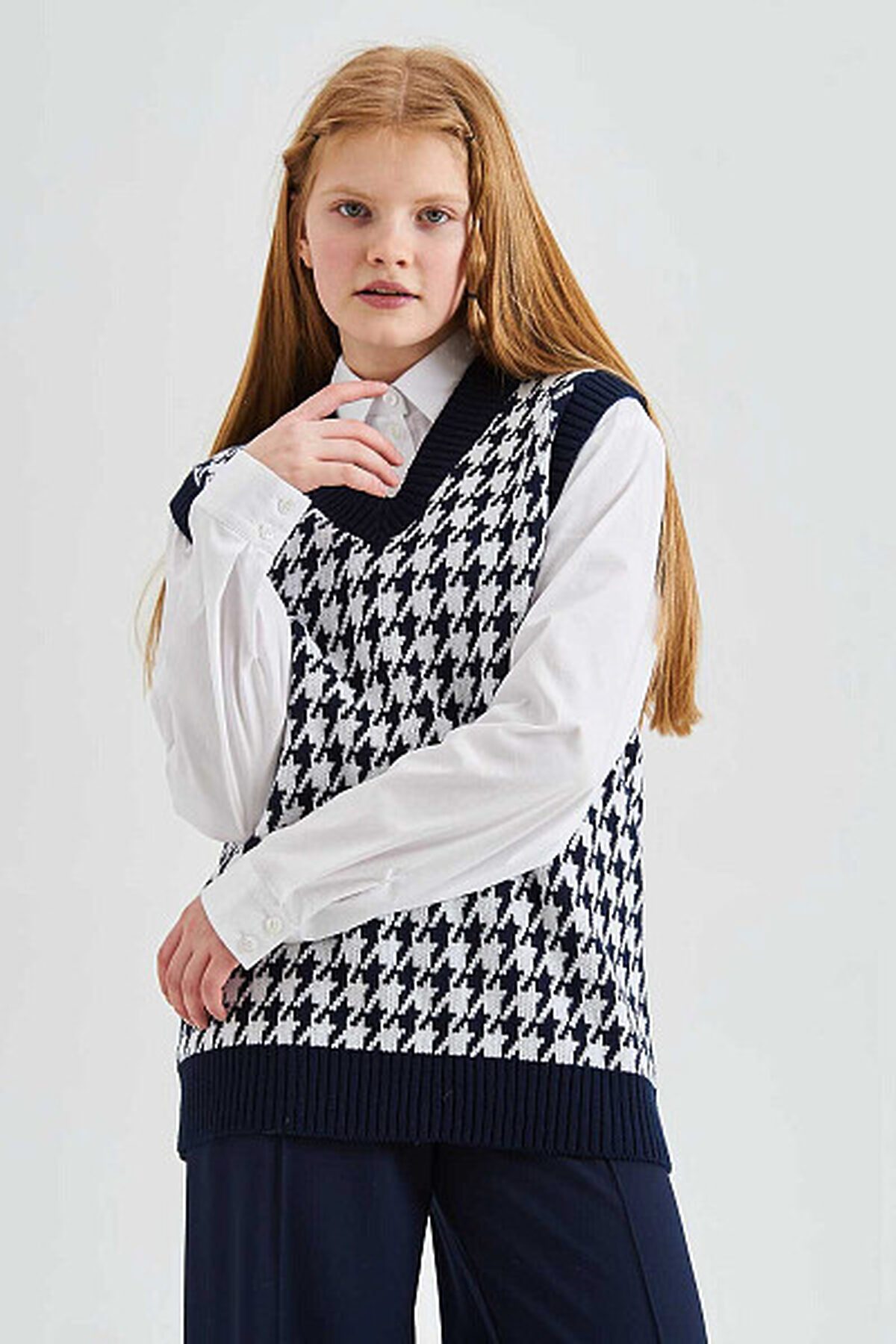 Вязаный жилет из смесового хлопка с V-образным вырезом. Ворот, пройма и низ изделия оформлены резинкой.