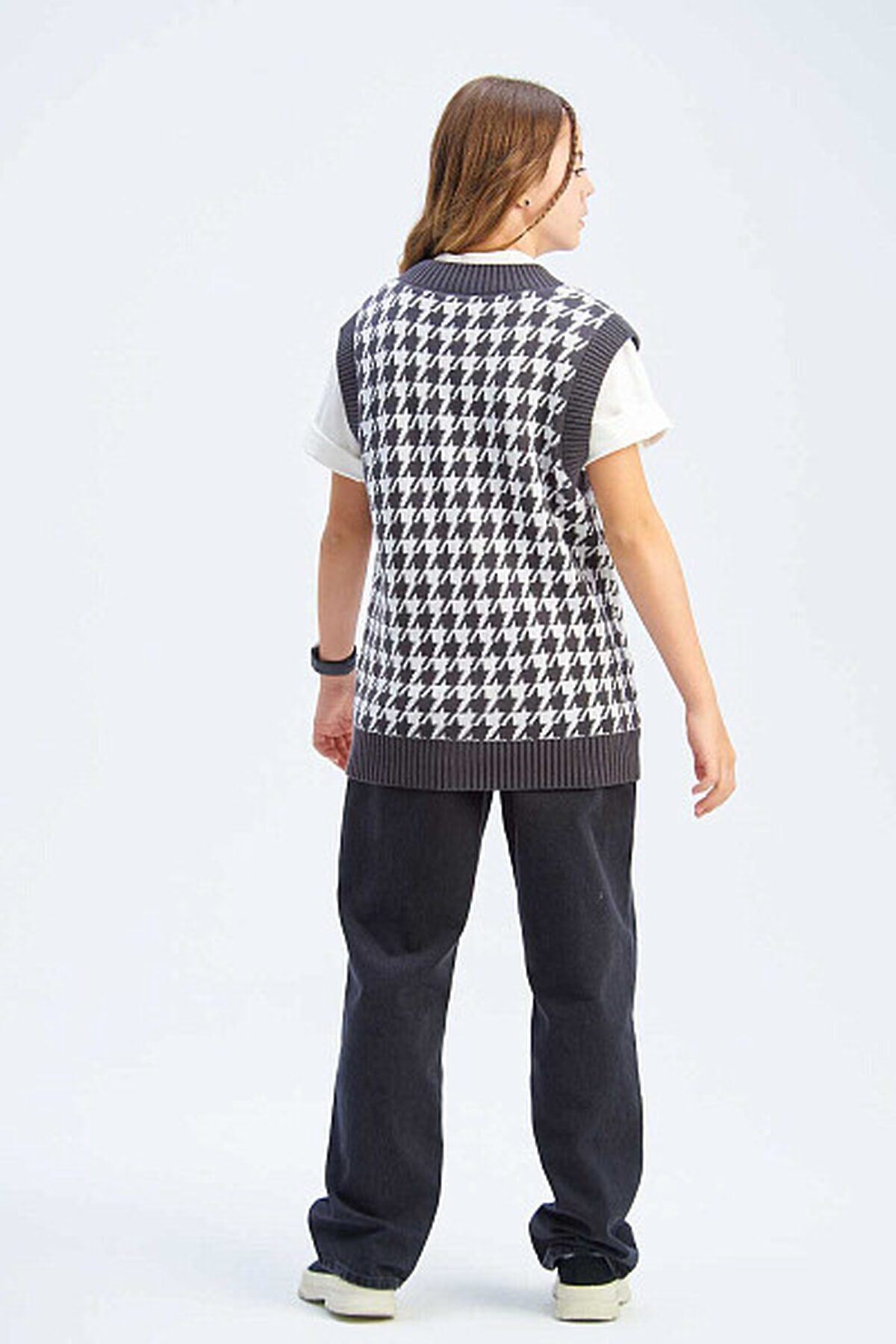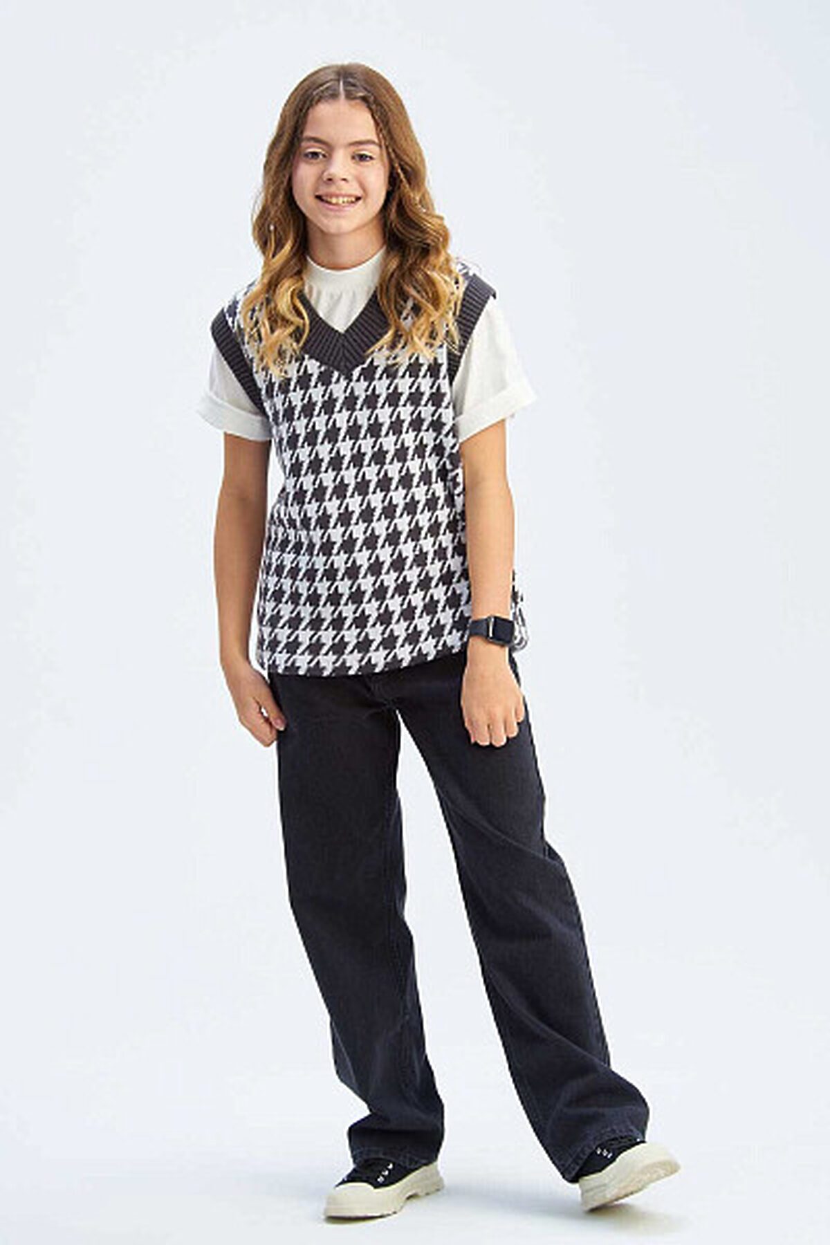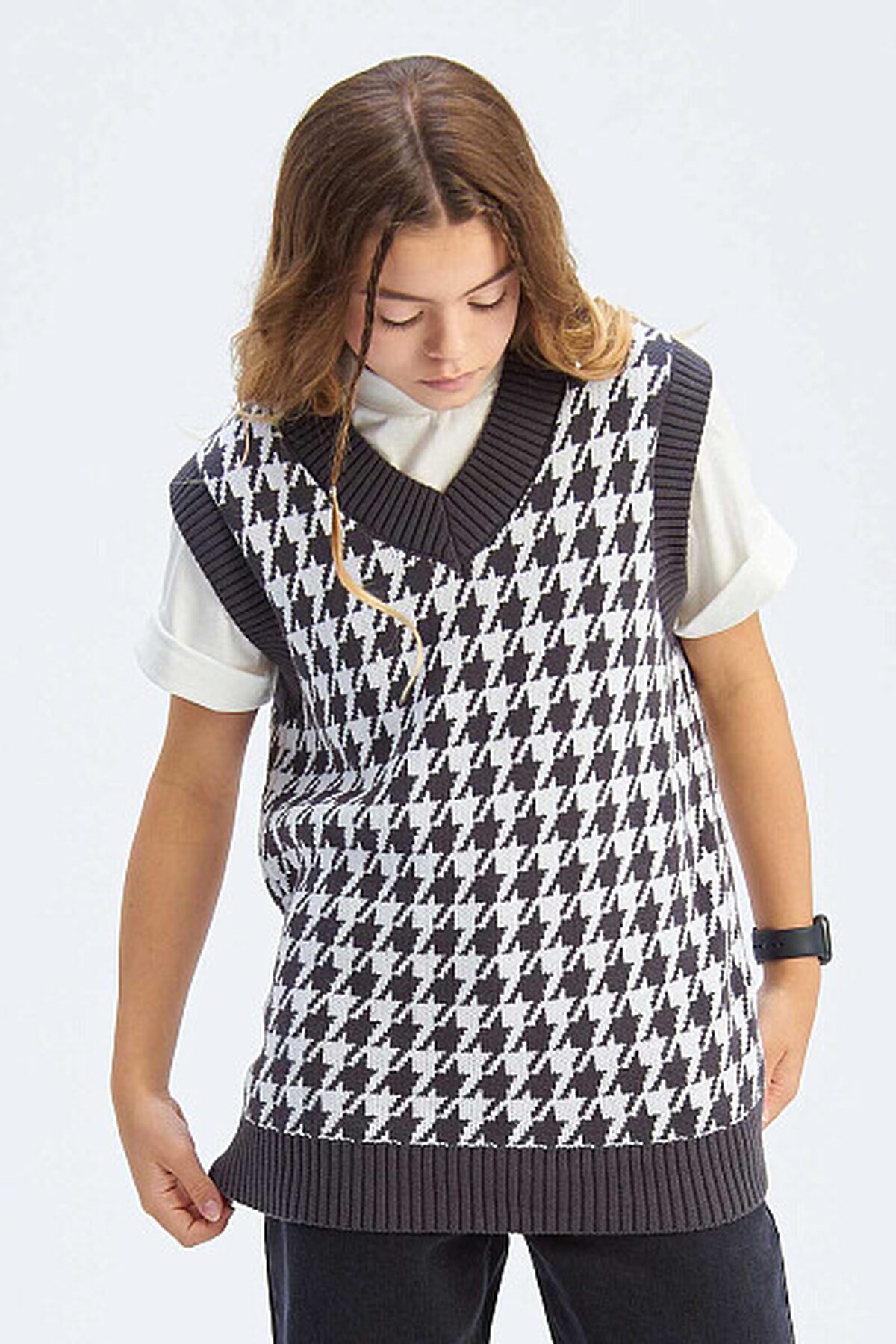 Вязаный жилет из смесового хлопка с V-образным вырезом. Ворот, пройма и низ изделия оформлены резинкой.