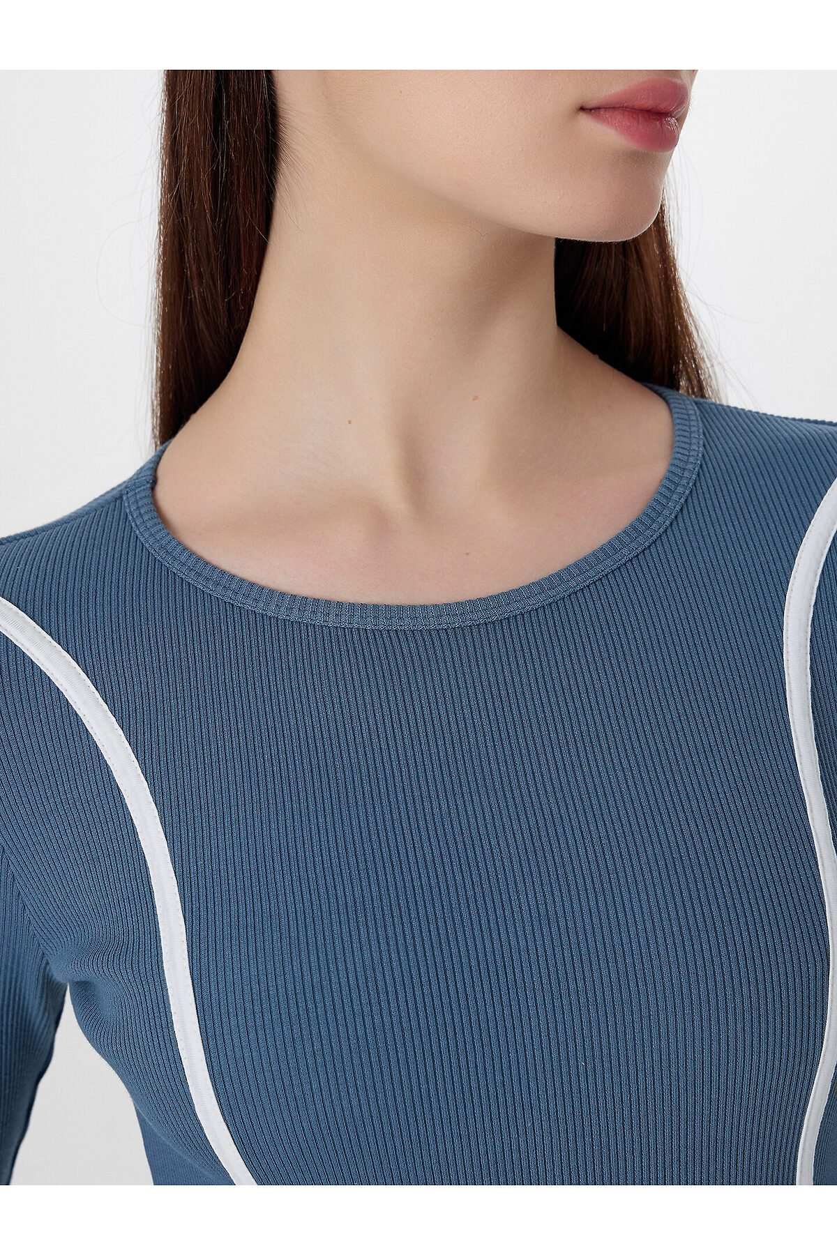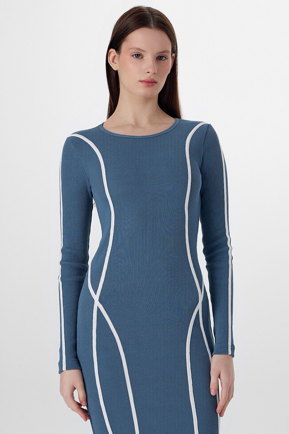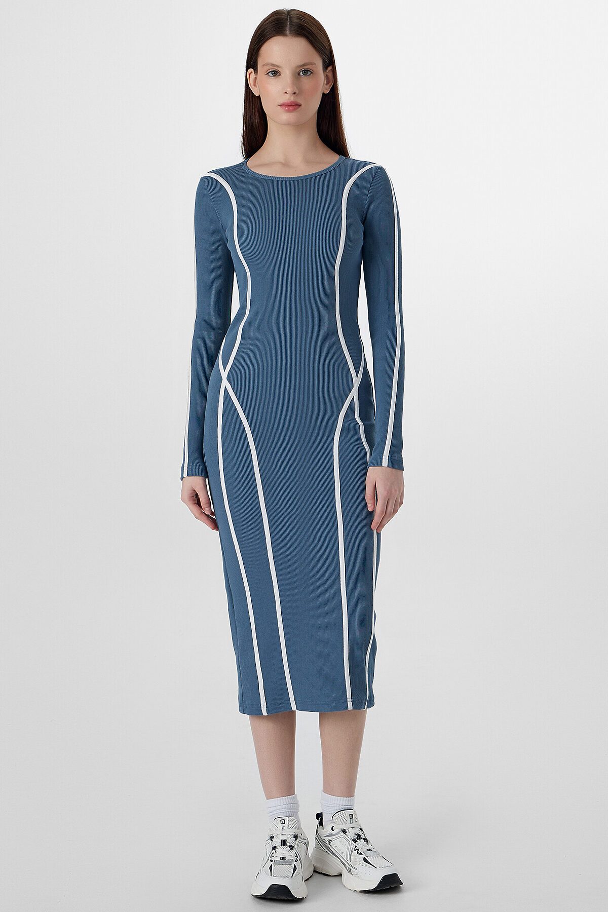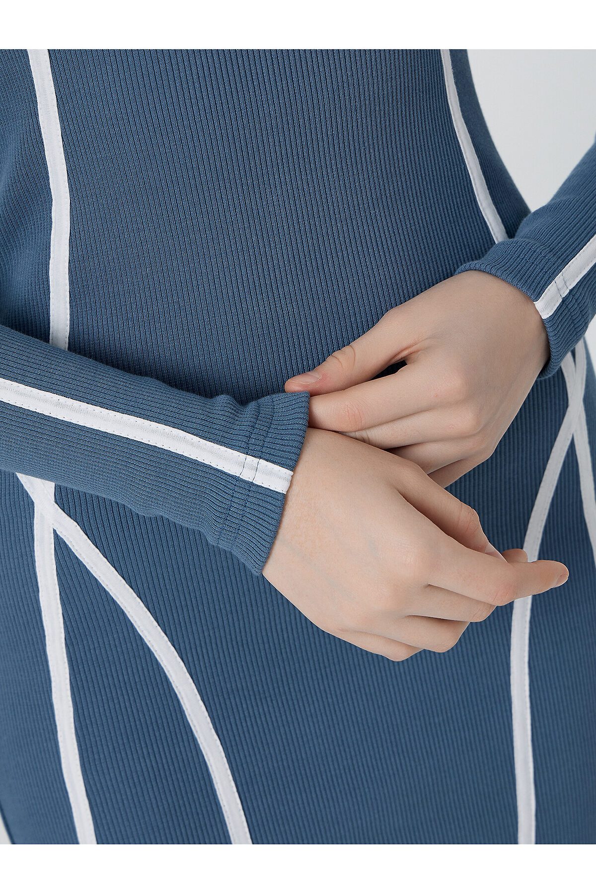 Платье женское прилегающего силуэта из рибаны. Длина миди. Рукава втачные, длинные. Горловина округлая, обработана обтачкой из основного полотна. По переду и спинке декоративные лампасы из кулирного полотна. Низ изделия и рукава обработаны швом вподгибку.