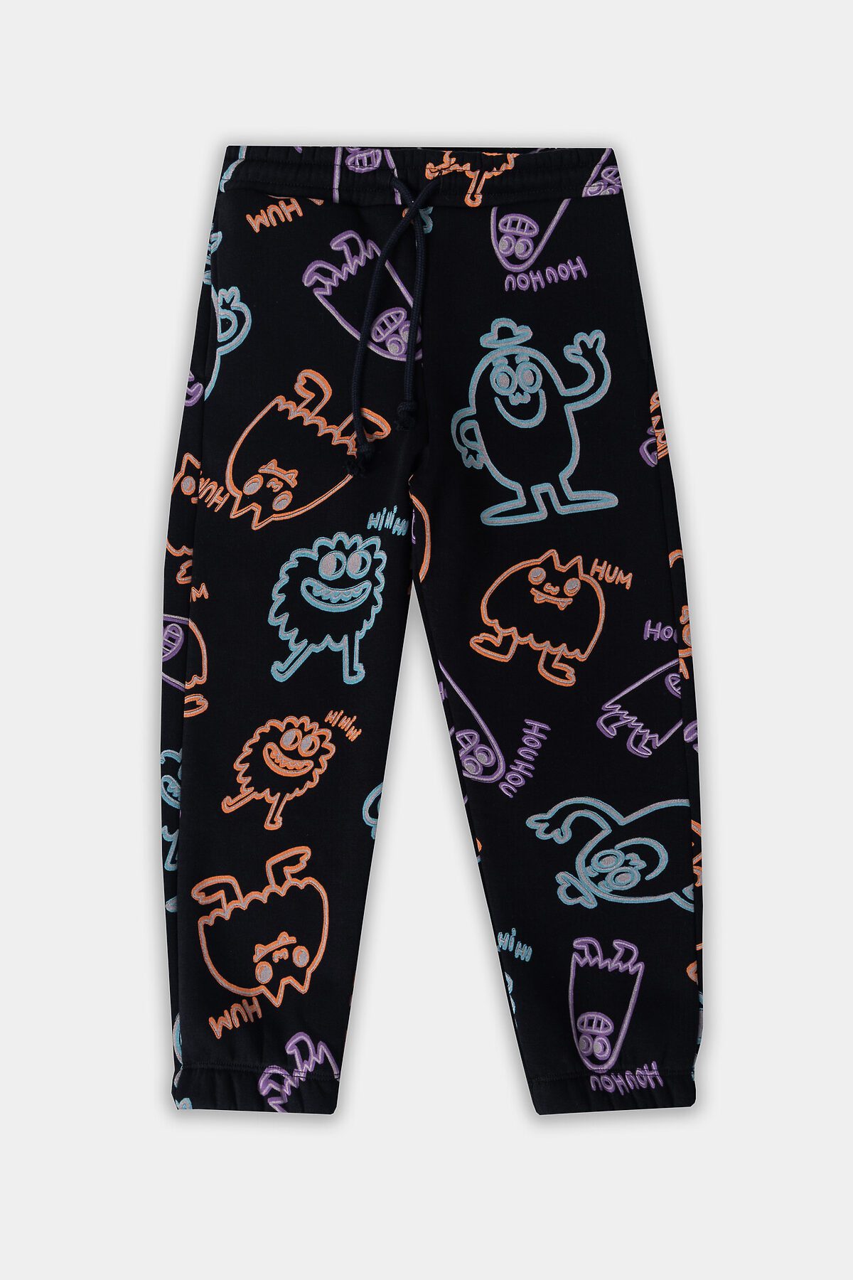 Брюки изготовлены из трикотажного полотна футер. Брюки свободного силуэта. Сиденье немного спущено. В боковых швах обработаны карманы. Подкладка карманов из кулирки. Пояс отрезной с эластичной тесьмой внутри. В передней части с лицевой стороны пробиты петли и втянут шнур (с застр. концами). Низ брюк обработан в подгибку с эластичной тесьмой внутри.