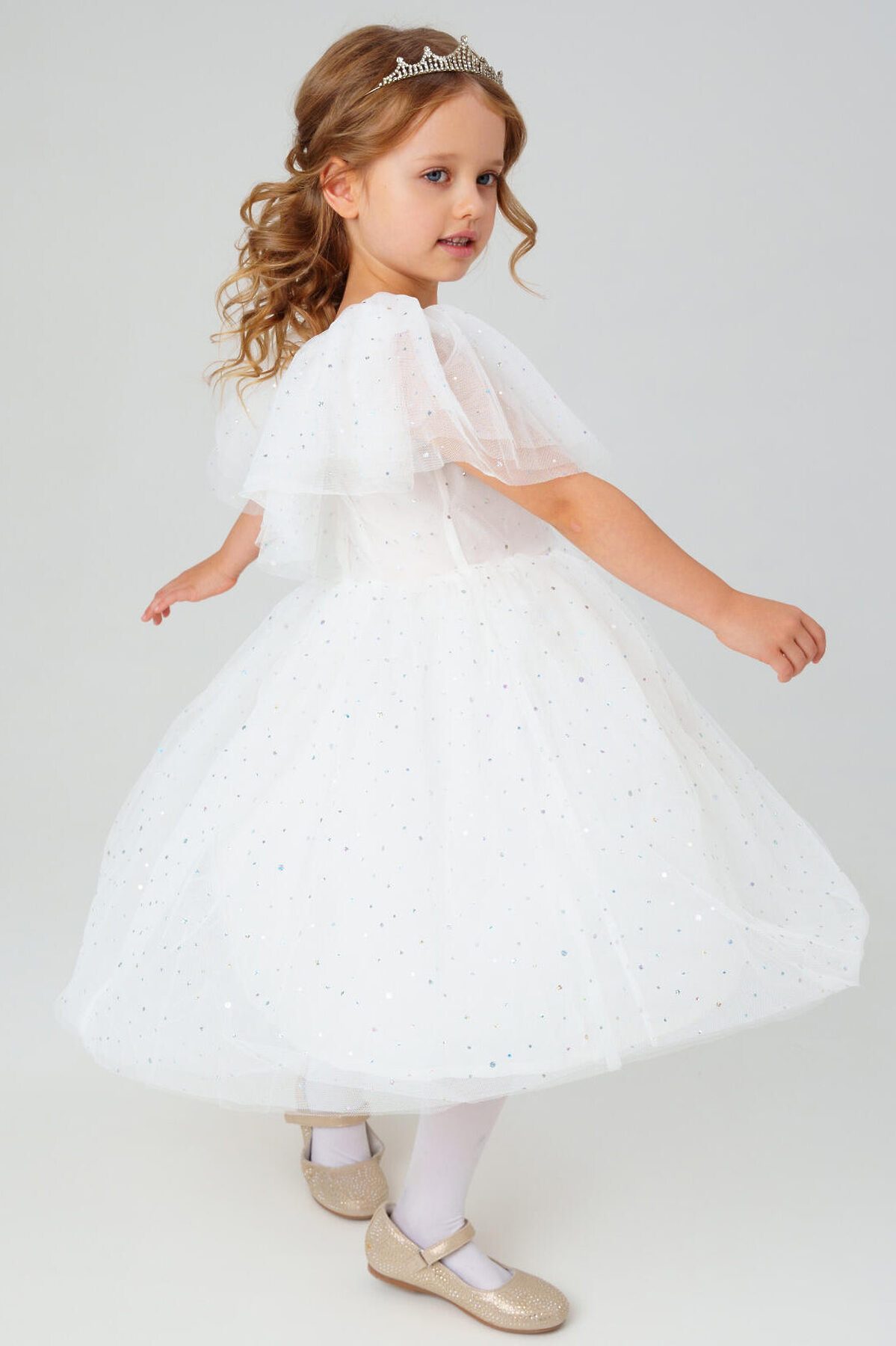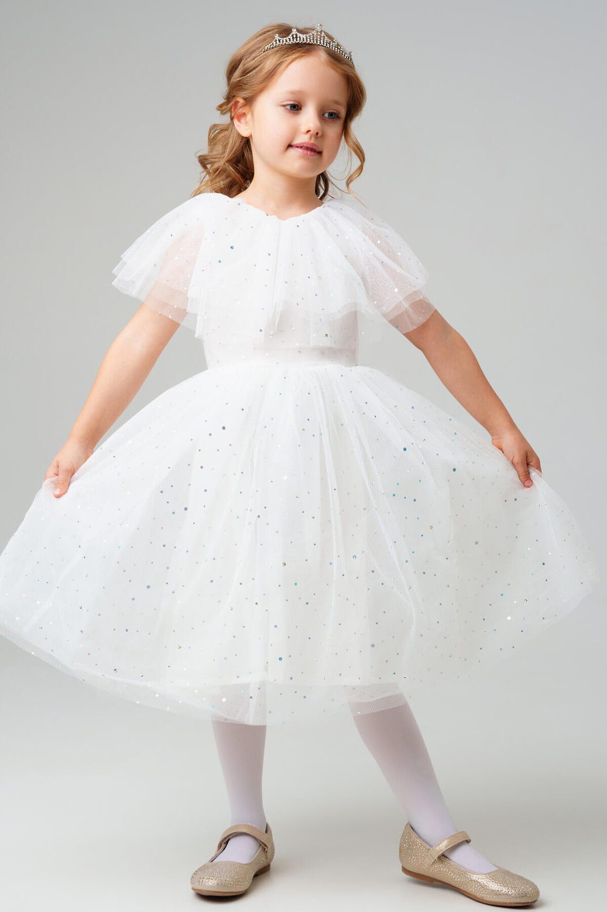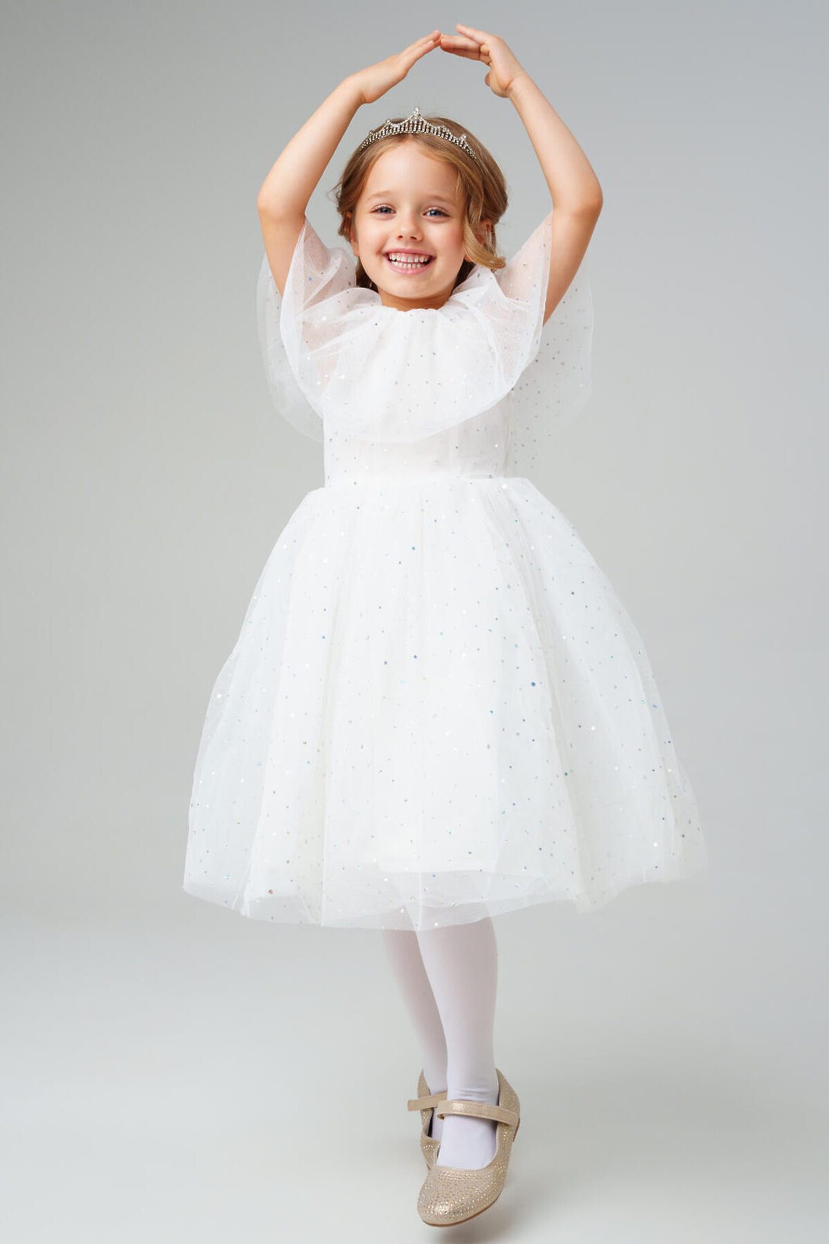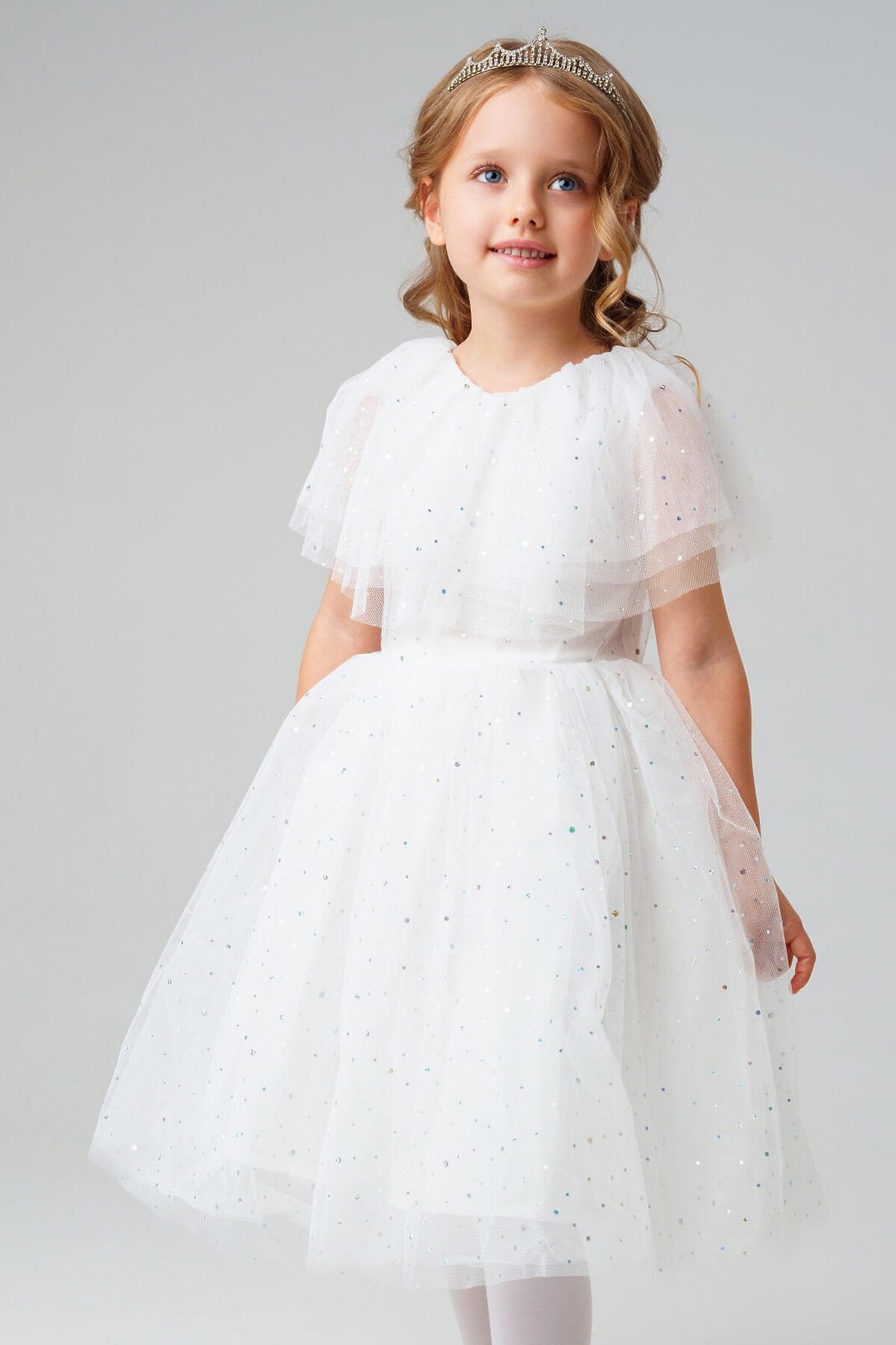 Нарядное белое детское платье для девочки от PlayToday — нежная и воздушная модель, созданная для особых случаев. Лёгкая сетчатая ткань с мерцающими блёстками делает платье праздничным и волшебным, а мягкая хлопковая подкладка обеспечивает комфорт даже при длительном ношении. Преимущества модели: + верх из полупрозрачной сетки с блестящим напылением — эффект звёздного сияния + мягкая подкладка из хлопкового поплина — приятна к телу, обеспечивает комфорт и воздухопроницаемость + пышная юбка из нескольких слоёв фатина создаёт объём и лёгкость силуэта + короткие рукава и аккуратный вырез — комфортная посадка без лишних деталей + лёгкий вес и мягкий материал — ребёнку удобно двигаться и играть Когда и как носить: Идеально подойдёт для праздников, утренников, фотосессий, дней рождения, Нового года и торжественных мероприятий. Можно дополнить аксессуарами для создания образа маленькой принцессы. Советы по стилю: Сочетайте с белыми или серебристыми балетками, туфельками или босоножками от PlayToday. Для завершения образа добавьте тонкий ободок или корону, а в прохладную погоду — лёгкий кардиган. Размерный ряд: 98–122 см. Белое детское платье PlayToday — воплощение лёгкости, блеска и сказочного настроения для особенных моментов.