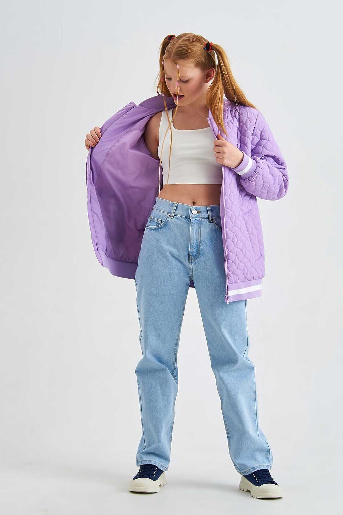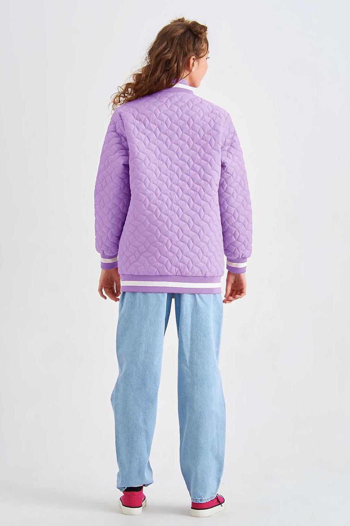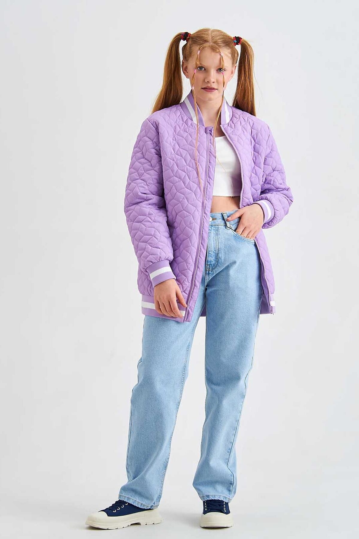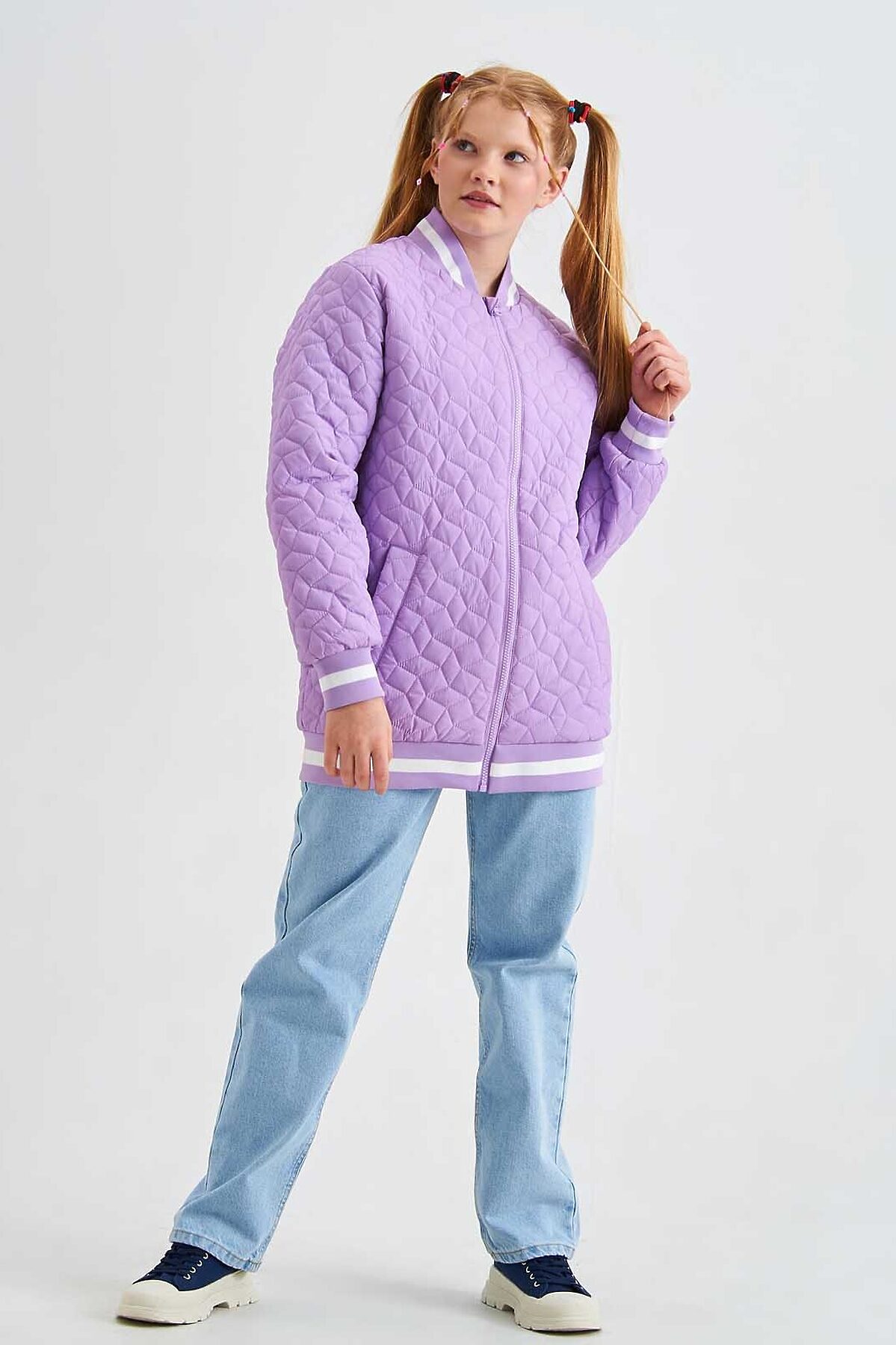 Легкая стеганная куртка -бомбер для девочки с яркими трикотажными подвязами. Дополнена двумя прорезными карманами.