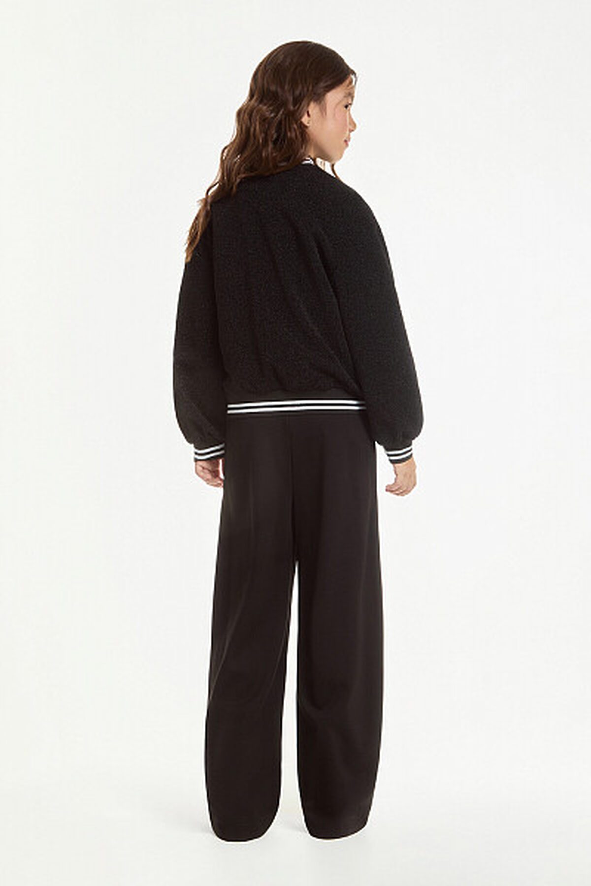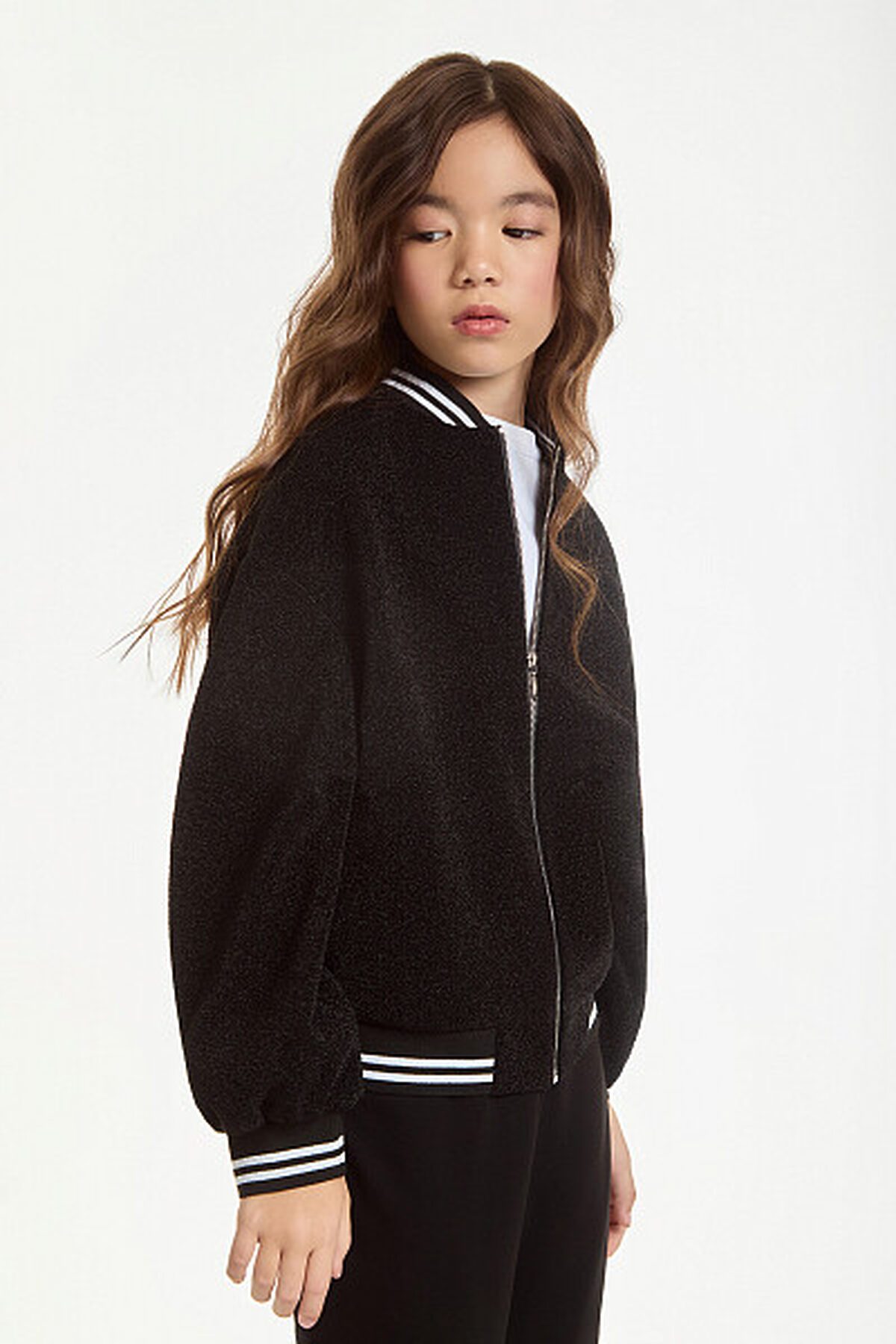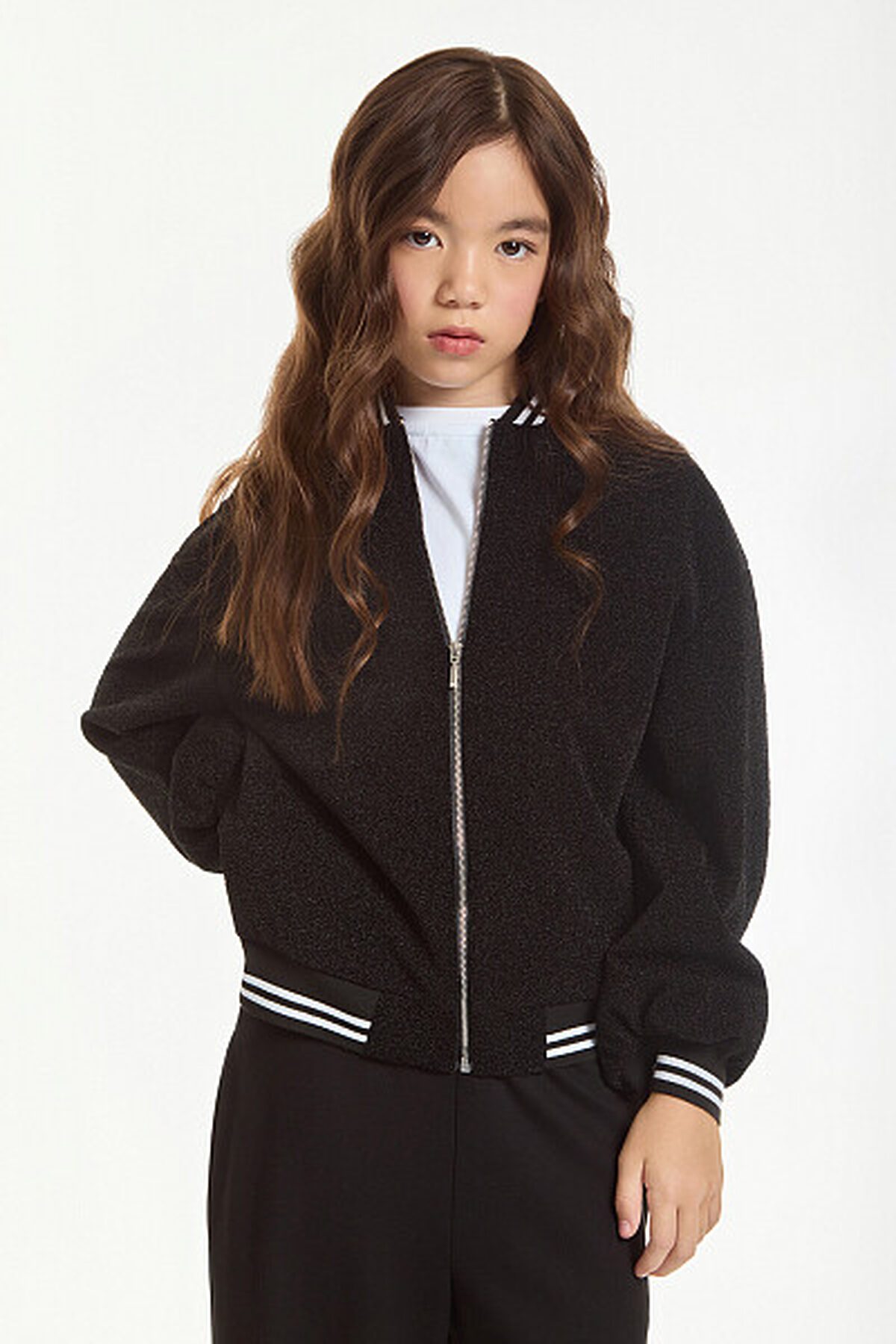 Бомбер для девочки свободного силуэта со спущенным плечем Выполнен из трикотажа. Застежка прямая на молнию. Манжет и воротник выполнен в тон изделия.