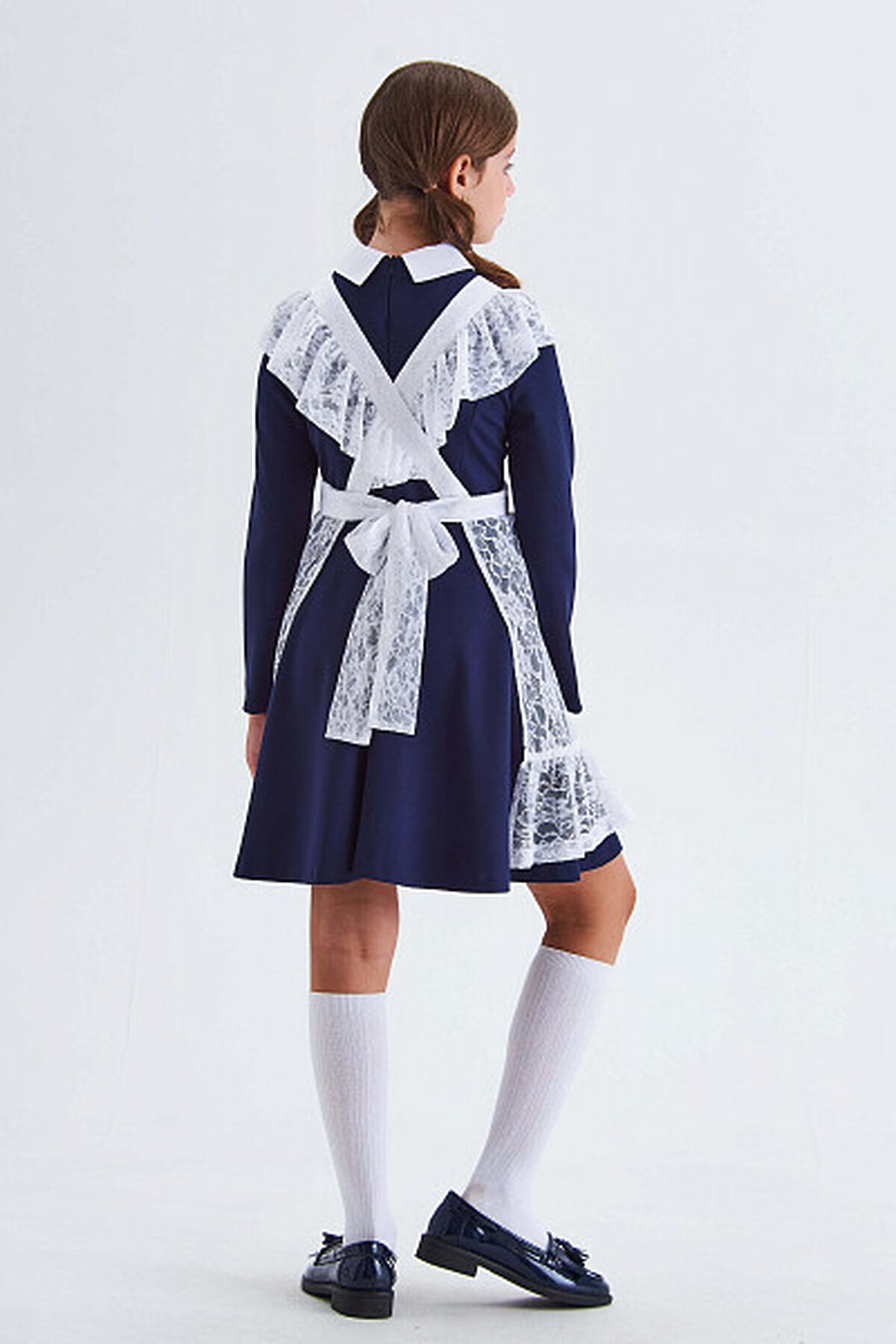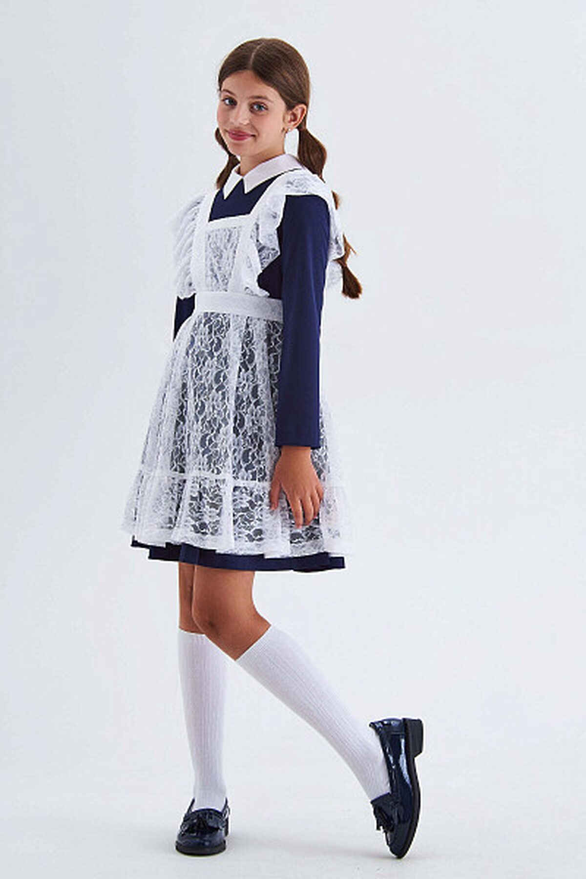 Нарядный фартук из гипюра. Грудка фартука двойная. Верх грудки обработан отрезной планкой, бретели и пояс состоят из двух частей: верхний слой из гипюра, нижний - из хлопчатобумажной ткани. К бретелям притачаны крылышки. По талии фартук регулируется поясом, который завязывается на бант сзади. Низ фартука украшен оборкой из основной ткани.