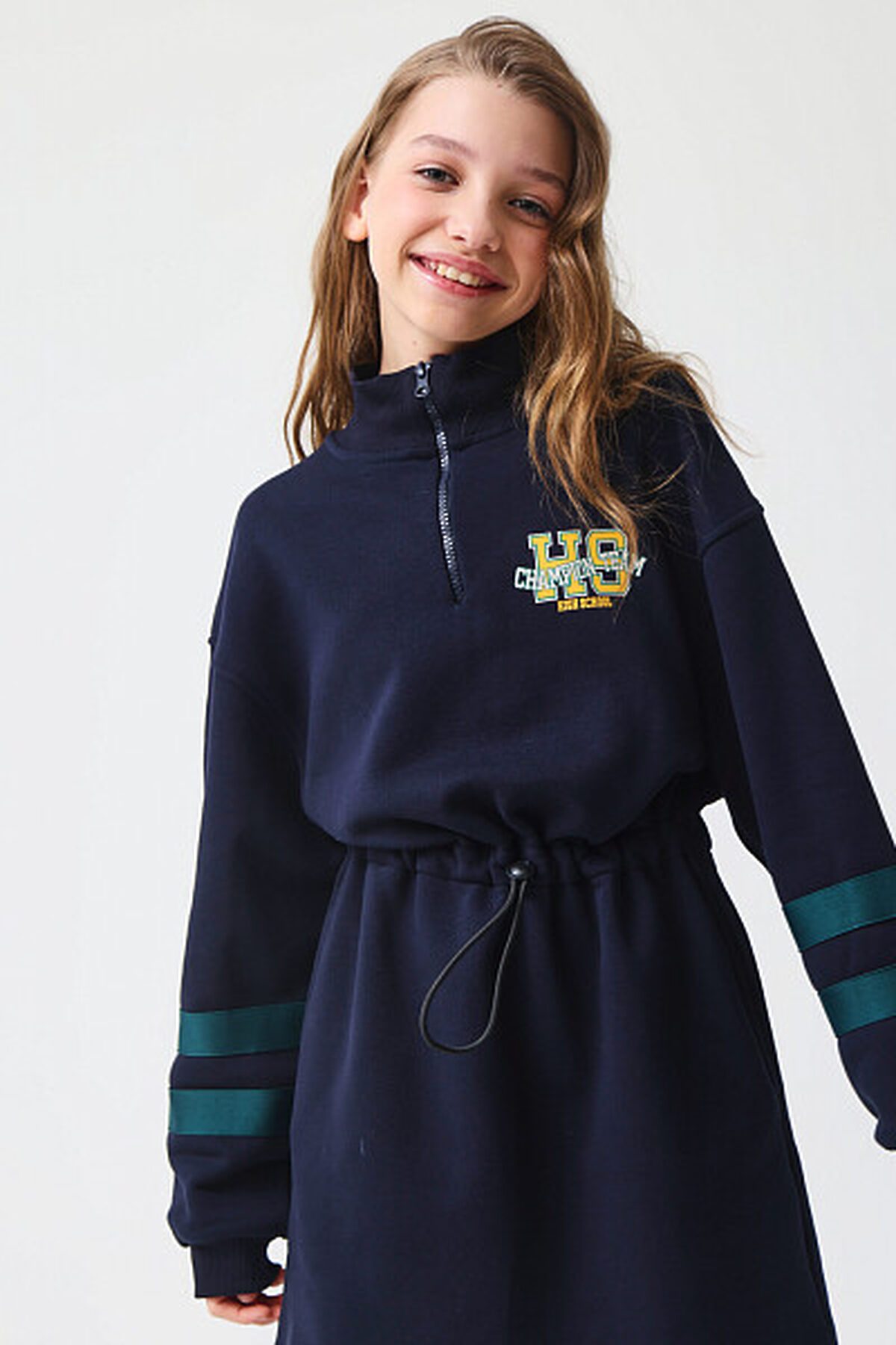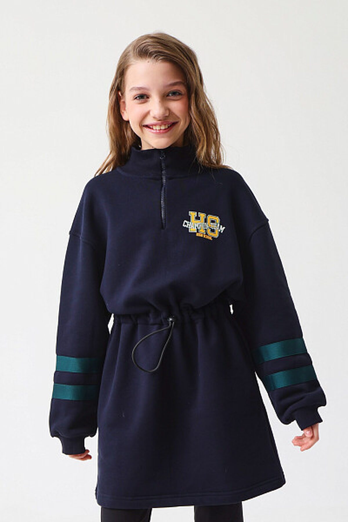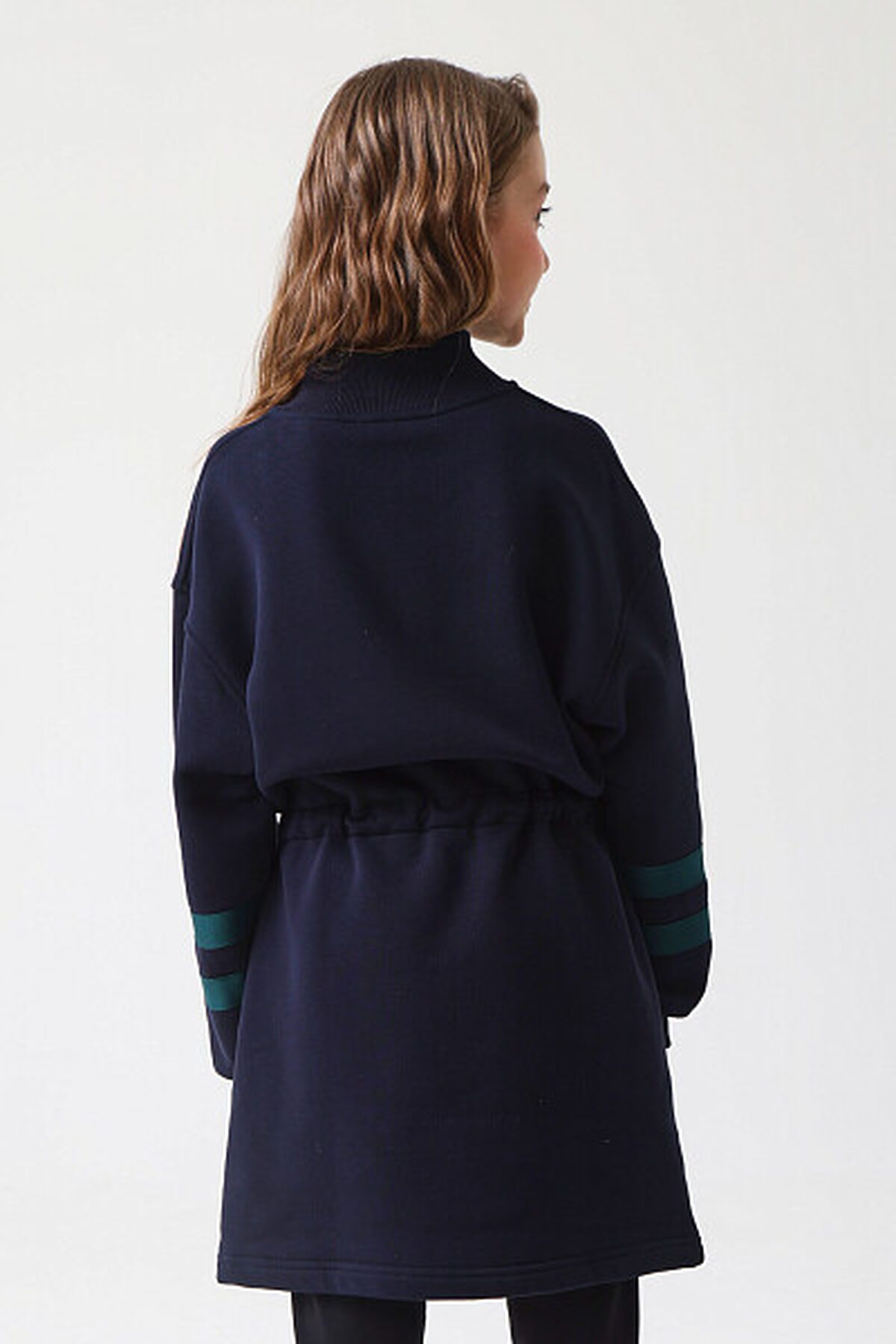 Платье с длинными рукавами из футера с начесом, идеально подходящее для холодного времени года. Модель дополнена центральной застежкой на молнию, а также воротником-стойкой. Платье имеет кулиску на уровне талии, что позволяет изменять силуэт от прямого до приталенного по желанию. В боковых швах расположены удобные карманы. Рукава оформлены контрастными полосками. Теплое платье идеально на зиму, а стильный принт на груди, сделает его интересным дополнением к зимнему гардеробу. Представлено в 2 цветах.