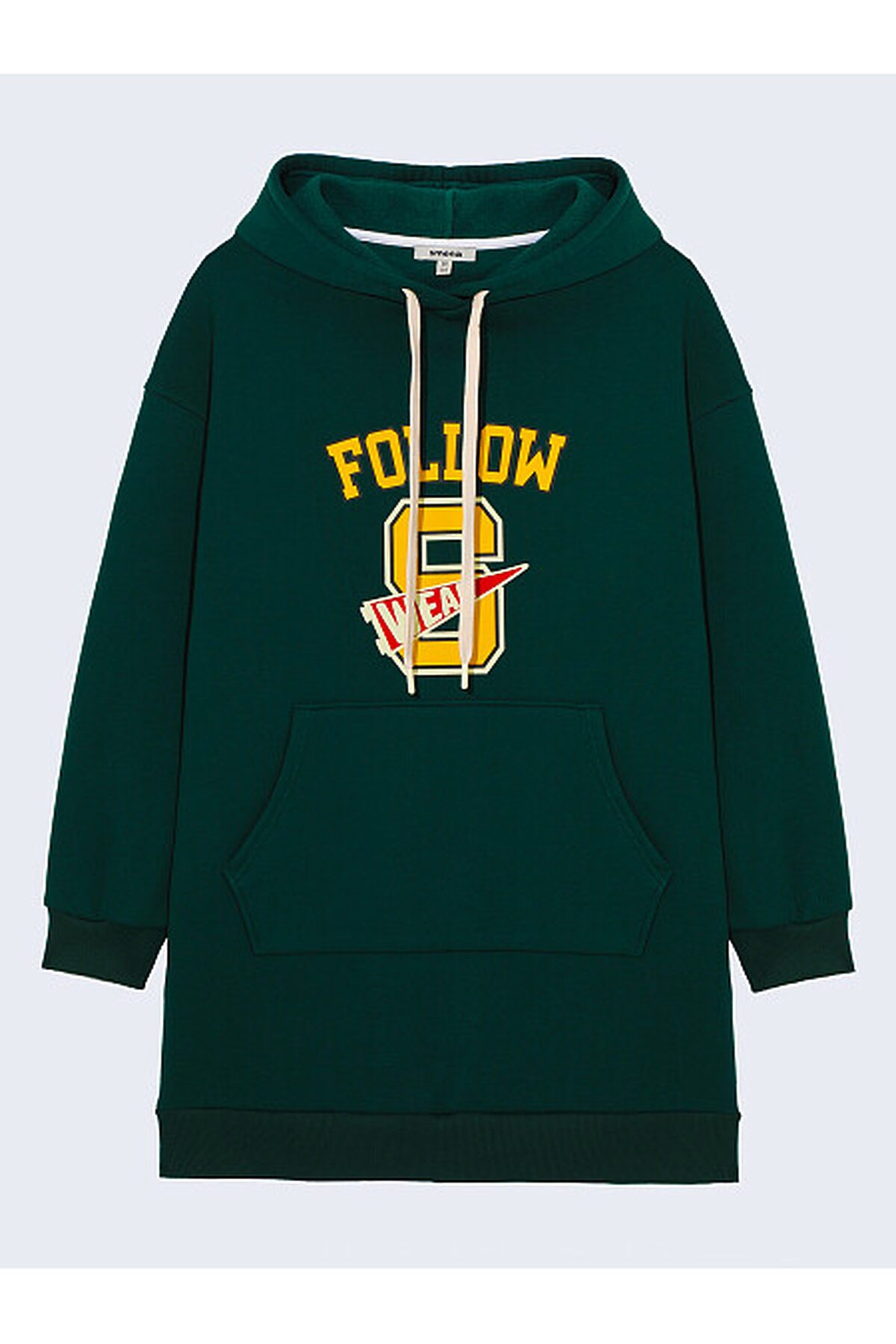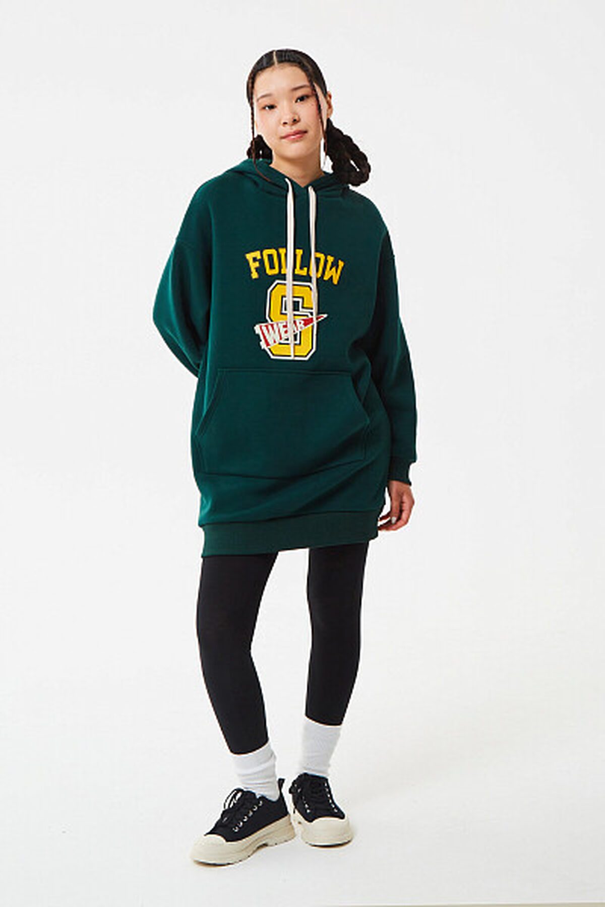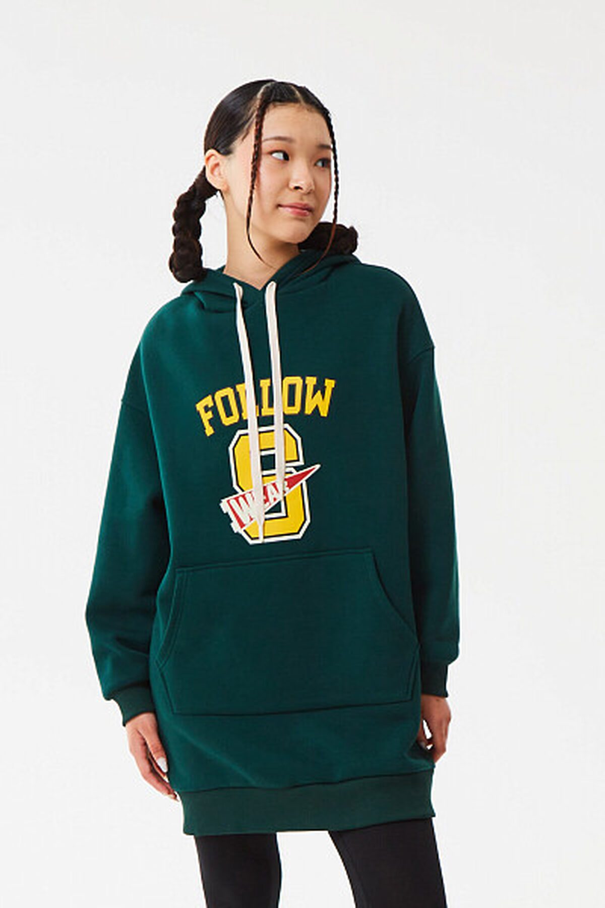 Платье прямого силуэта с длинными спущенными рукавами из футера - идеально для холодных сезонов. Модель без застежки, с объемным капюшоном со шнурком для регулировки и мягкими манжетами. Платье дополнено большим карманом-кенгуру и трендовым принтом на груди. Манжеты рукавов и низ платья выполнены из комфортного трикотажа «кашкорсе». Плотная ткань обеспечивает комфортную посадку и сохранение формы. Представлено в 2 цветах