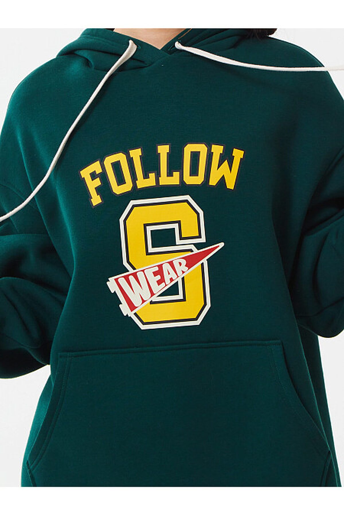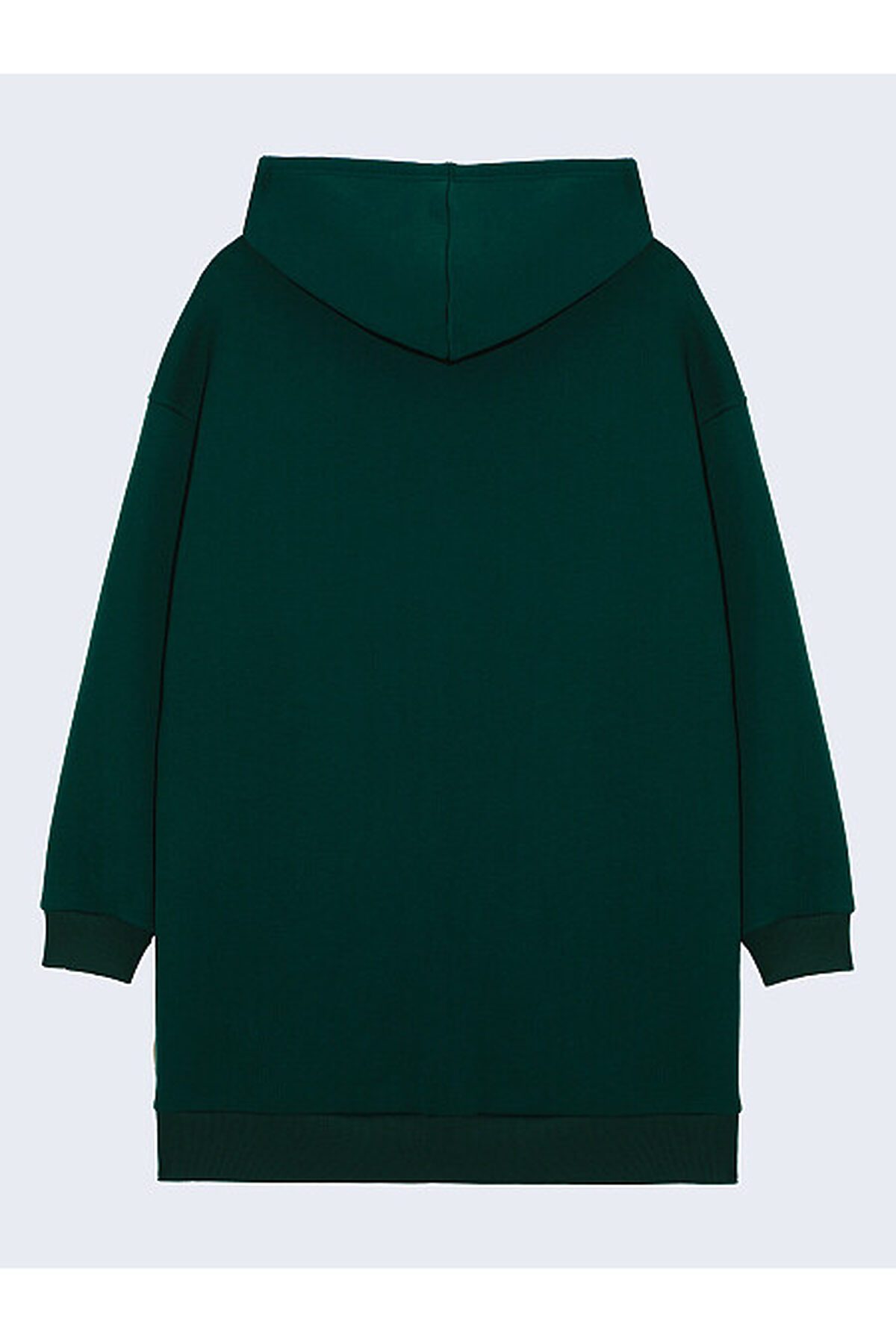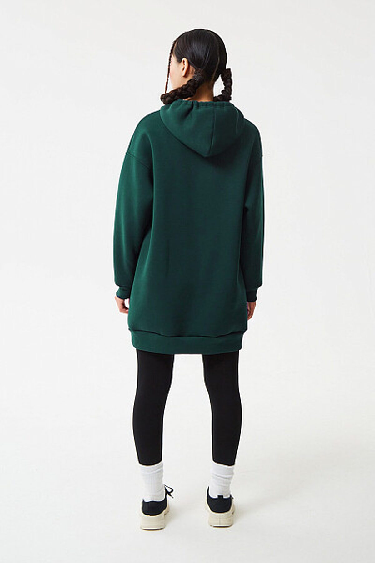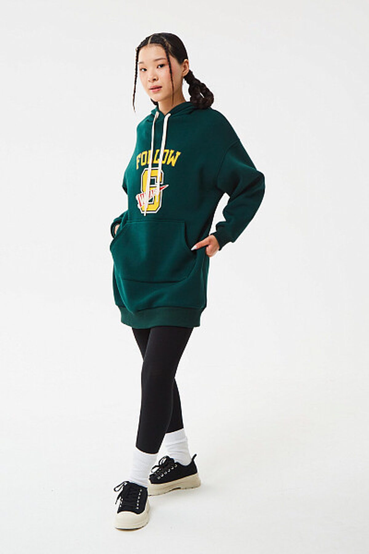 Платье прямого силуэта с длинными спущенными рукавами из футера - идеально для холодных сезонов. Модель без застежки, с объемным капюшоном со шнурком для регулировки и мягкими манжетами. Платье дополнено большим карманом-кенгуру и трендовым принтом на груди. Манжеты рукавов и низ платья выполнены из комфортного трикотажа «кашкорсе». Плотная ткань обеспечивает комфортную посадку и сохранение формы. Представлено в 2 цветах