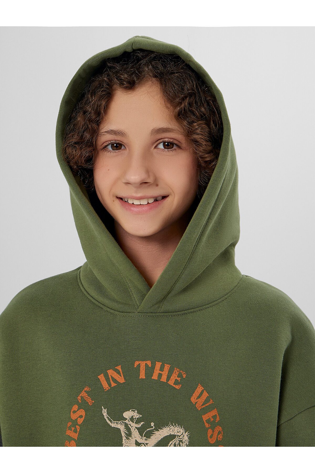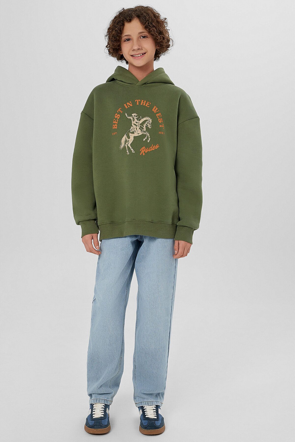 Худи свободного силуэта для мальчиков. Изготовлено из легкого трикотажного футера без подчеса. Есть удобный капюшон, который состоит из двух частей, а спереди идет внахлест. Рукава длинные, на манжетах из рибаны – как и пояс по нижнему срезу. Линия плеча слегка спущена, а плечевые швы перенесены вперед, что гарантирует свободу движений. Изюминкой модели является вместительный карман-кенгуру. Рекомендуем!