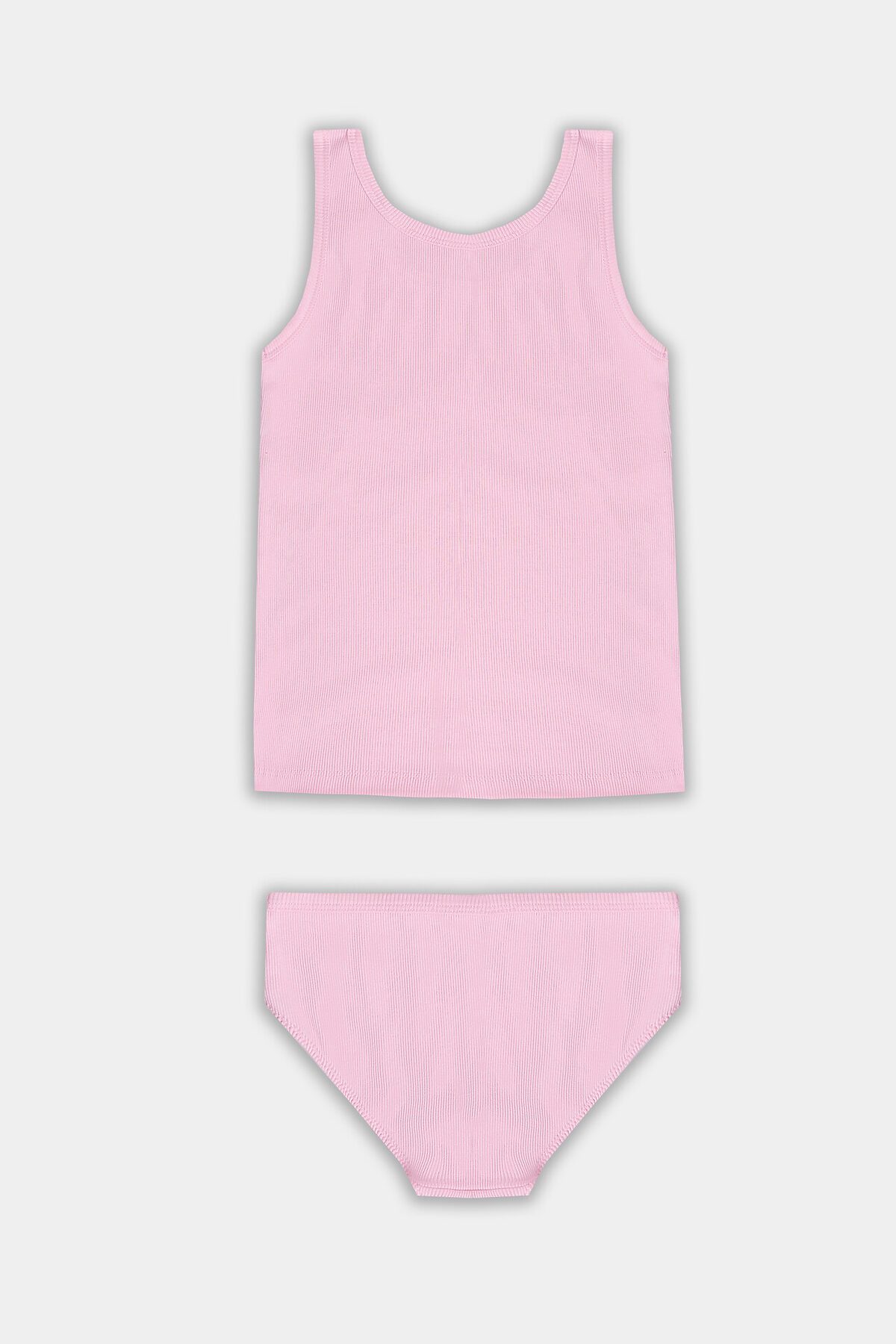 Майка прилегающего силуэта без рукавов. Длина до середины бедер. Горловина круглая. Проймы и горловина окантованы бейкой из основного полотна. Низ изделия обработан на 2х игольной плоскошовной машине. Трусы для девочек. Деталь переда цельнокроеная. Ластовица из трикотажного кулирного полотна. Задняя деталь цельнокроенная. Верхний срез трусов обработан окантовкой из основного полотна с эластичной тканой жилкой внутри. Нижние срезы трусов обработаны тканой жилкой