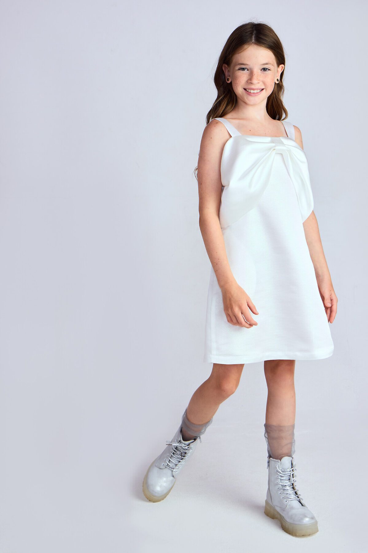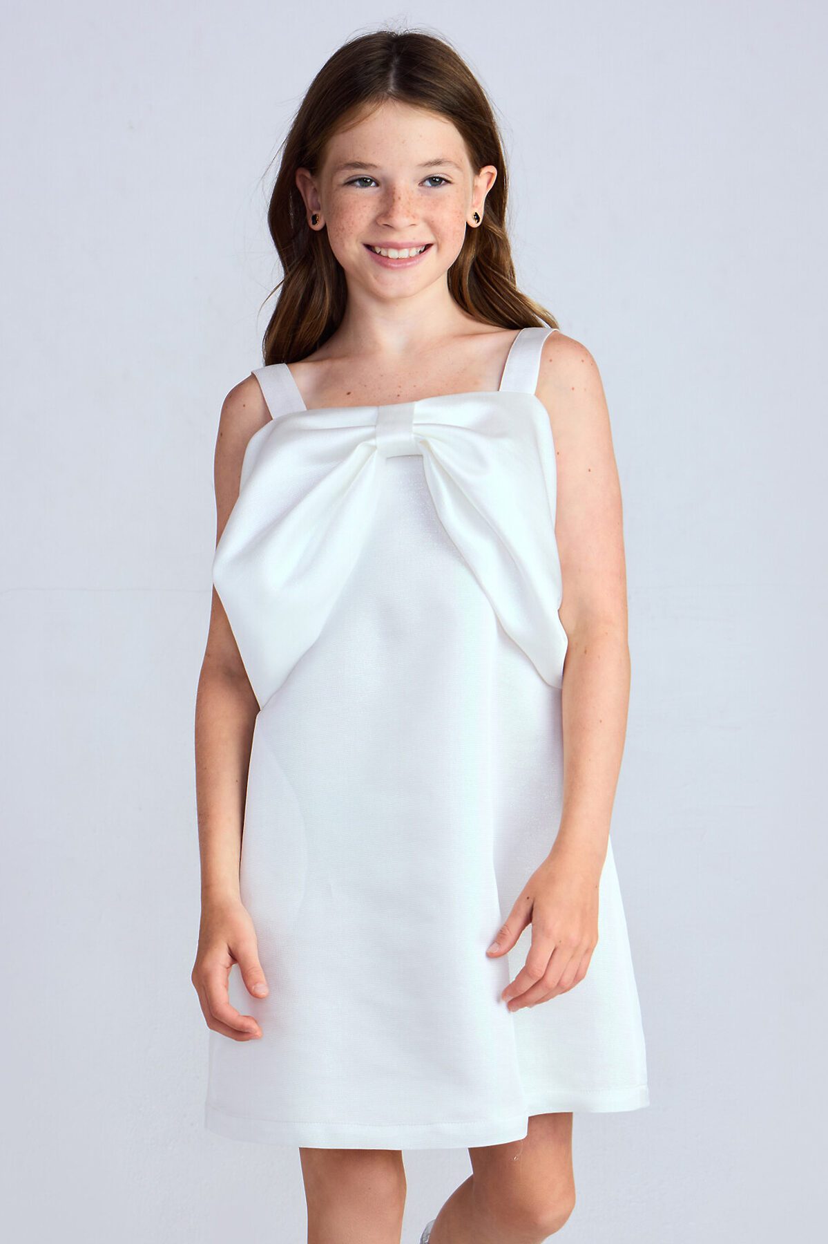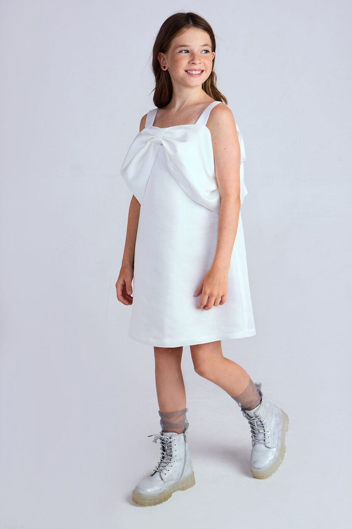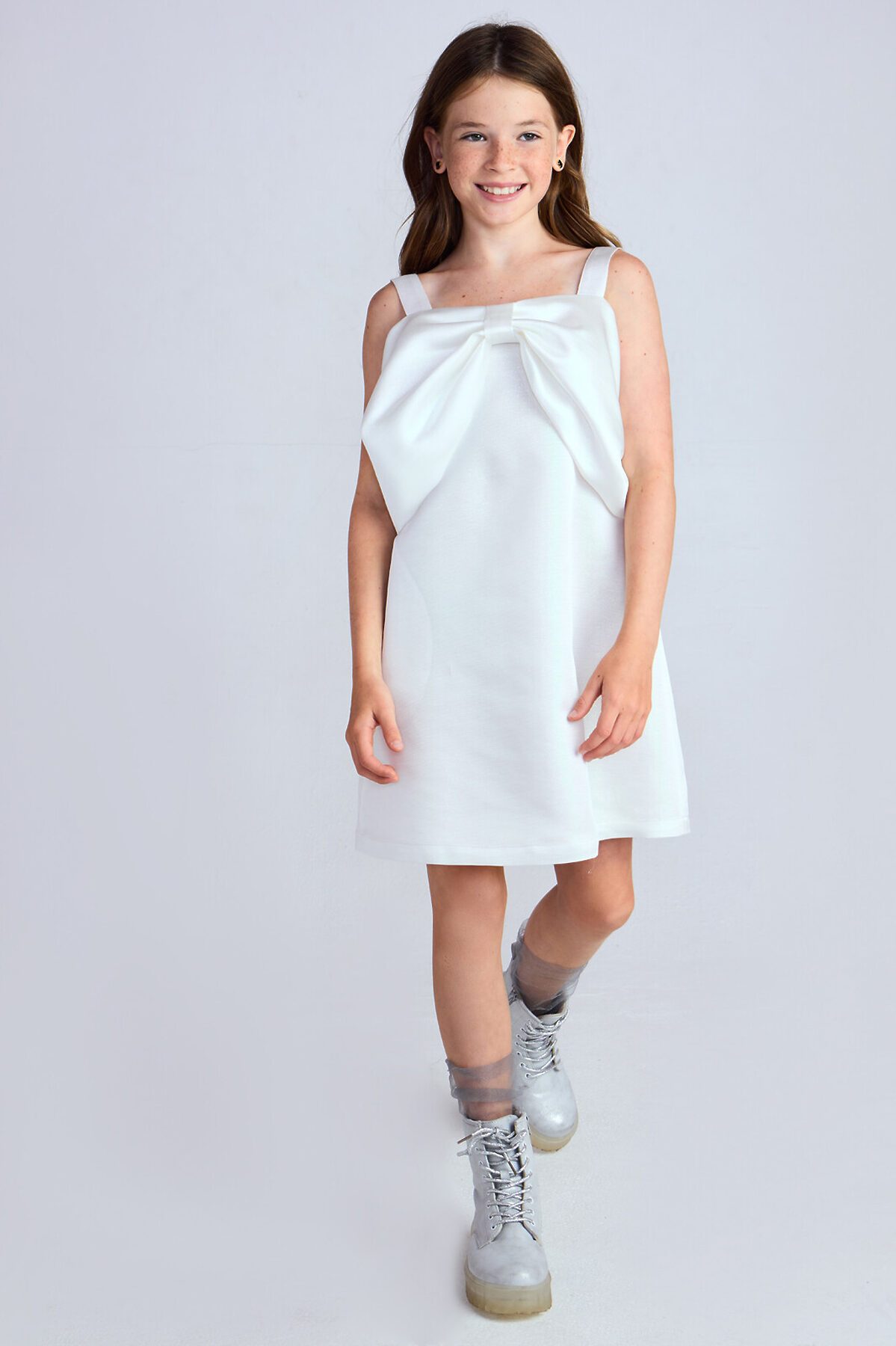 Мини-платье из жаккарда с люрексом, подкладка из хлопка. Платье на бретелях силуэта трапеция c застежкой на потайную молнию. Особенность этого платья — декоративный крупный бант на груди. Его можно носить по-разному: наденьте поверх плеч или просуньте в него руки.