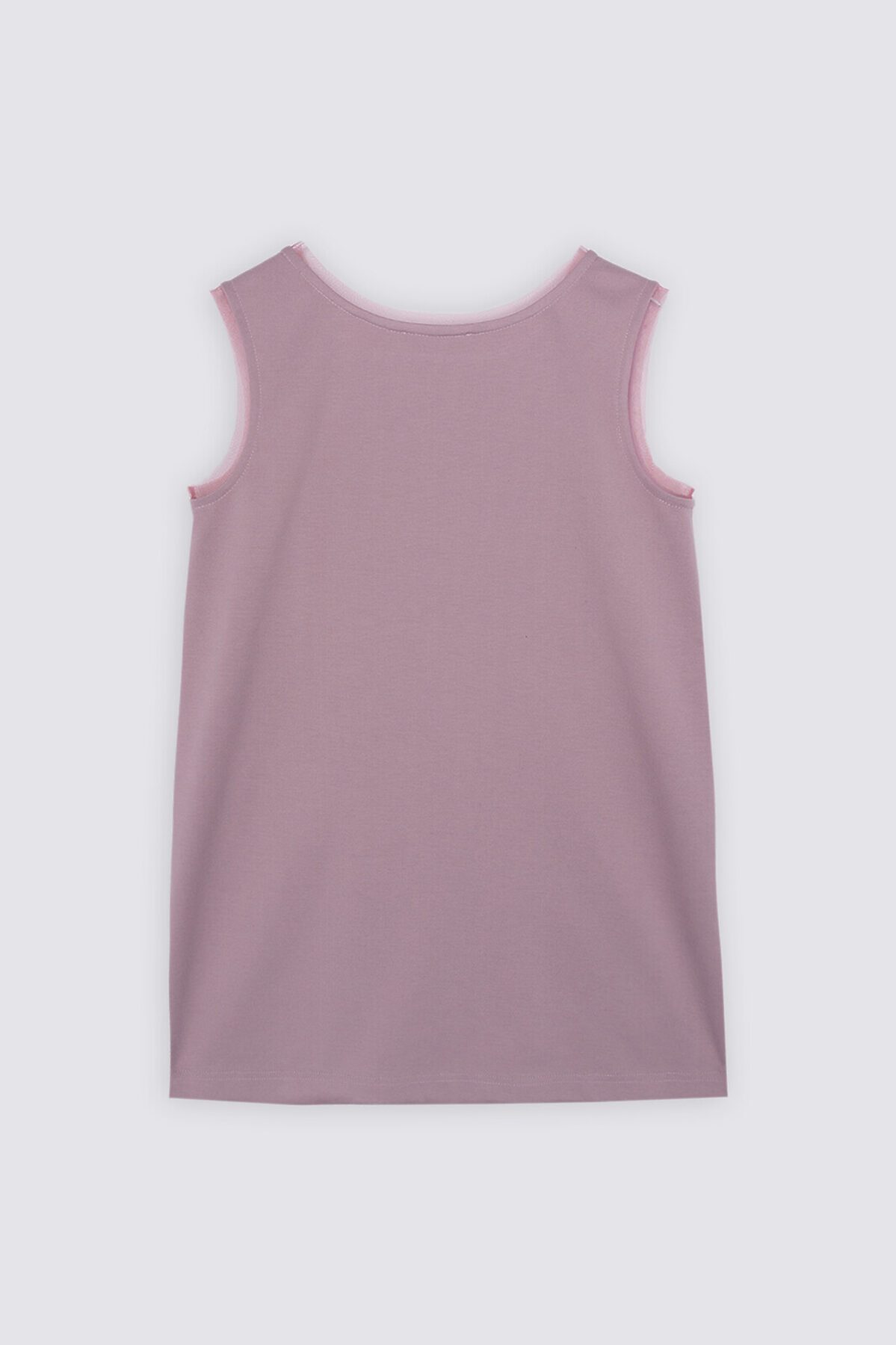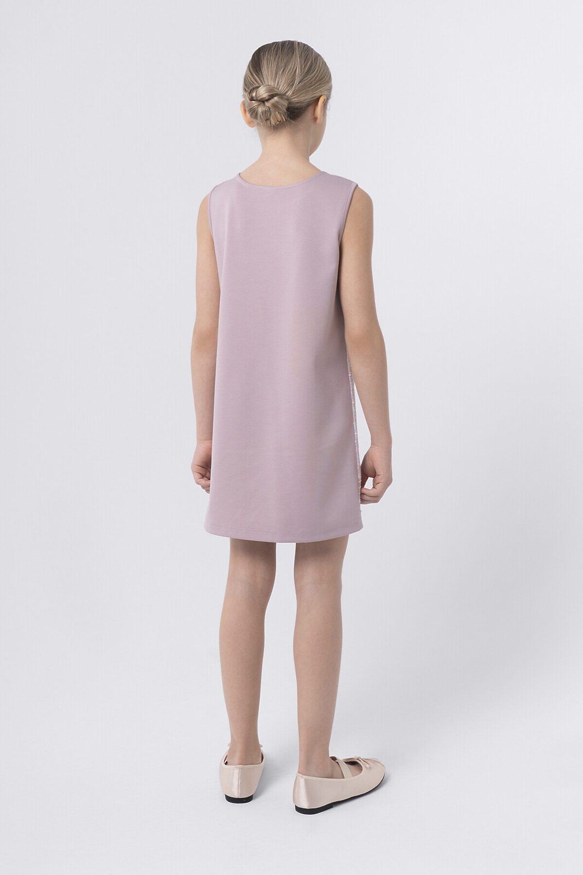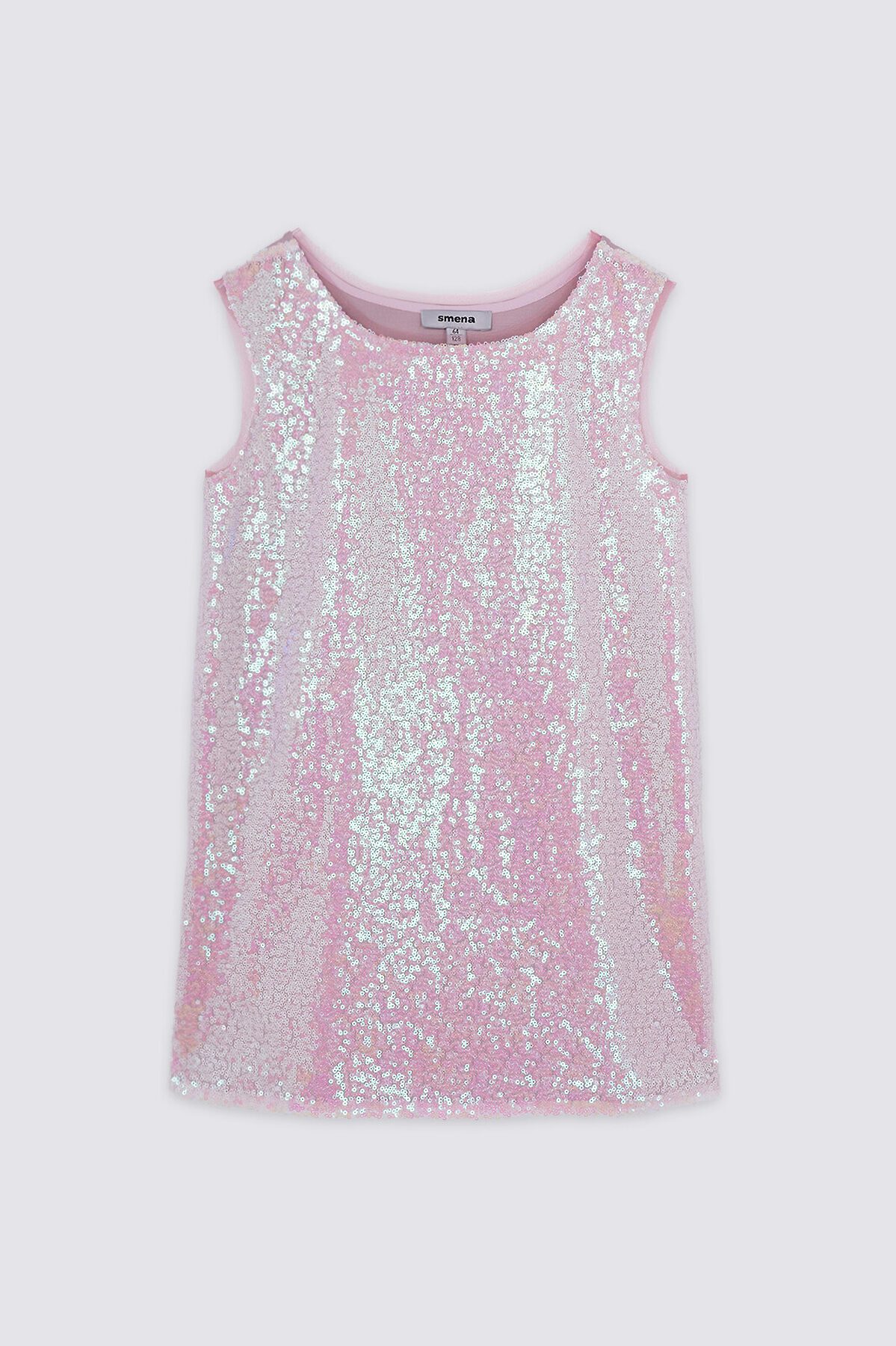 Трикотажное мини-платье без рукавов. Актуальная модель свободного силуэта, который слегка расширяется к низу, без застежки. Спереди на сарафане пайетки.