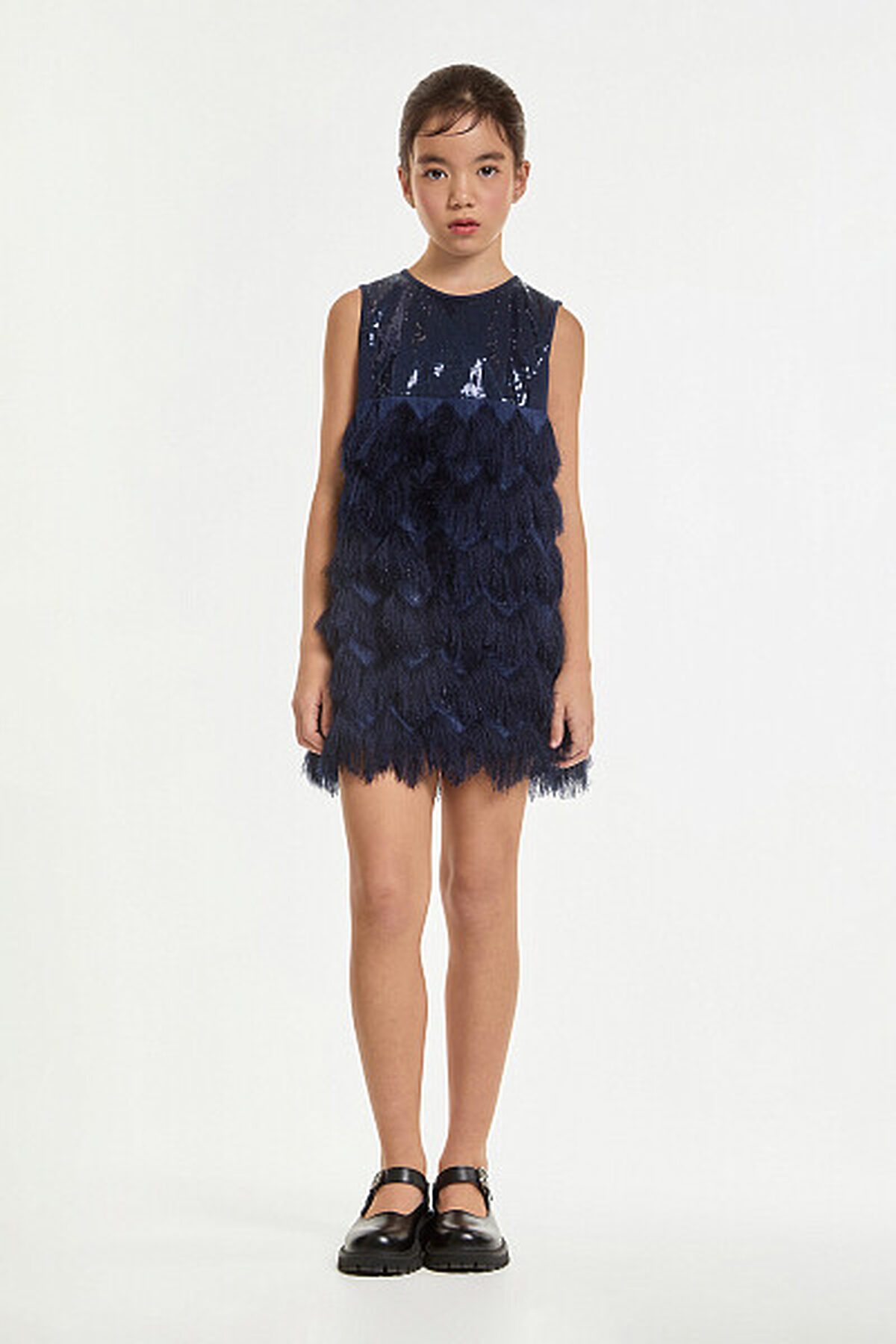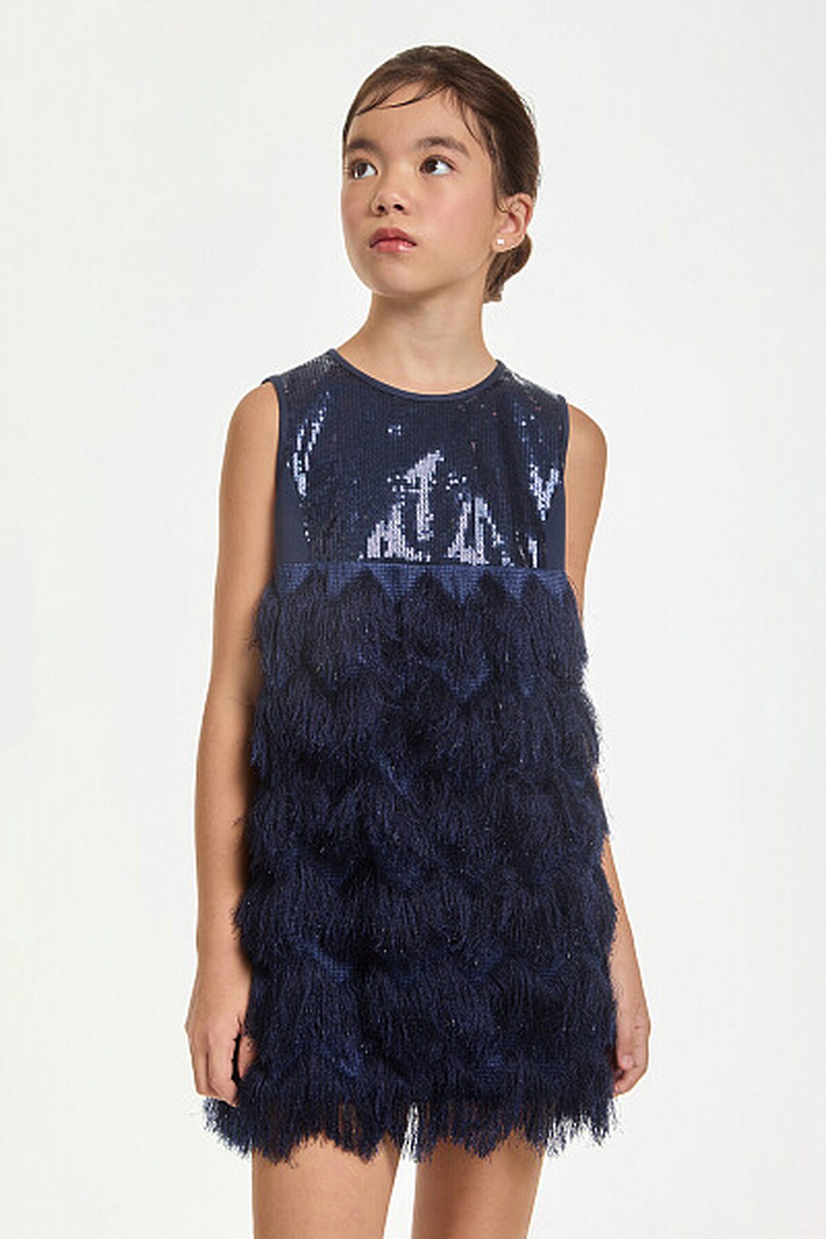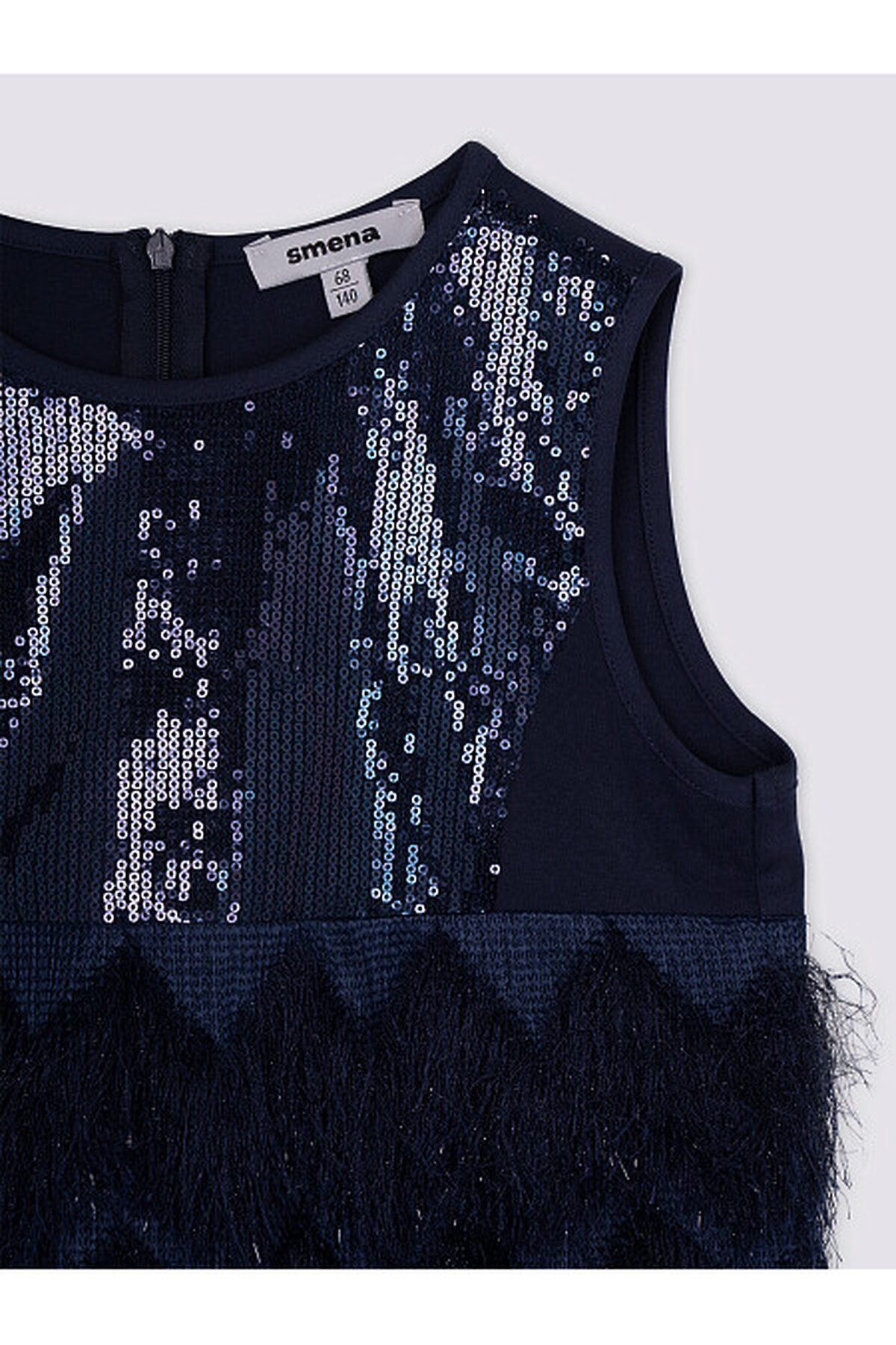 Платье с Высокой линией талии без рукавов. Верх трикотажного лифа украшают блестящие пайетки. Лиф облегает фигуру, создавая полуприталенный силуэт, который плавно расширяется к низу. Особенного внимания заслуживает юбка: она выполнена из ткани с длинным ворсом. Такой материал придаёт изделию дополнительную фактурность и необычность. Для обеспечения комфорта внутренняя часть юбки имеет приятную на ощупь подкладку из хлопка.