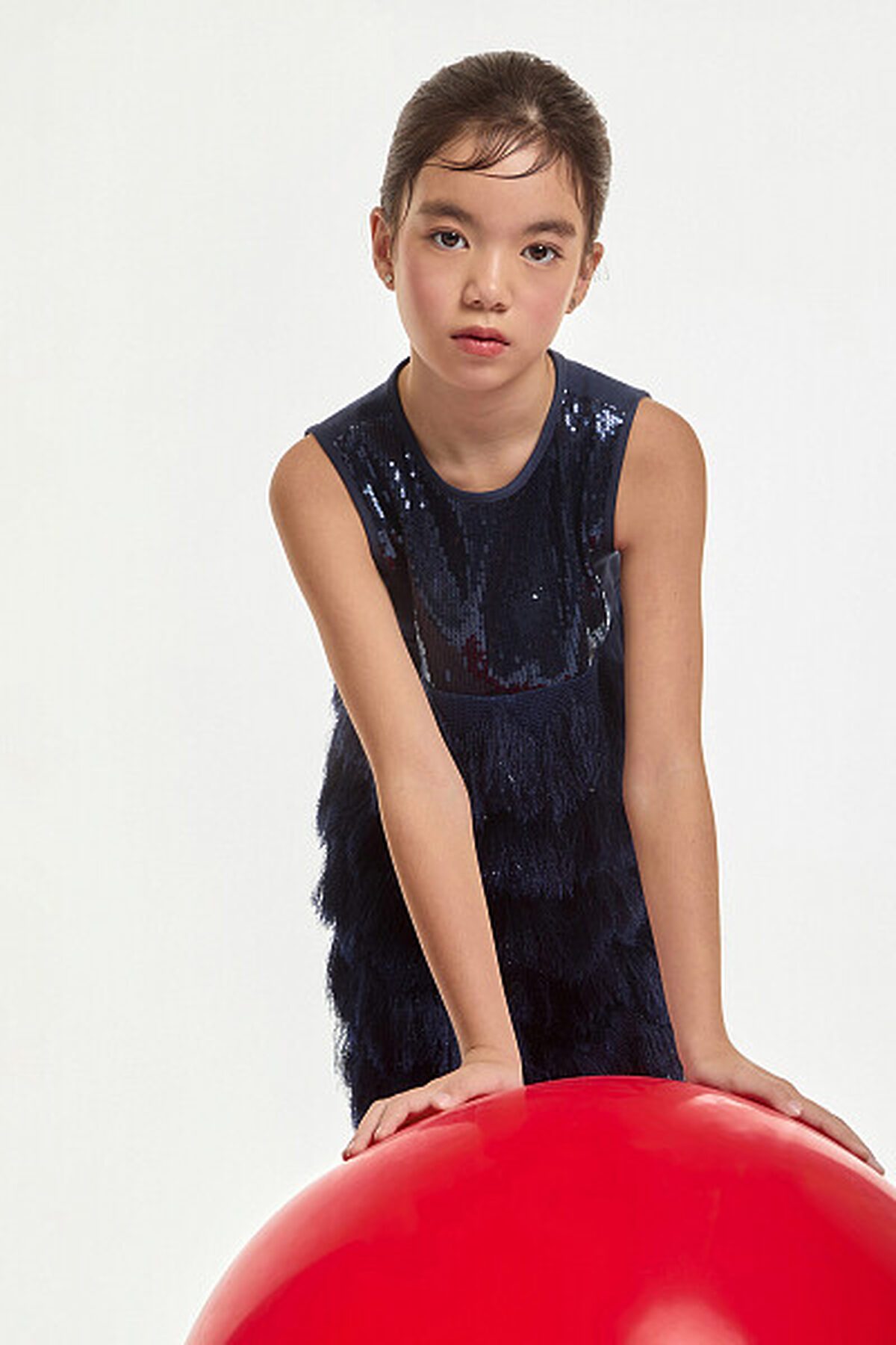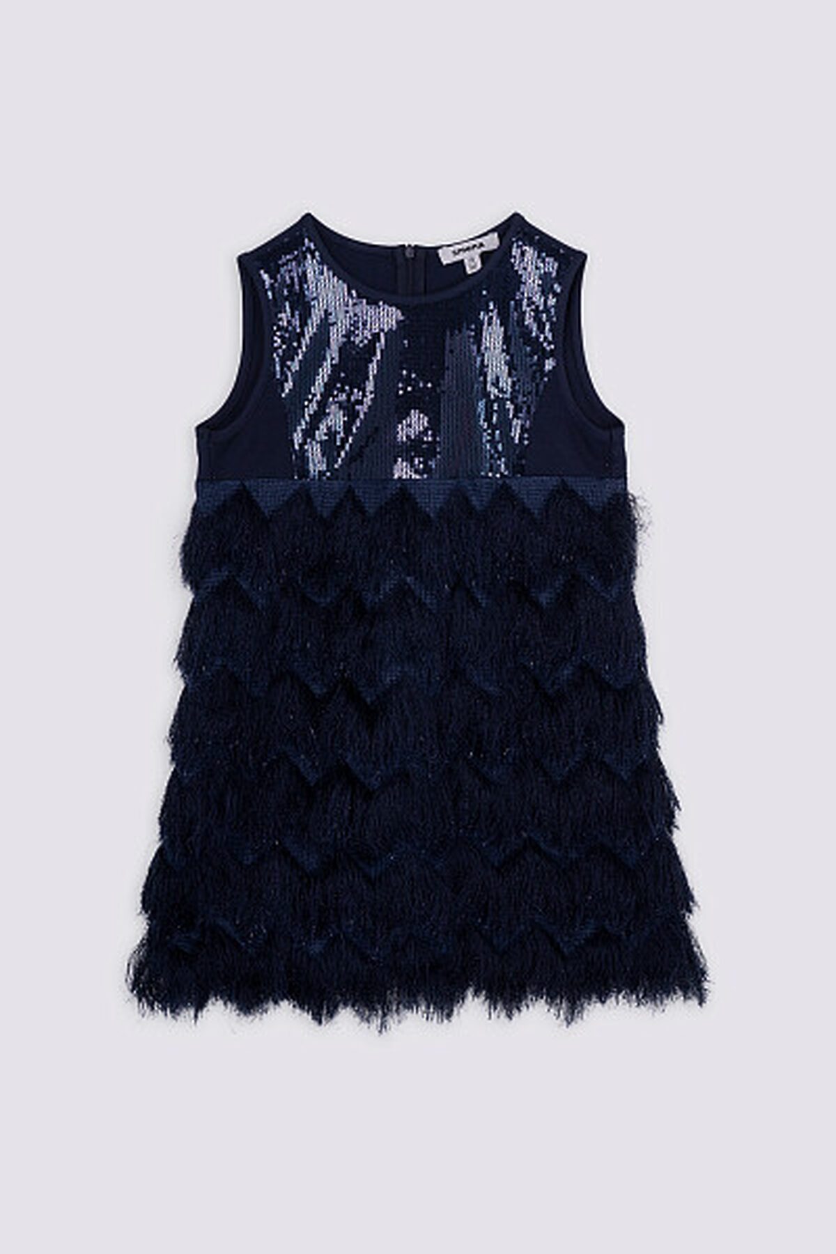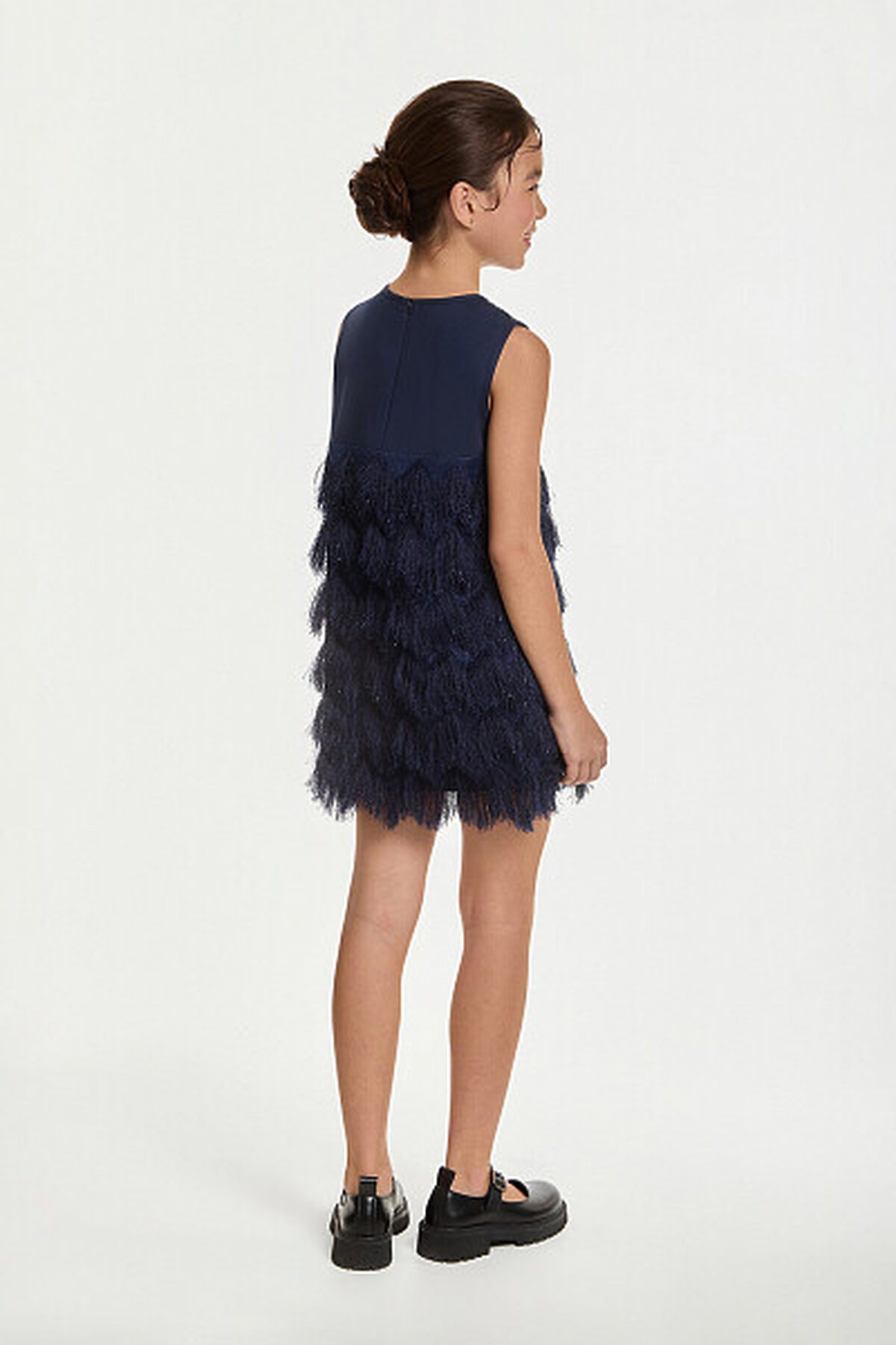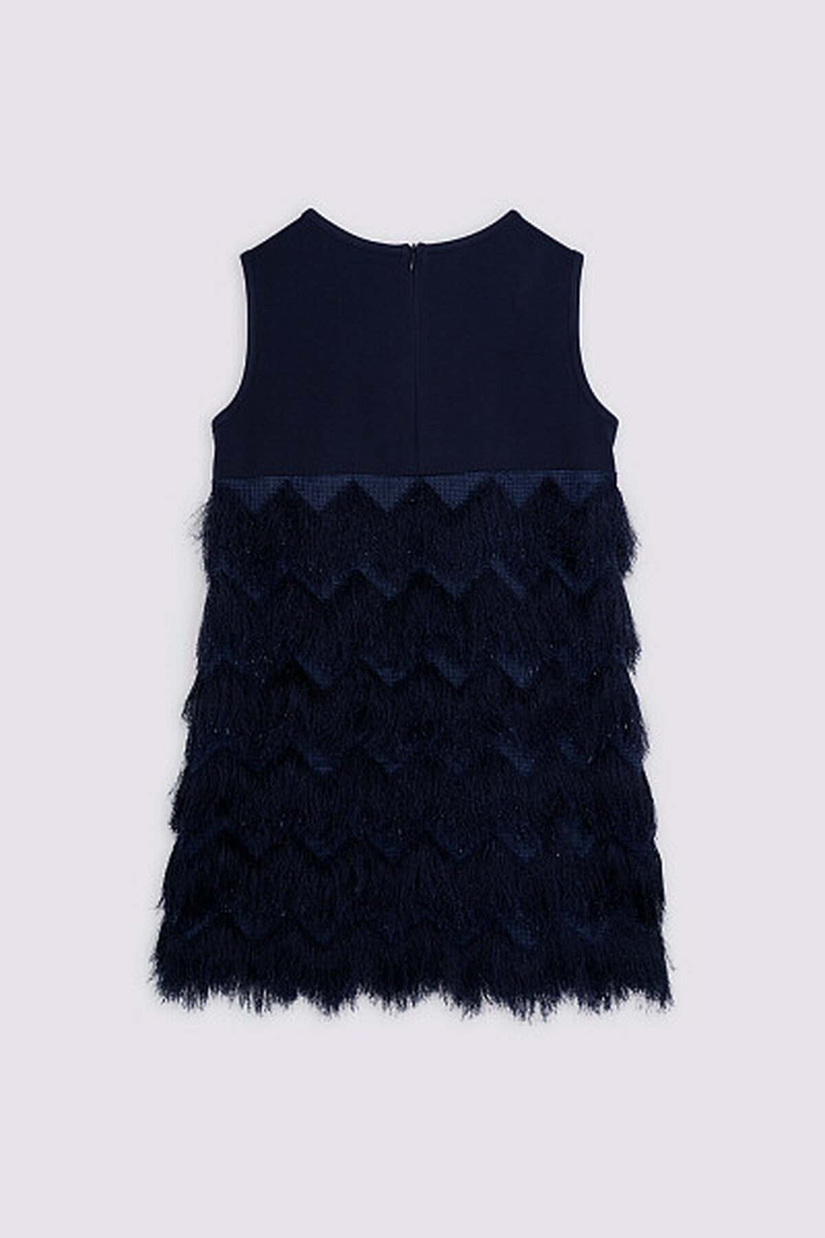 Платье с Высокой линией талии без рукавов. Верх трикотажного лифа украшают блестящие пайетки. Лиф облегает фигуру, создавая полуприталенный силуэт, который плавно расширяется к низу. Особенного внимания заслуживает юбка: она выполнена из ткани с длинным ворсом. Такой материал придаёт изделию дополнительную фактурность и необычность. Для обеспечения комфорта внутренняя часть юбки имеет приятную на ощупь подкладку из хлопка.