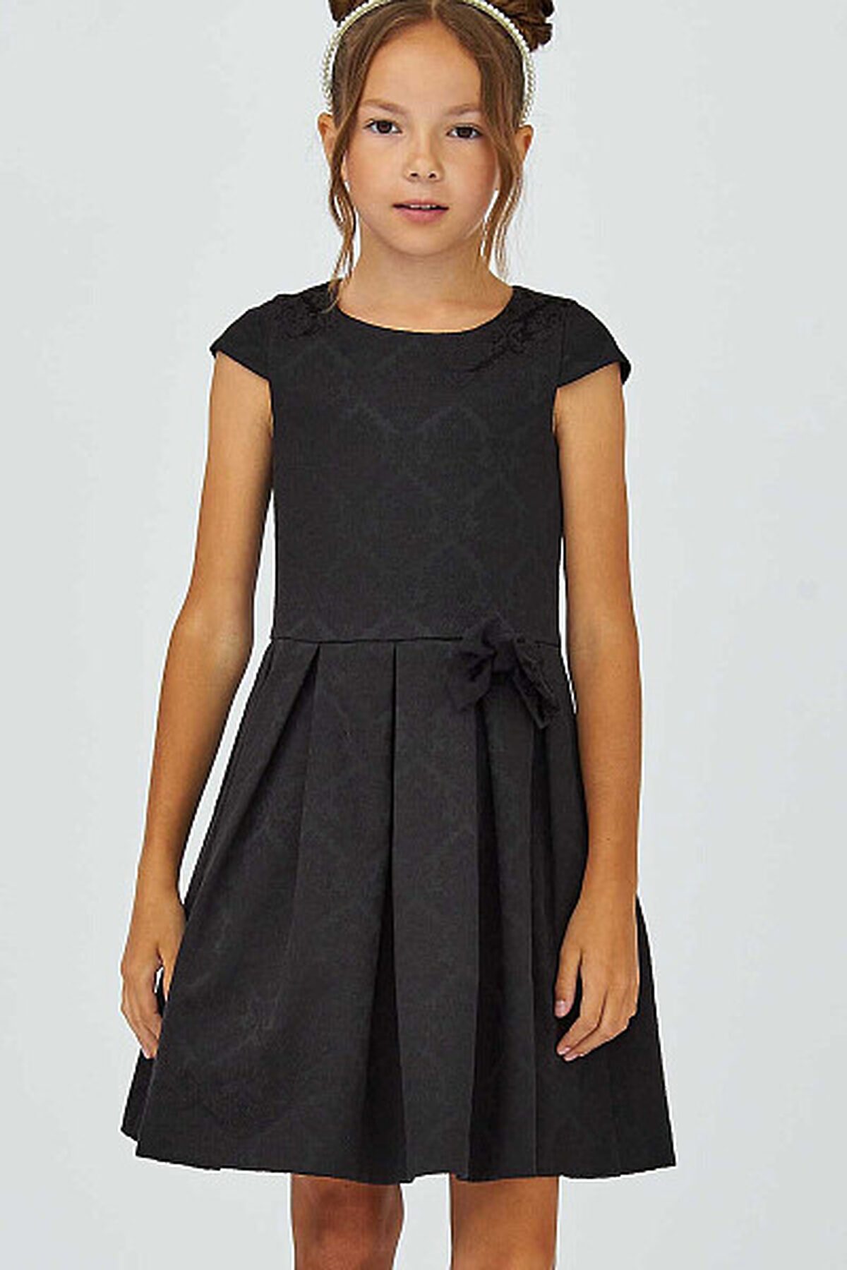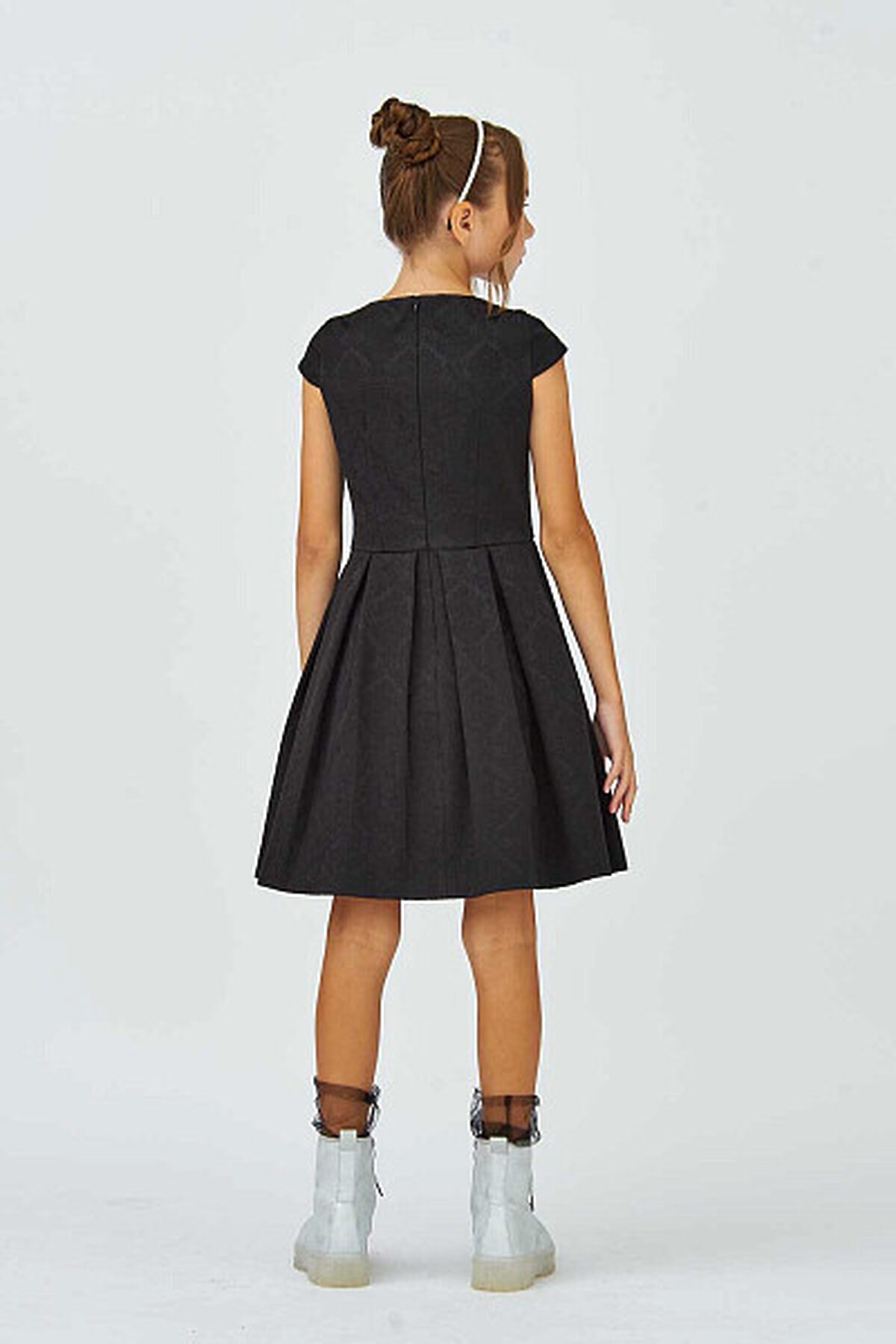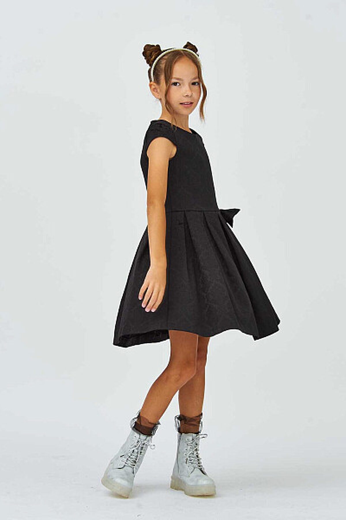 Платье из жаккарда с короткими рукавами и пышной юбкой со встречными складками. Нижняя юбка с жесткой сеткой выполнена на кокетке из хлопка. Платье дополнено съёмным бантом. Застежка по спинке на потайную молнию. Подкладка из хлопка.