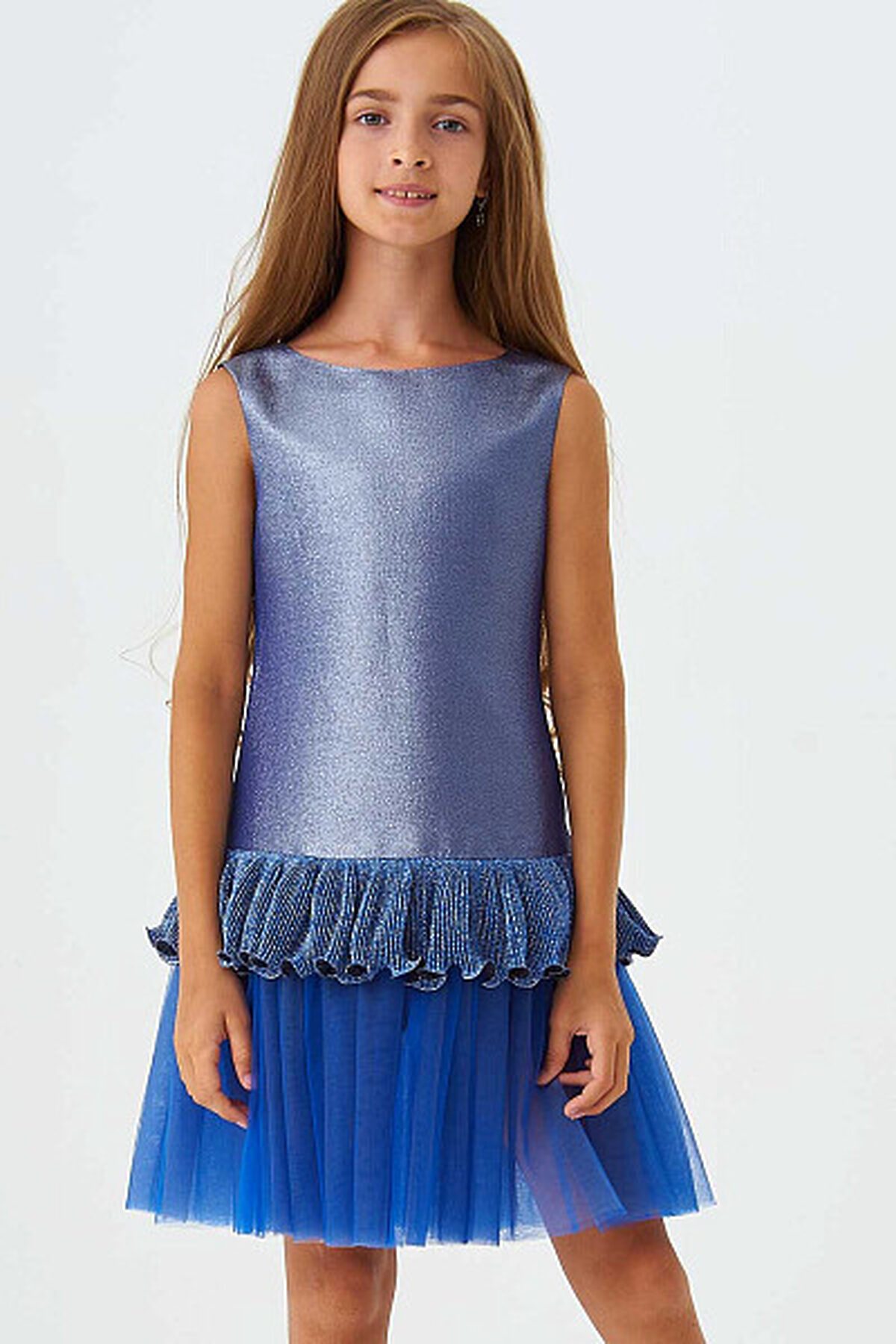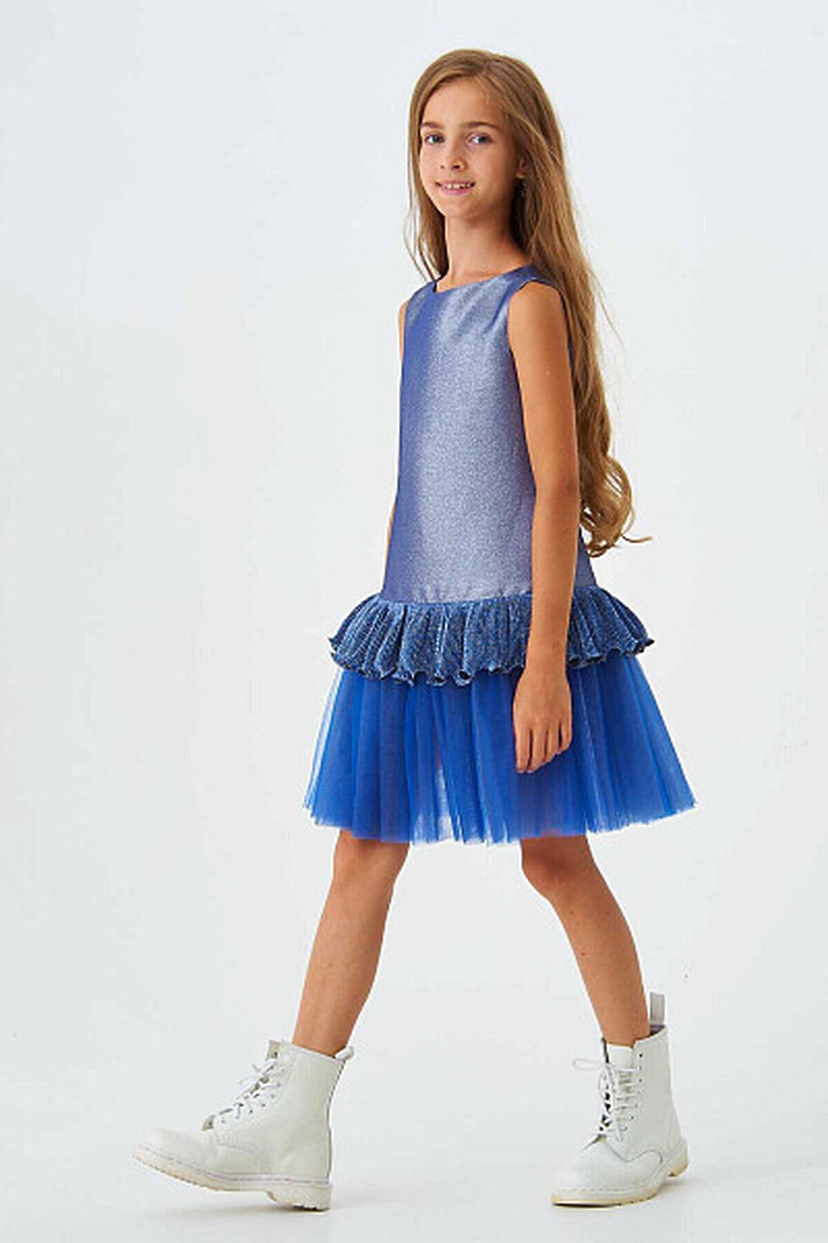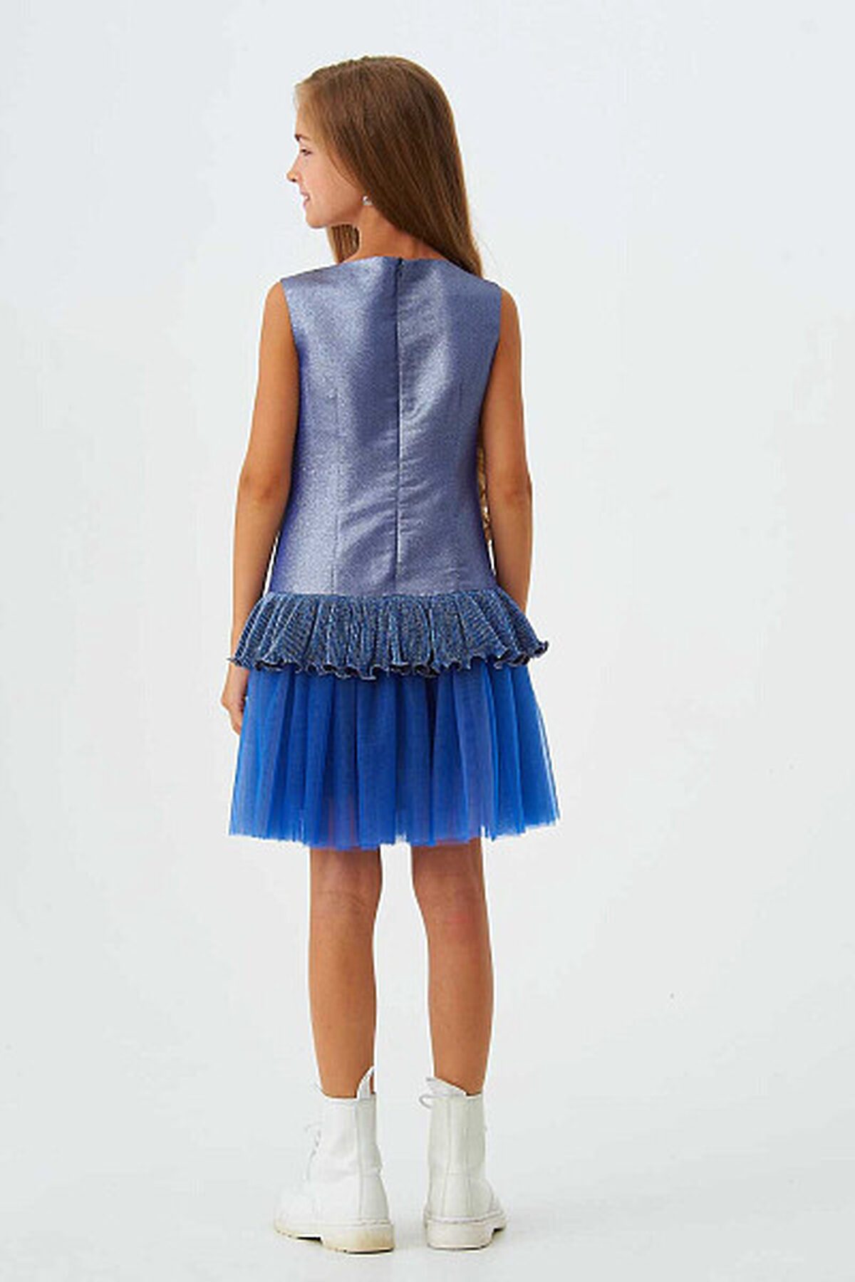 Платье прямого силуэта с заниженной линией талии из крепового жаккарда с люрексом. По низу изделия выполнена юбка из трёх слоев сетки со сборкой. Узкая оборка из ткани гофре дополняет верх юбки. Застежка по спинке на потайную молнию. Подкладка из хлопка.