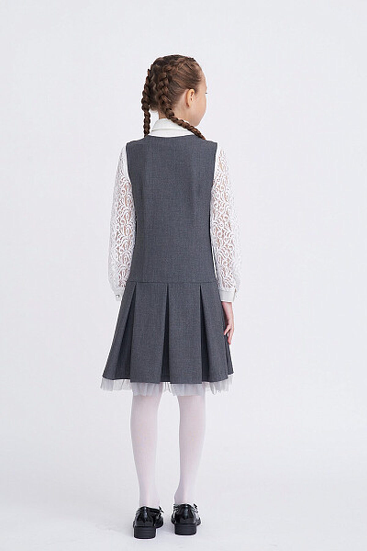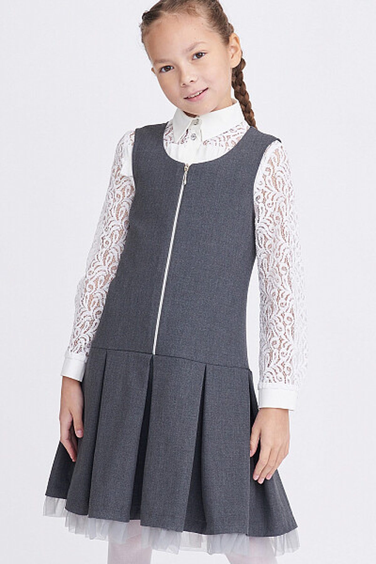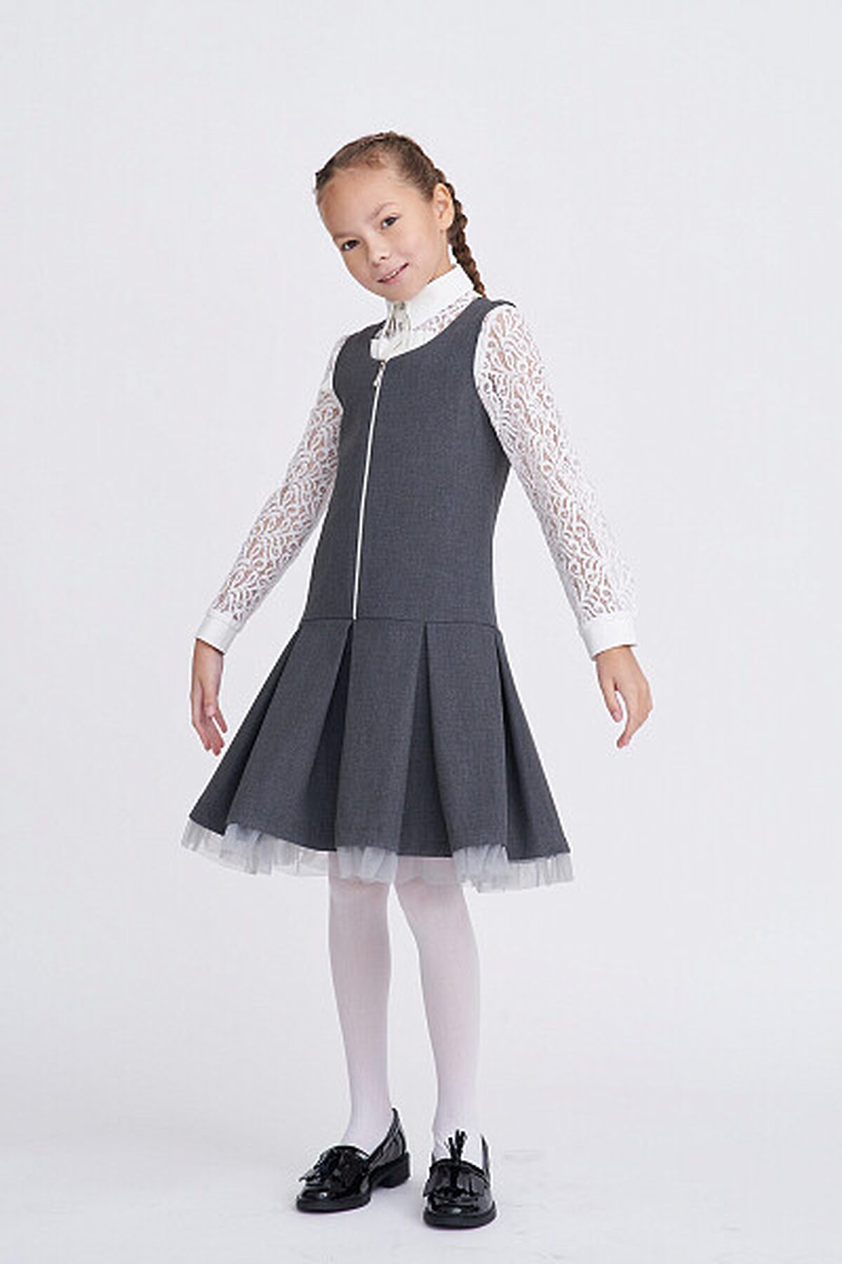 Элегантный сарафан в романтическом стиле из износостойкой поливискозы, отрезной по линии талии с юбкой со встречными складками. Застежка на молнию по центру передней панели. Низ юбки украшен кружевом с фестонами. На спинке талиевые вытачки. Отличный вариант на каждый день.