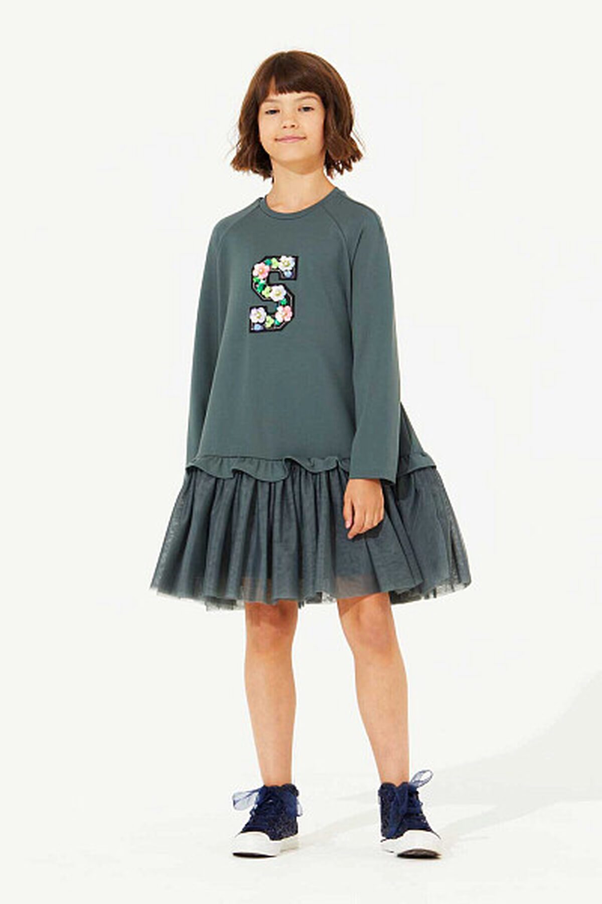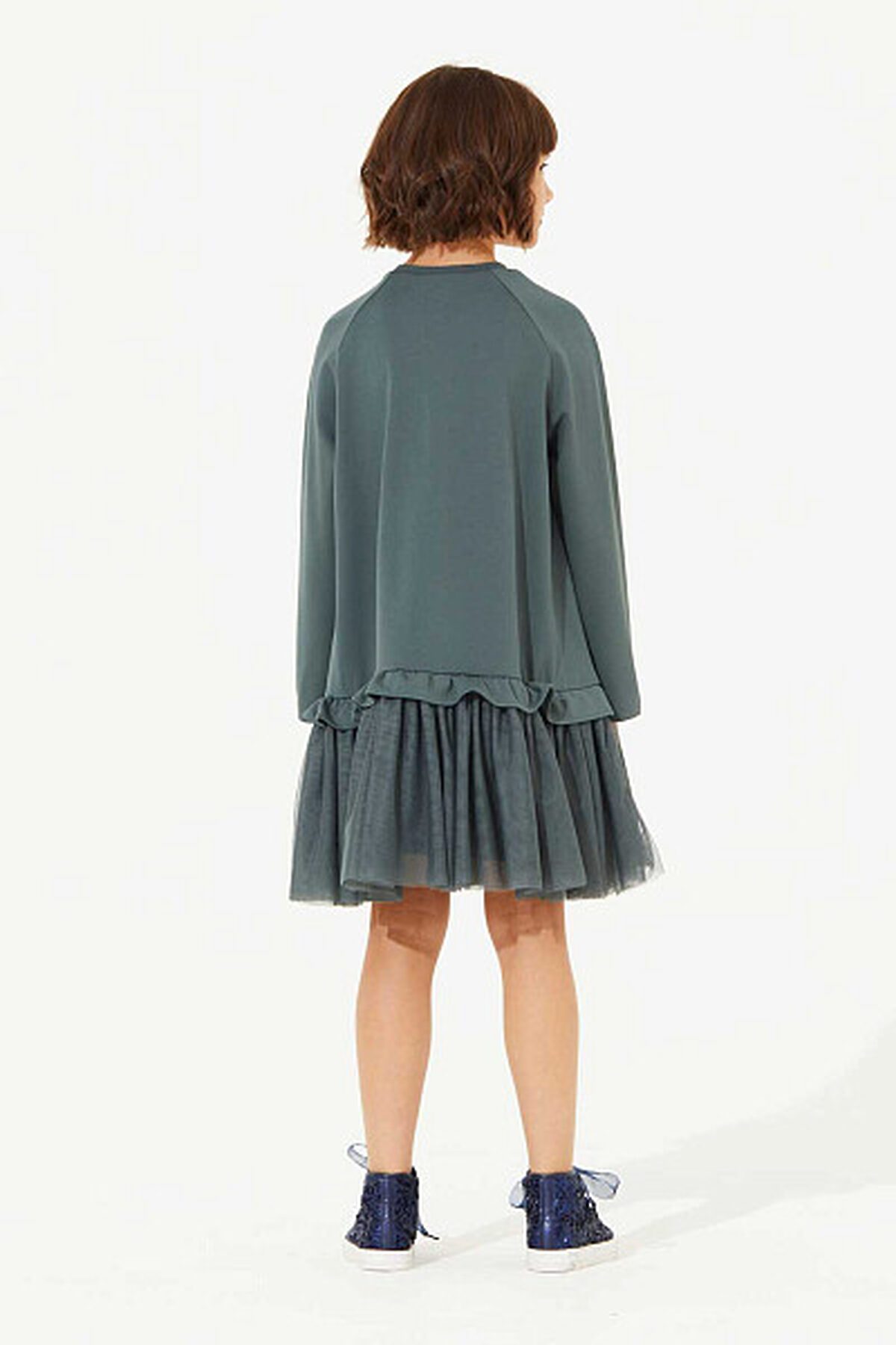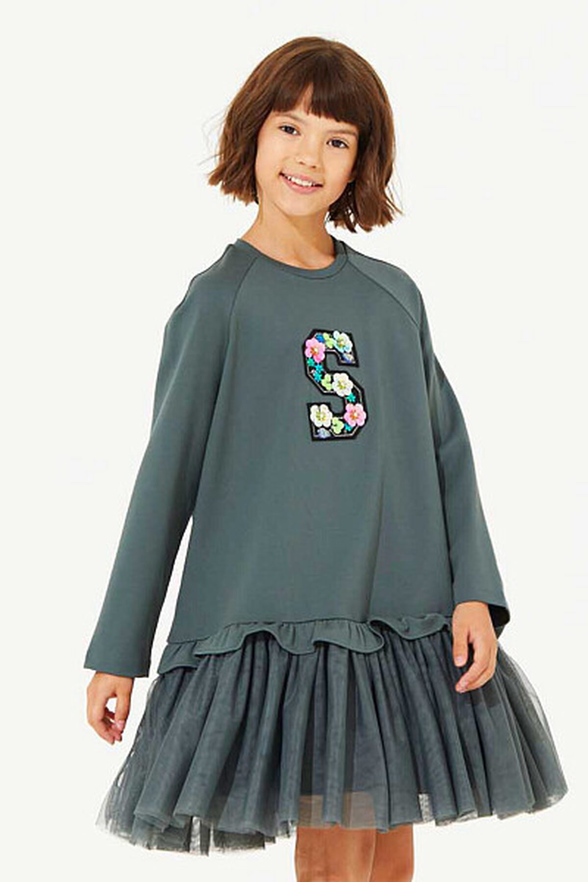Платье выполнено из высококачественного трикотажного полотна, которое прекрасно тянется и сохраняет форму. В составе материала сочетаются искусственные и синтетические волокна, что делает его прочным и долговечным. Оно имеет стильный дизайн и идеально подходит для повседневной носки. Перед и спинка цельные, а по центру переда настрочена оригинальная нашивка. Юбка состоит из нескольких слоев: подкладка, три юбки из сетки и оборка из трикотажного материала. Такое платье станет любимым элементом гардероба каждой старшеклассницы.