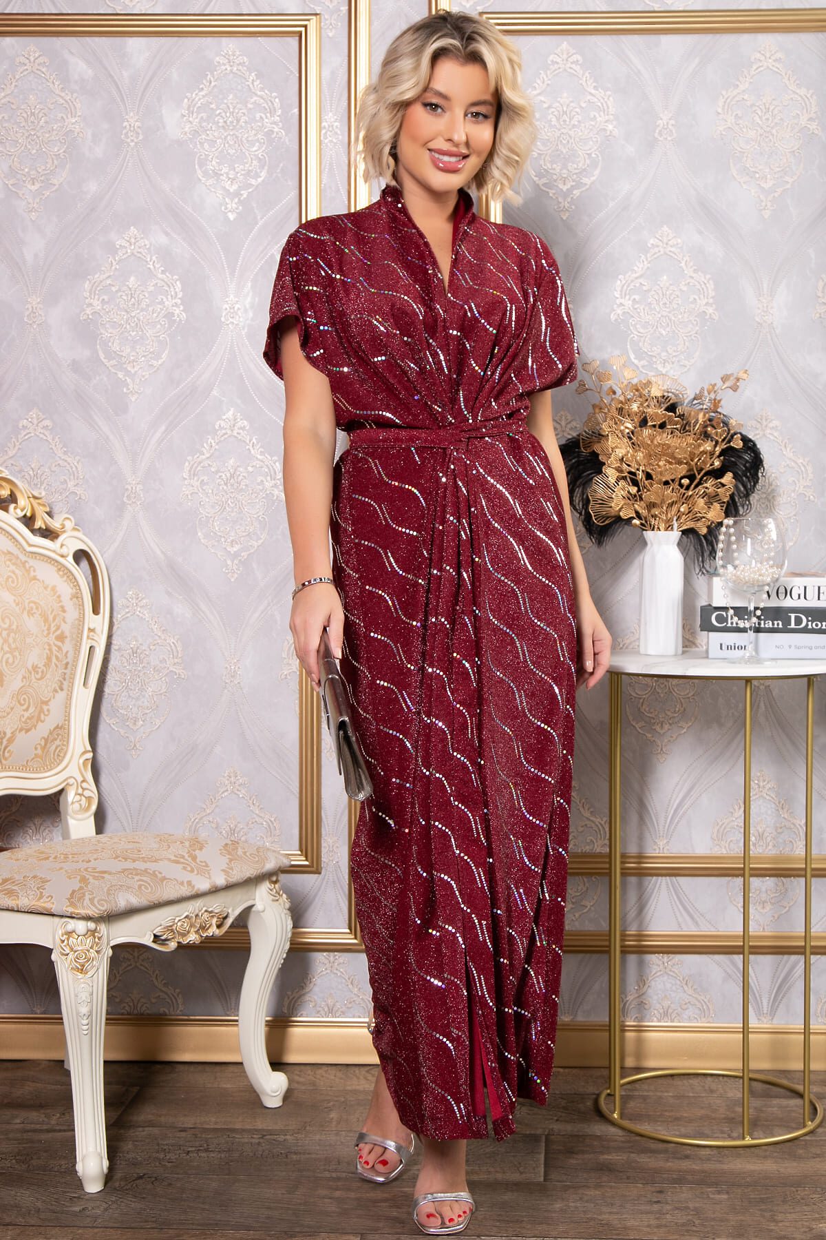 Погрузитесь в элегантность с нашим макси-платьем в бордовом цвете с металлизированным узором, которое станет идеальным дополнением вашего гардероба! V-образный вырез с небольшой стойкой сзади подчеркивает шею и создает утонченный образ. Спущенный рукав придает платью легкость и непринужденность, обеспечивая комфорт в течение всего дня. Пояс вставлен по талии, который можно завязывать с имитацией узла, позволяя регулировать силуэт по своему вкусу. Разрез спереди подола добавляет нотку игривости и делает платье более динамичным, позволяя свободно двигаться. С этим макси-платьем вы будете выглядеть стильно и уверенно на любом событии!