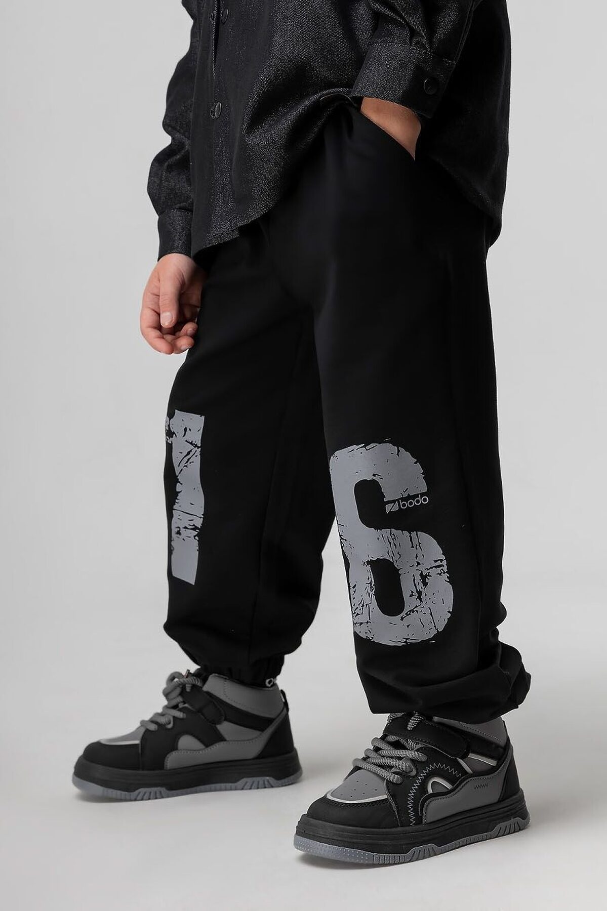 Свободные брюки на поясе с внутренней резинкой. Низ брюк с манжетой на резинке. Брюки с боковыми карманами. Брюки с принтом "16"