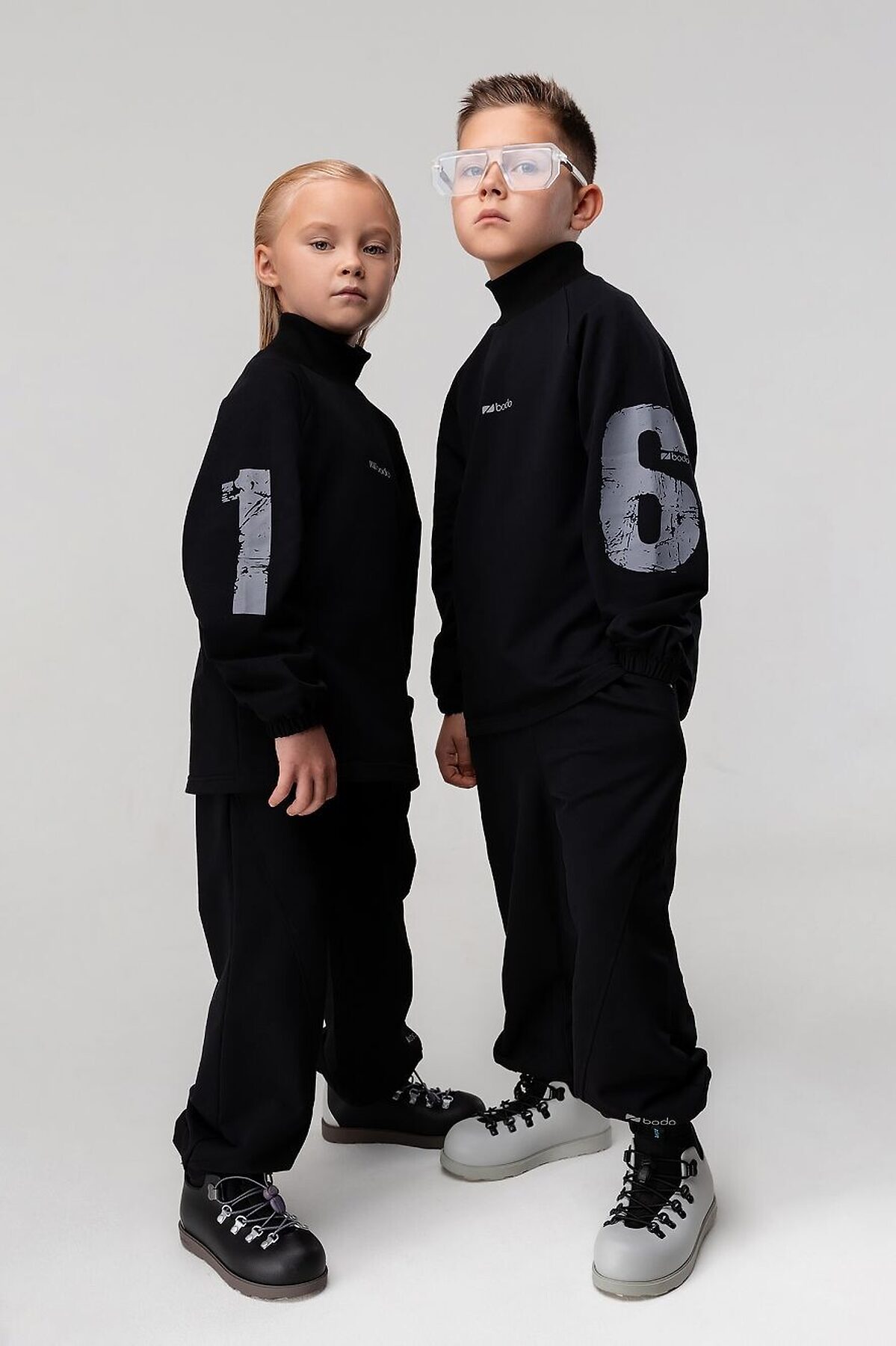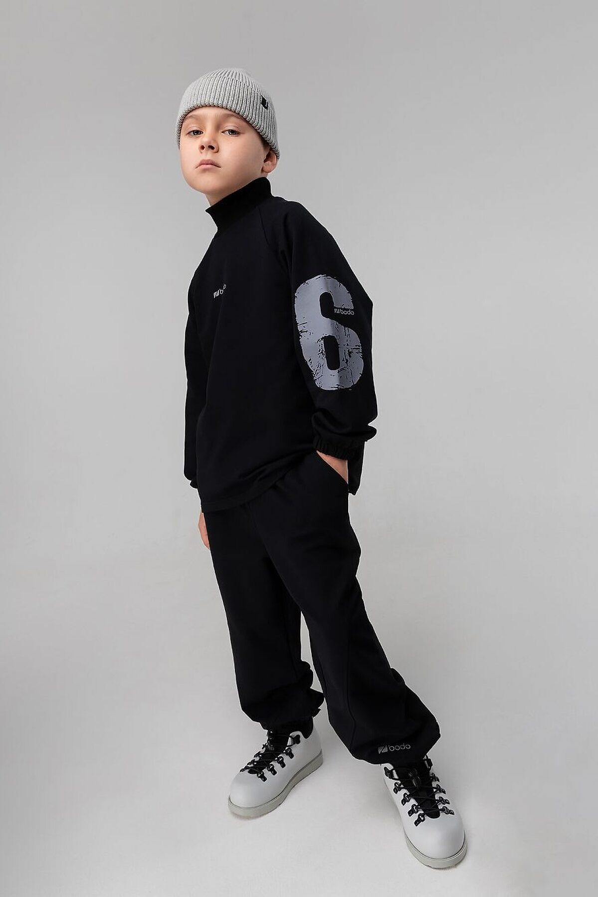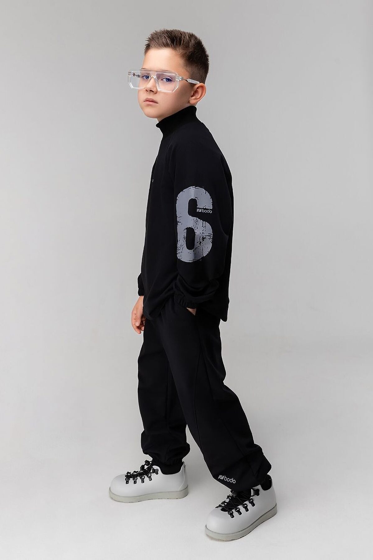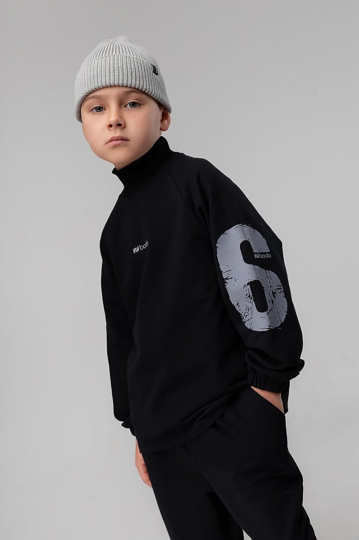 Толстовка свободного силуэта с рукавом на манжете с резинкой. Воротник стойка (без отворота), низ изделия ровный. На рукавах расположен принт "16". Свободные брюки на поясе с внутренней резинкой. Низ брюк с манжетой на резинке. Брюки с боковыми карманами.