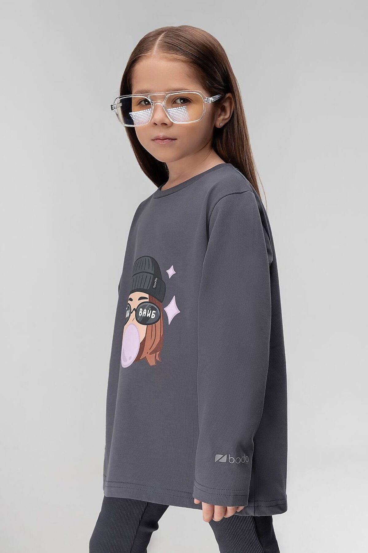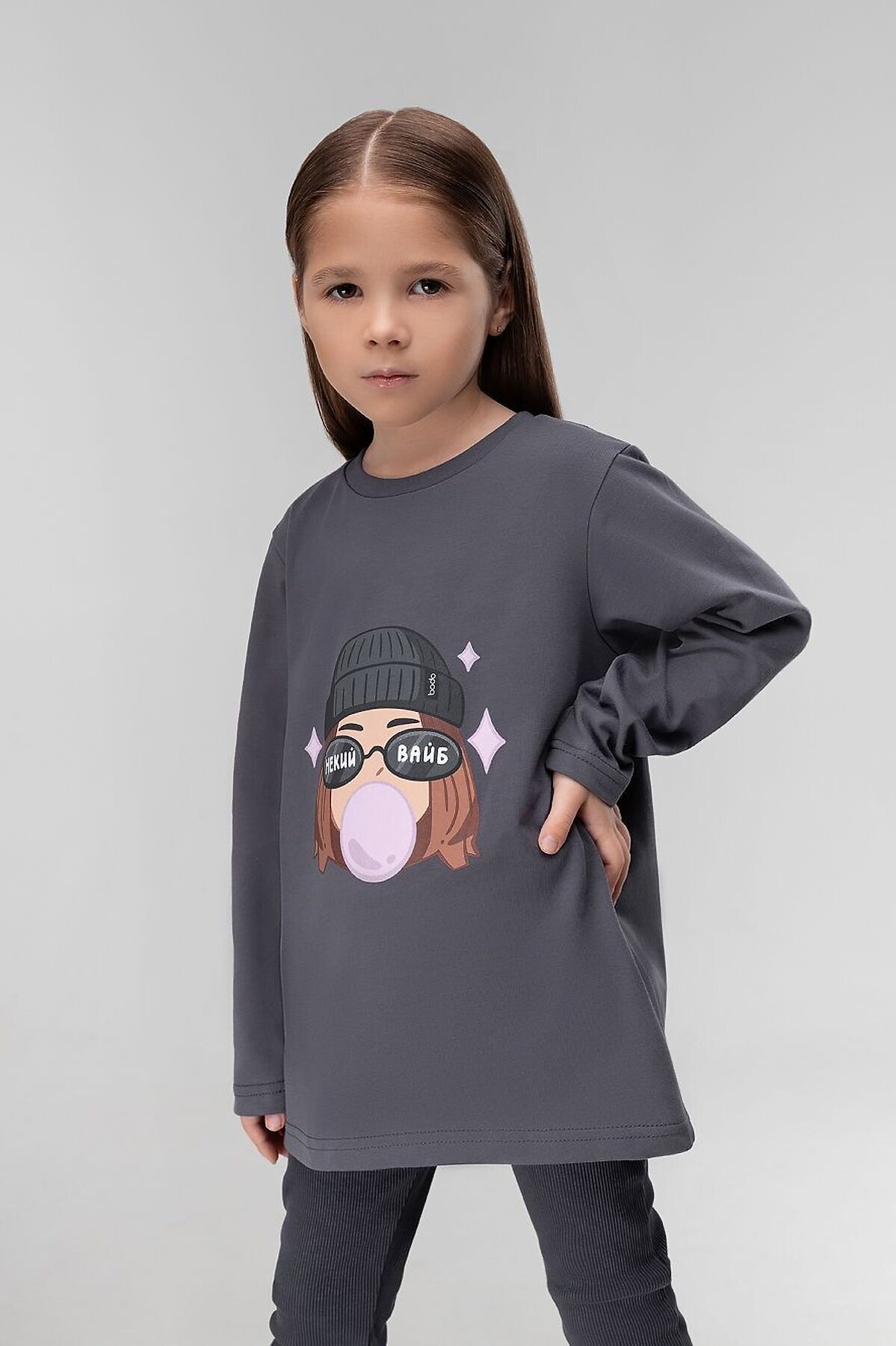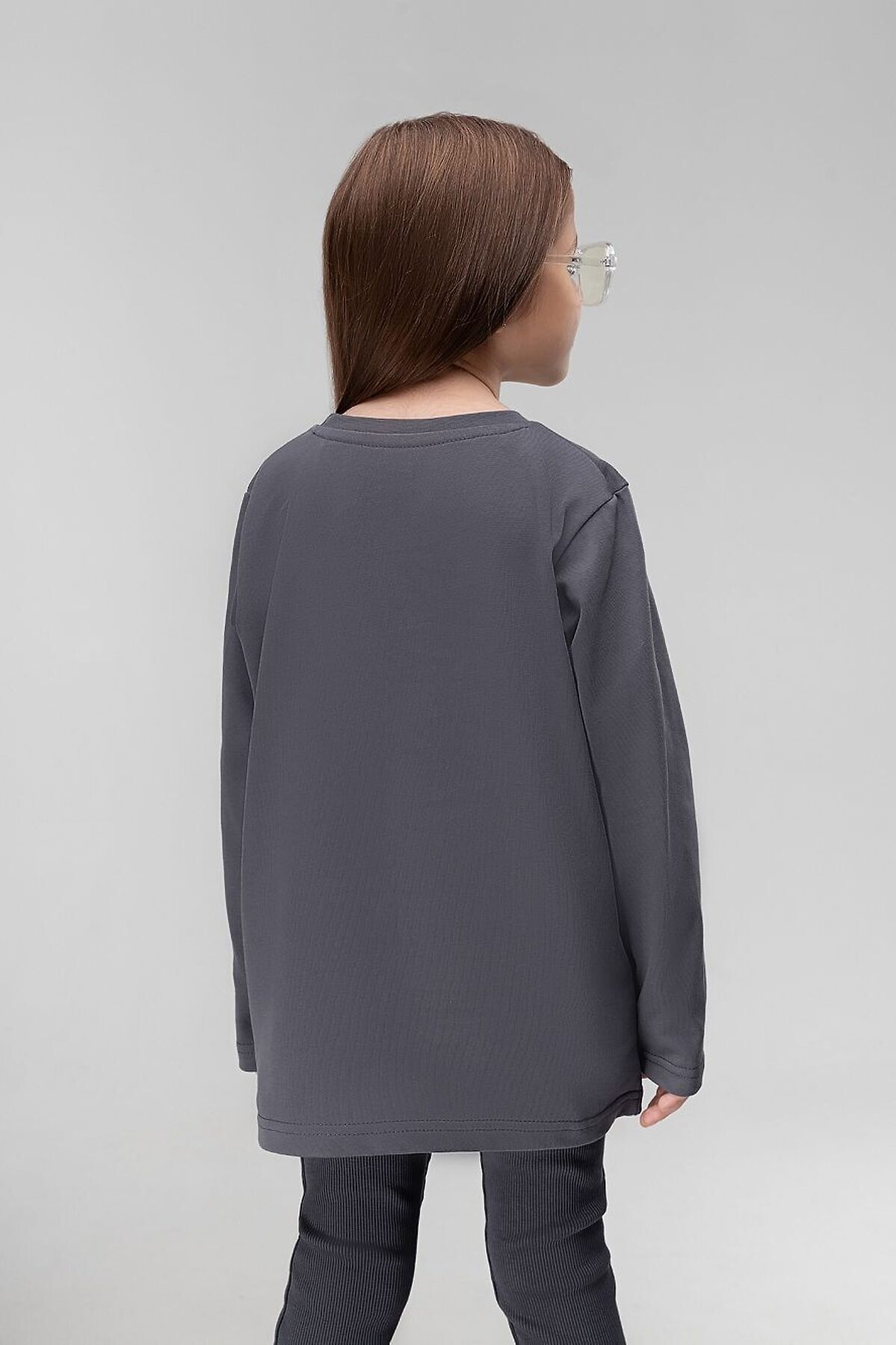 Лонгслив для детей дошкольного возраста. Лонгслив свободного силуэта с втачным длинным рукавом. Горловина лонгслива округлой формы. Низ изделия прямой.