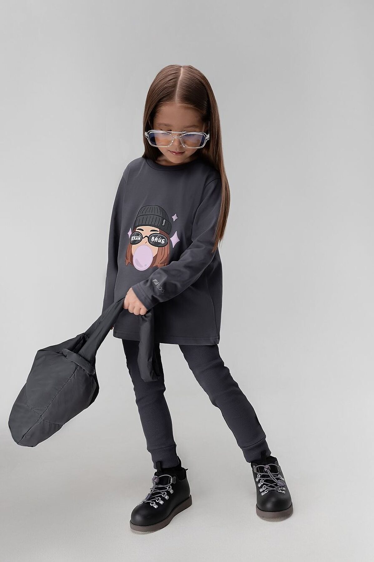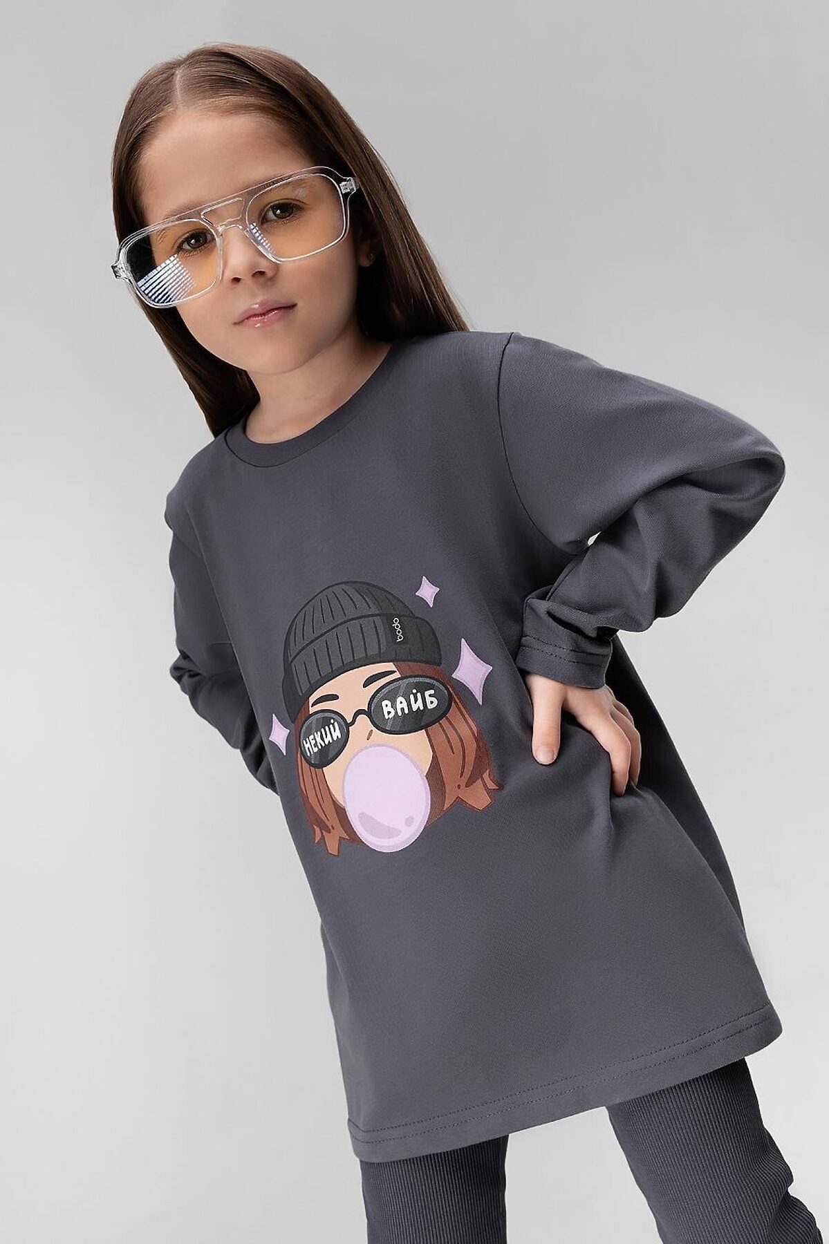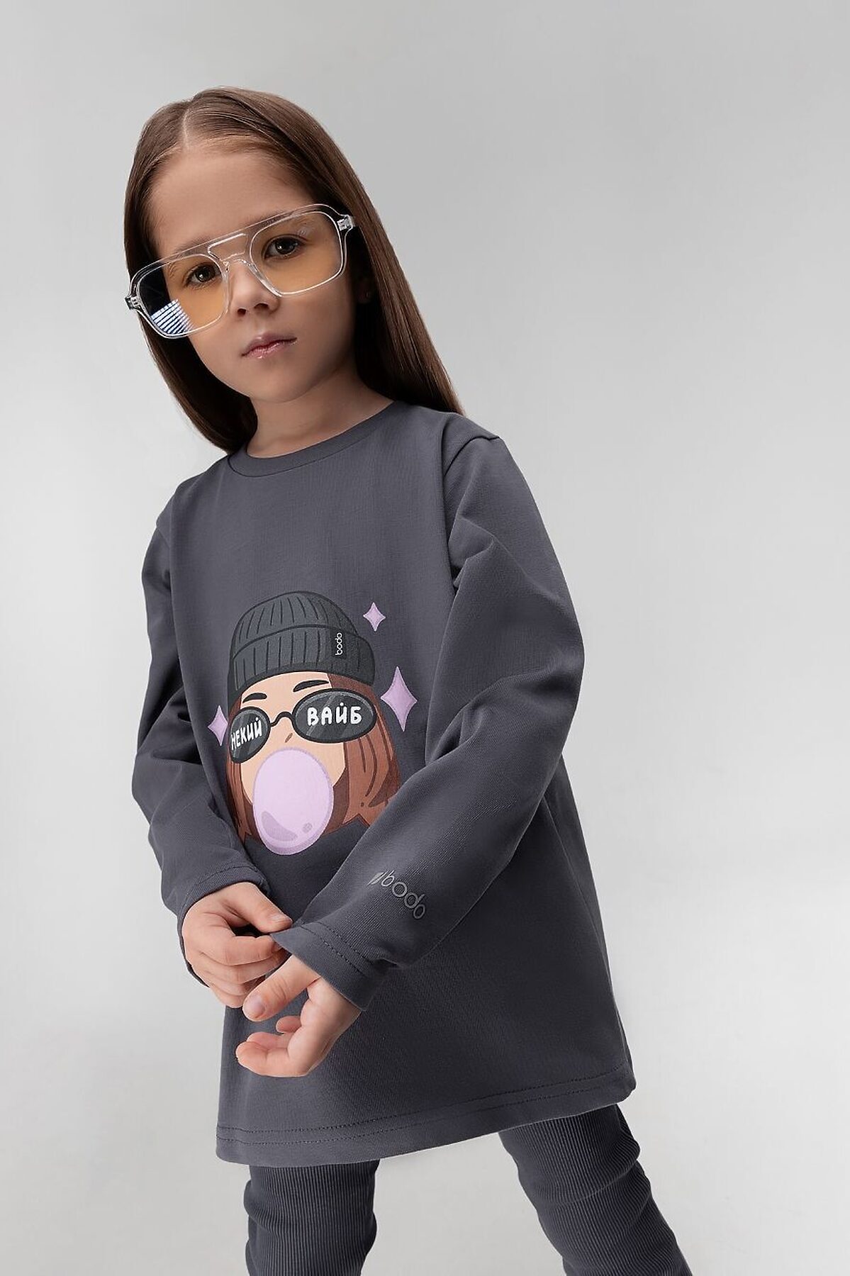 Лонгслив для детей дошкольного возраста. Лонгслив свободного силуэта с втачным длинным рукавом. Горловина лонгслива округлой формы. Низ изделия прямой.