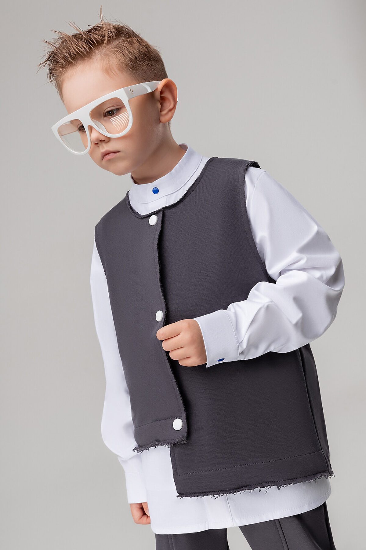 Свободный жилет с разной длиной полочек, без подкладки, на кнопках. Жилет с необработанными краями.