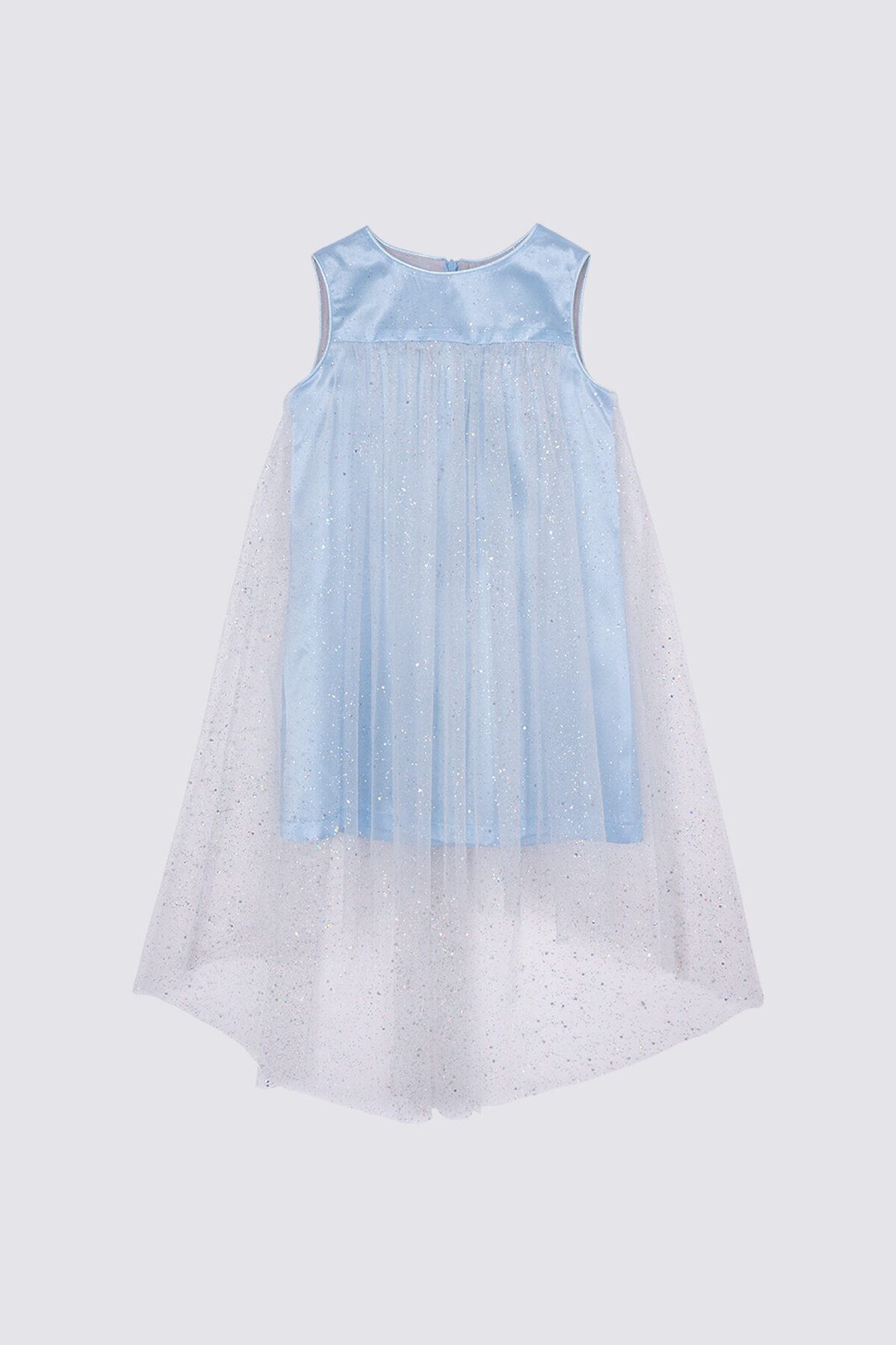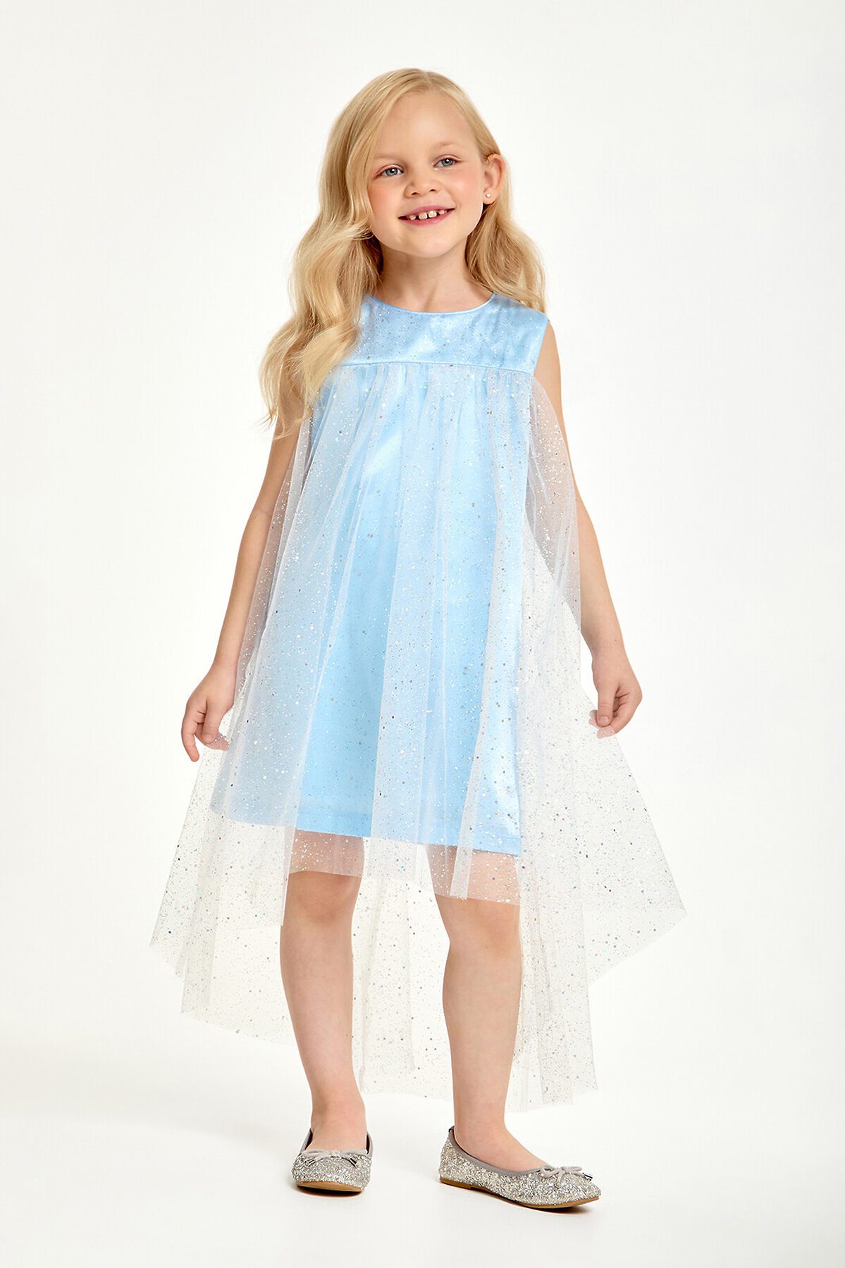 Нарядное платье А-силуэта с кокеткой на груди из гладкого атласа с подкладкой идеально подойдёт для особых случаев. Верх модели драпирован сеткой с блёстками, которая создаёт лёгкое сияние и праздничное настроение. Удлинённая спинка добавляет изысканности и подчёркивает элегантный силуэт.